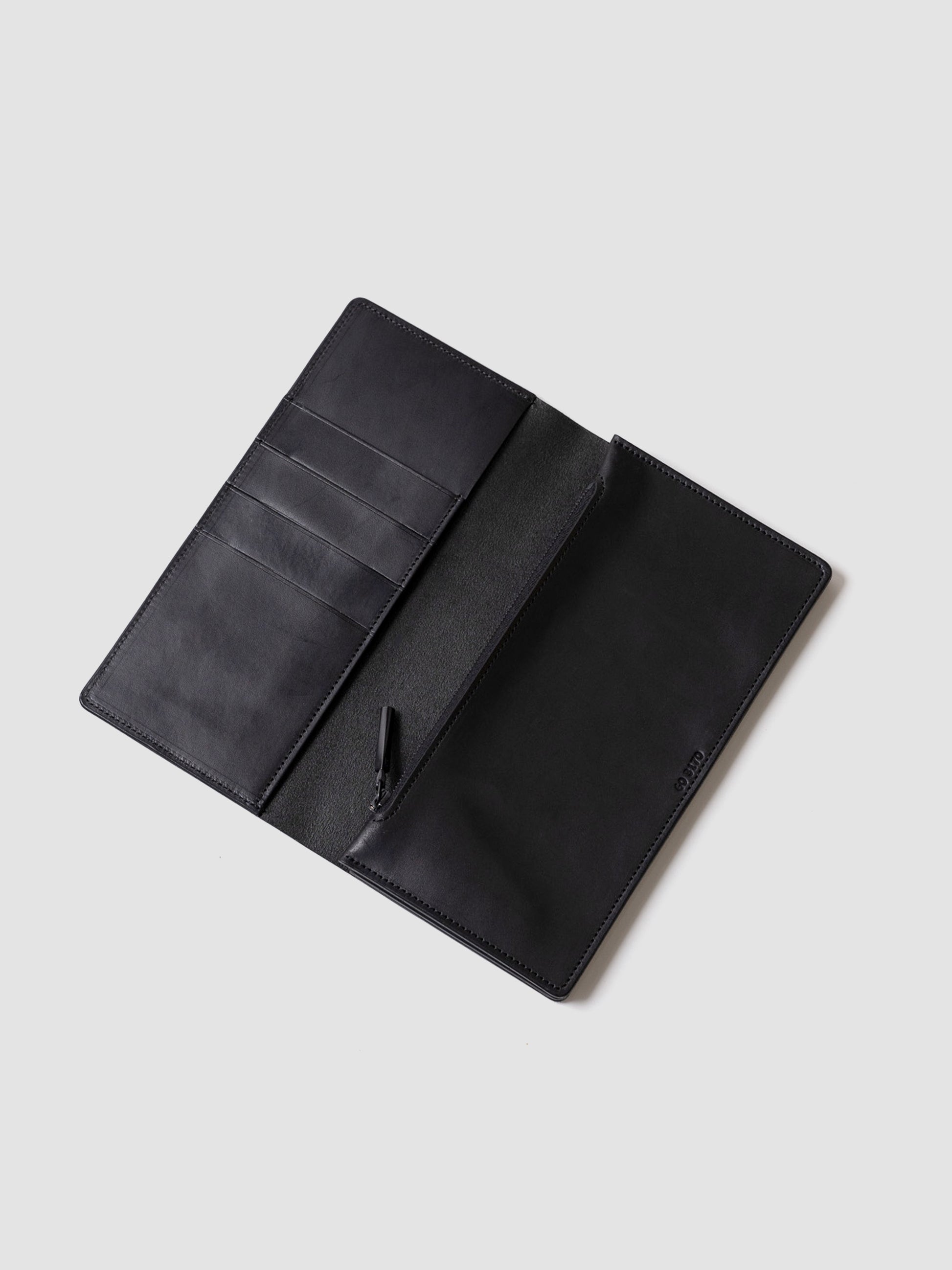 そんなイメージを損なわぬよう、モーションに特化させカード枚数を制限(使用頻度の高いクレジットと身分証以外が入っている事をナンセンスとの考え)、綺麗でシワのない領収書とお札、出し入れしやすいコインポケット。それらを快適にする蛇腹設計です。また、全長により厚みは薄くなる為、服のシルエットをわかりやすく阻害する事も少ないかと思います。