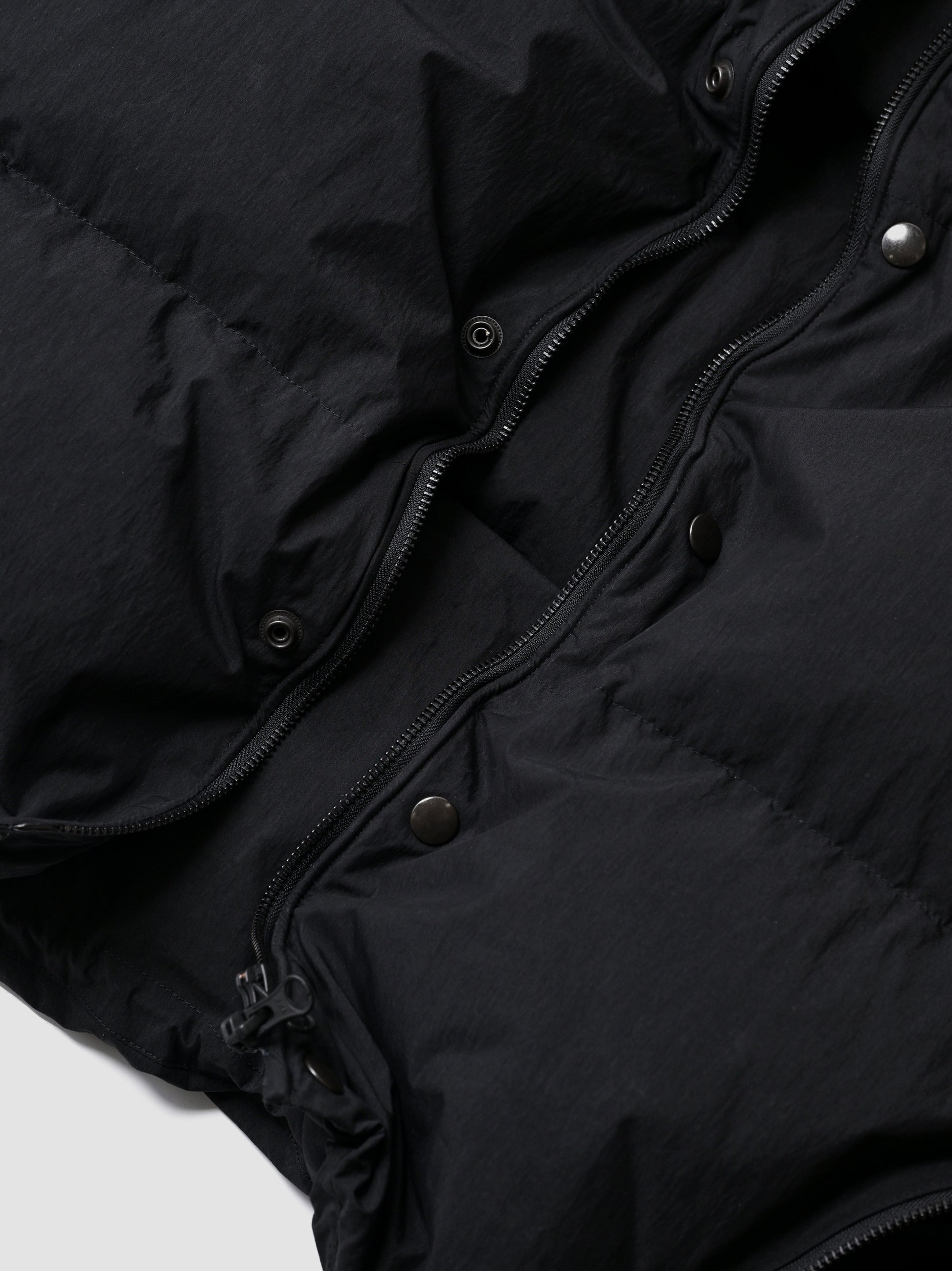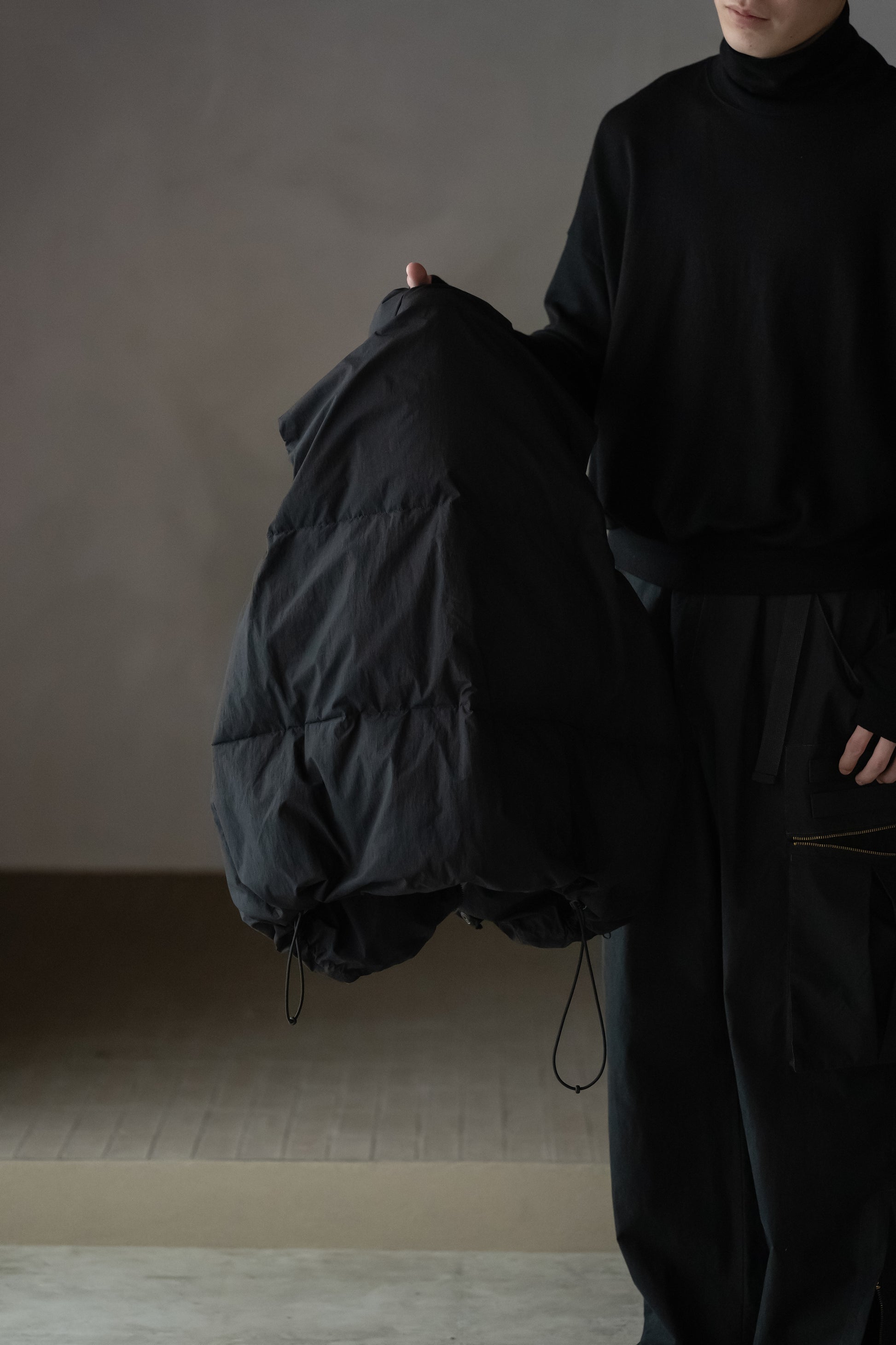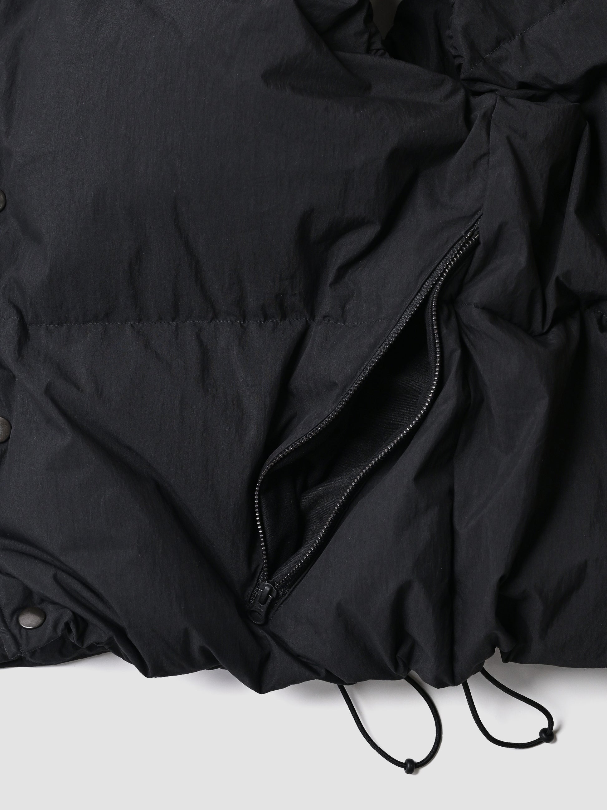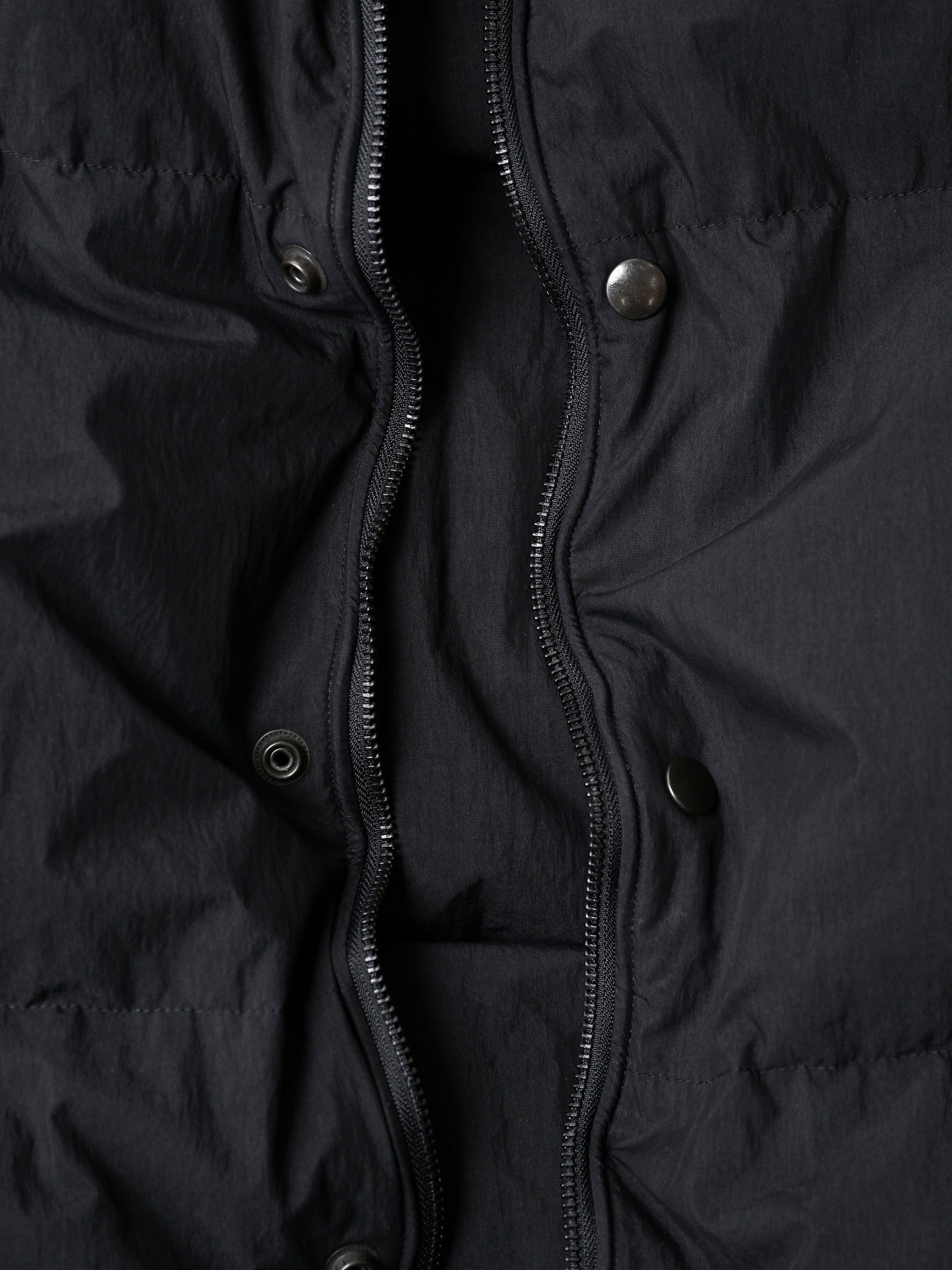 アームホールは内装にゴムが通っており、薄手、厚手の洋服と重ねても袖山が立たない様な作りになっており、裾は内側にストレッチコードとストッパーが配備され、ボリュームを調整可能。内ポケットもアクセスのしやすい縦型で配備されています。特徴的なフロントデザインは、ジップアップにドットボタン、ワイヤーによってフロントを自由自在に畝らせられる一癖あるboらしいディテール。オーセンティックなダウンベストの形状ながらも、モードっぽさと着回しにアレンジの出来る機動力ある仕上がりです。生地は表裏共生地で、薄手でナチュラルなシワ、適度なハリのある先染めのコットンナイロンです。