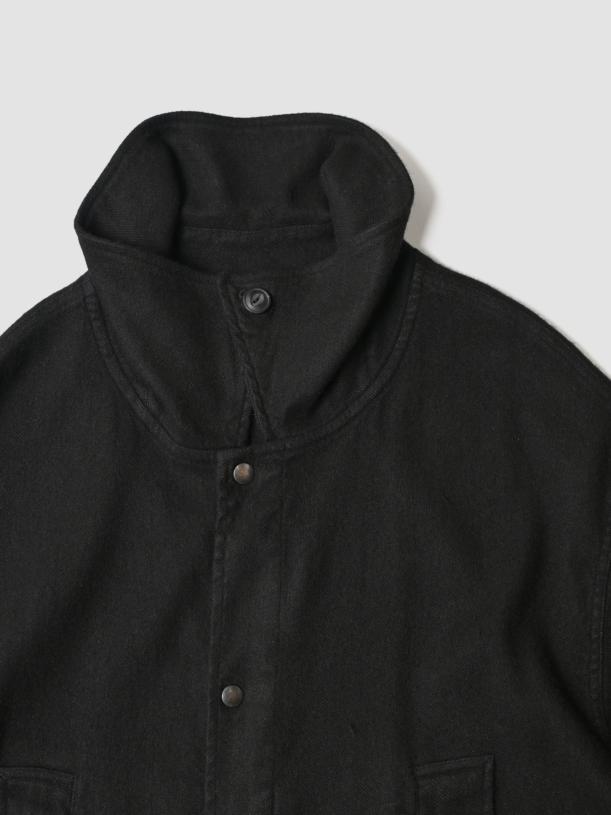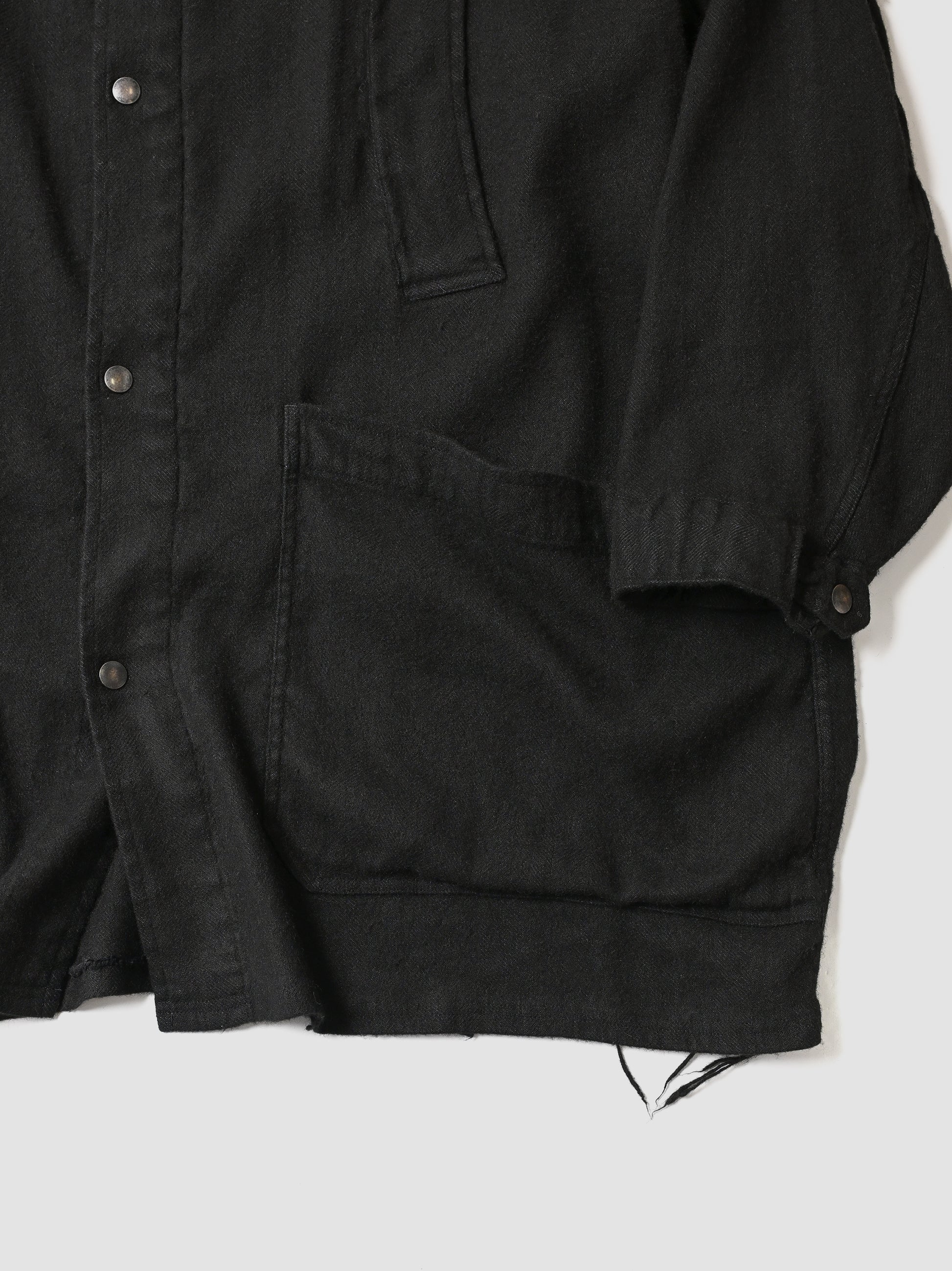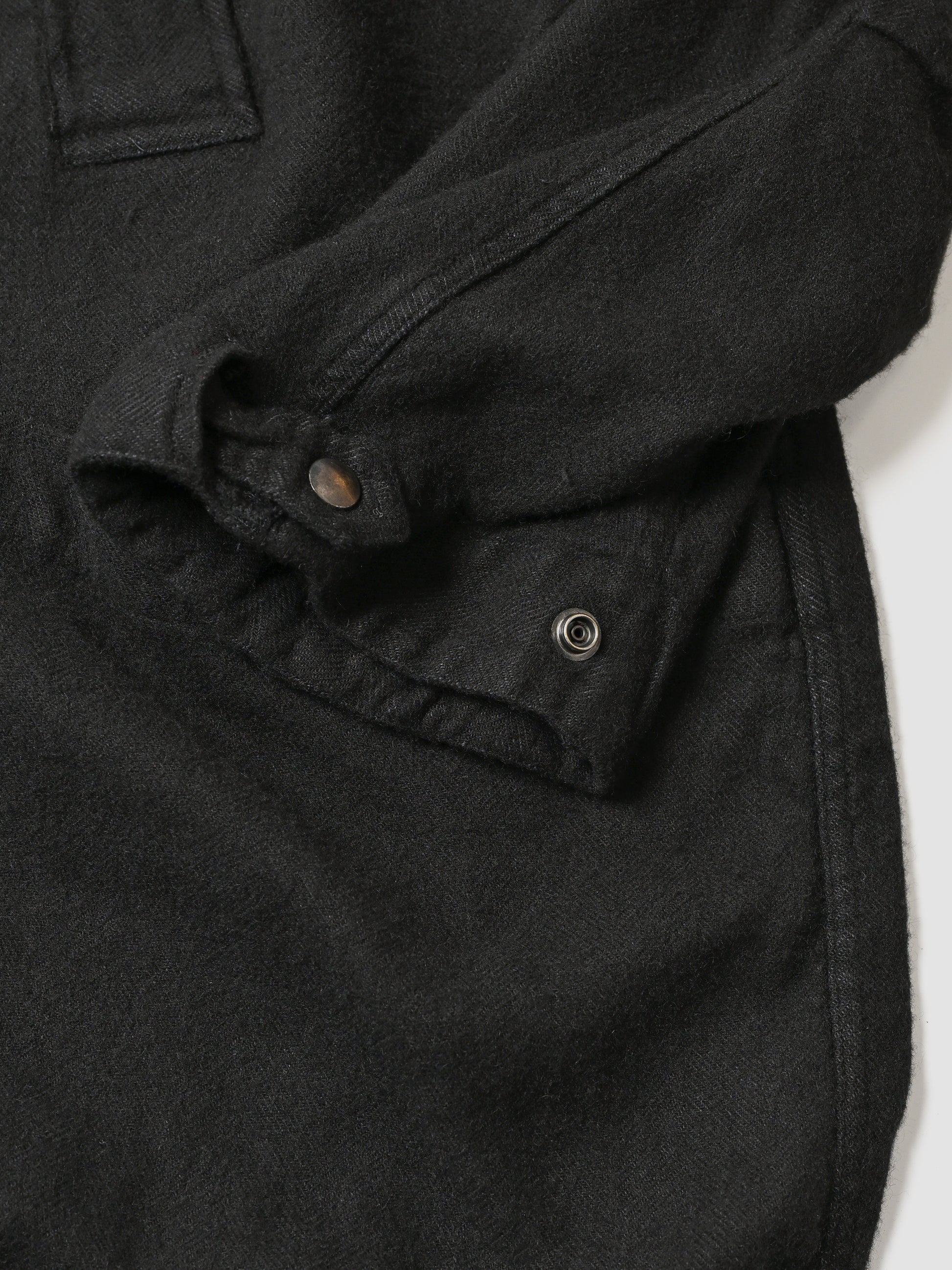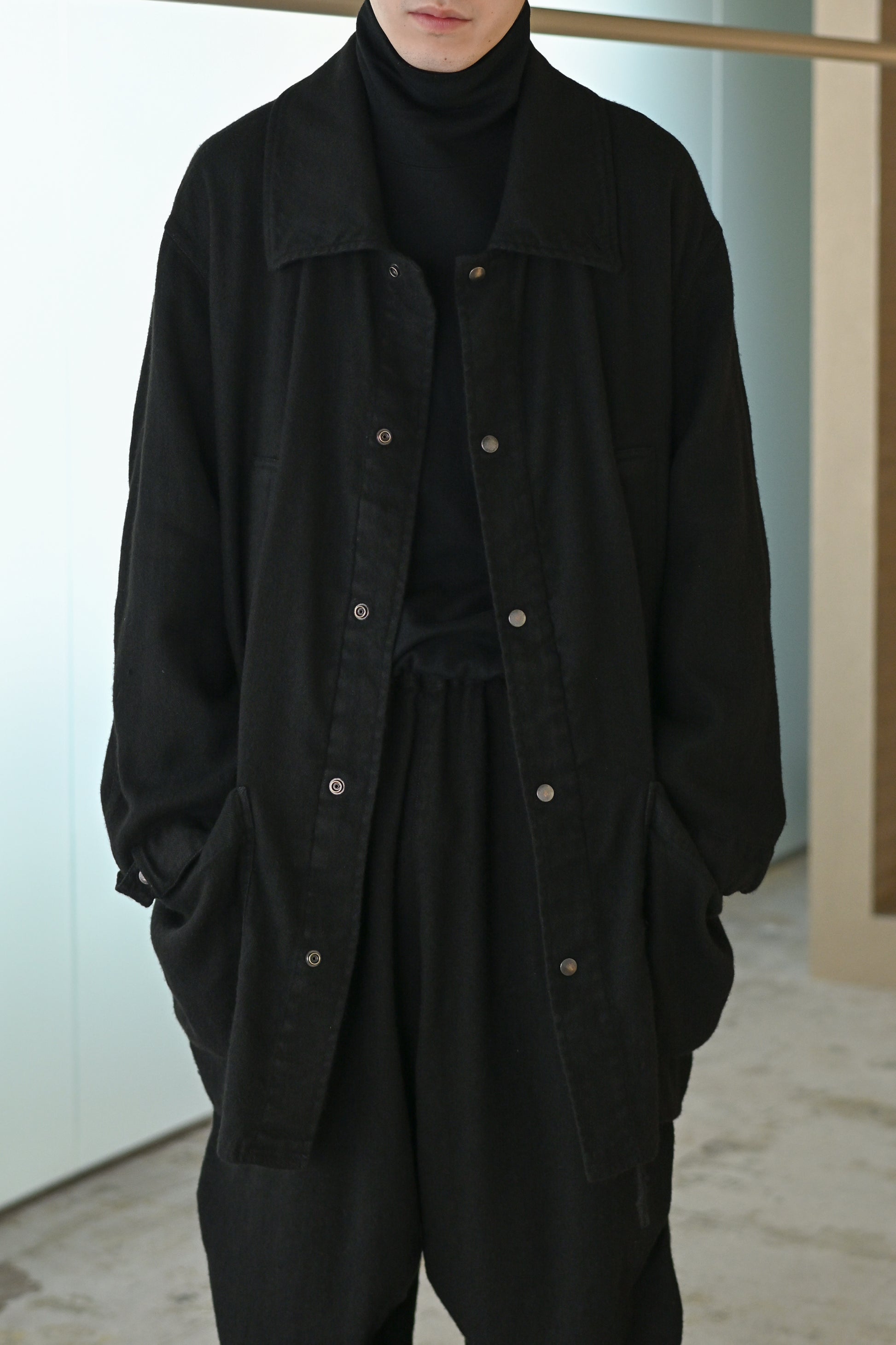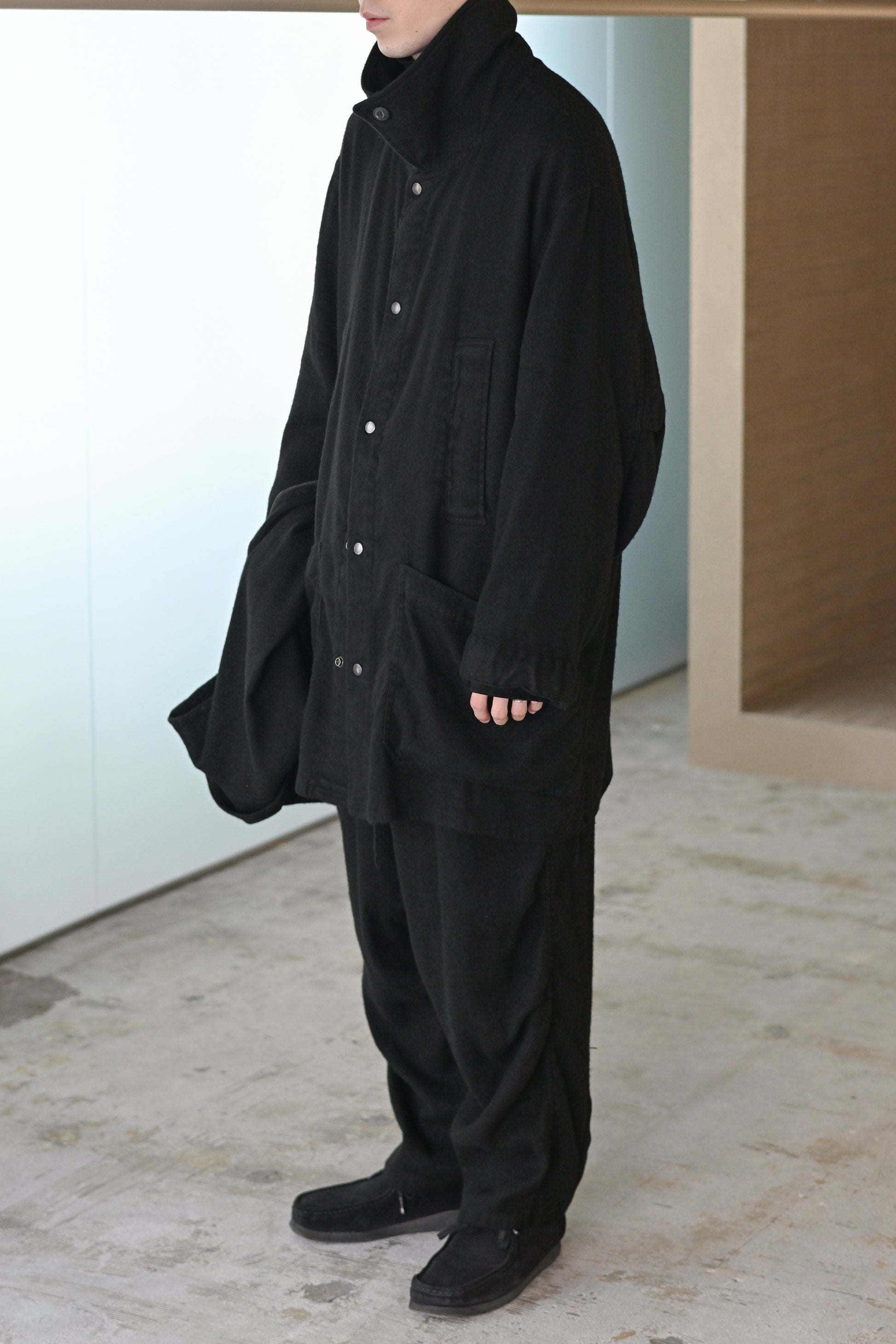 見かけはシンプルながらも前下がりを大胆に下ろし、ハンドウォーマーやパッチポケットも伴ってバランスを下げる事で、ハンガーに吊った面よりもバランスのユニークなデザインだと感じて頂けるかと思います。らしい付属というよりかはそのもの自体がboに見えるというニュアンスです。