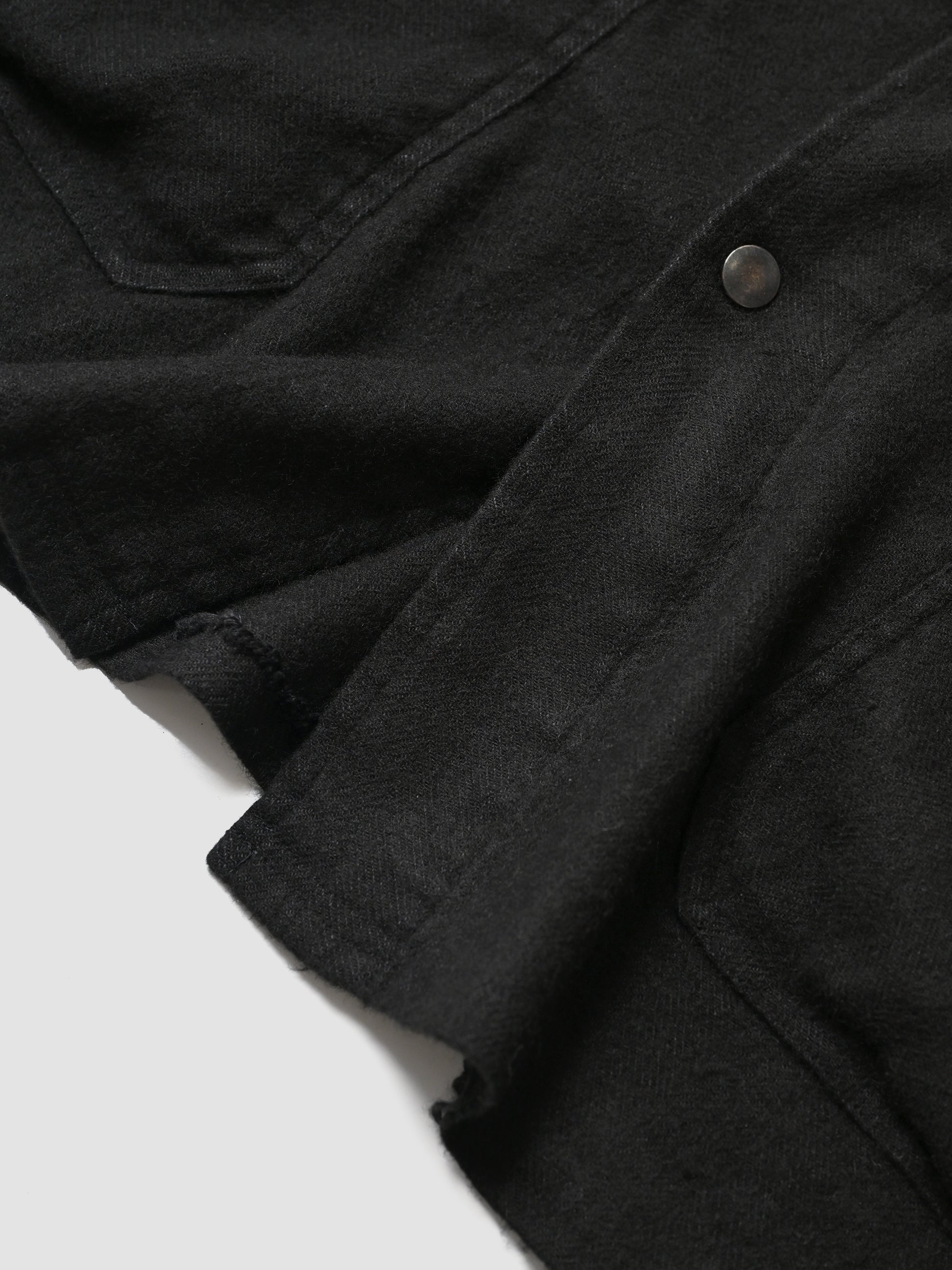 flowerとの名を冠した3型は加工B品が出た際に使われるその言葉を用いて表現されたユーモラスなネーミングです。その為、ご察しの通り世間的にB品とする環境を意図的に狙って製作するという裏をかくようなプロダクト。一見は起毛のように見えますが、履きこむ毎に無数の毛玉やカシミヤが噴き出してくるその先や、タッチの良さも楽しい藻を張ったような素材。両色製品染めですが、違いもありまして、mossは反応染料を黒でセットした際に出る黄緑方向の汚染である為、たて糸のリネンは黒に染まり、カシミヤは黄緑に。blackは予め、カシミヤを先染めの黒糸でセットし、染める事でそのままを作り出しています。狙ってのみ製品として成立する引き出しの豊富さと、その背景としてぼんやりと察する幾度かの失敗。このプロダクトが世に出る事で救われる気持ちもありそうです。