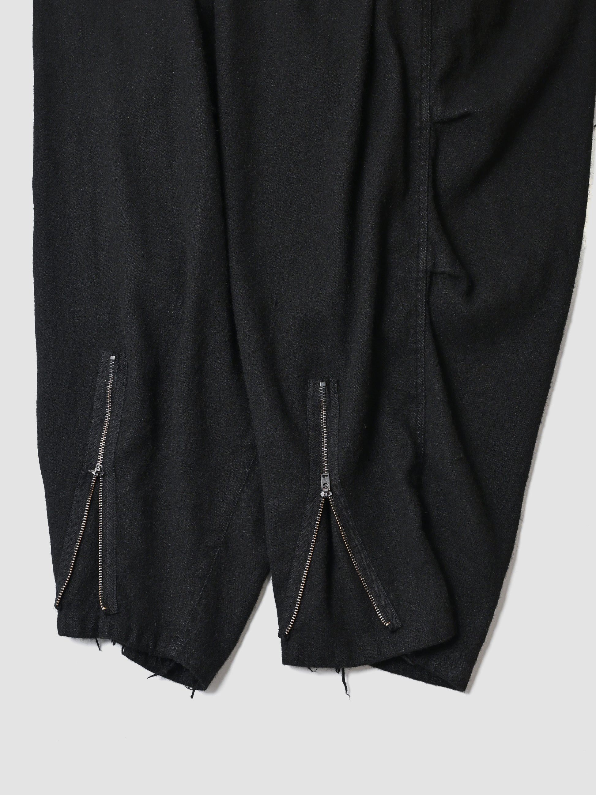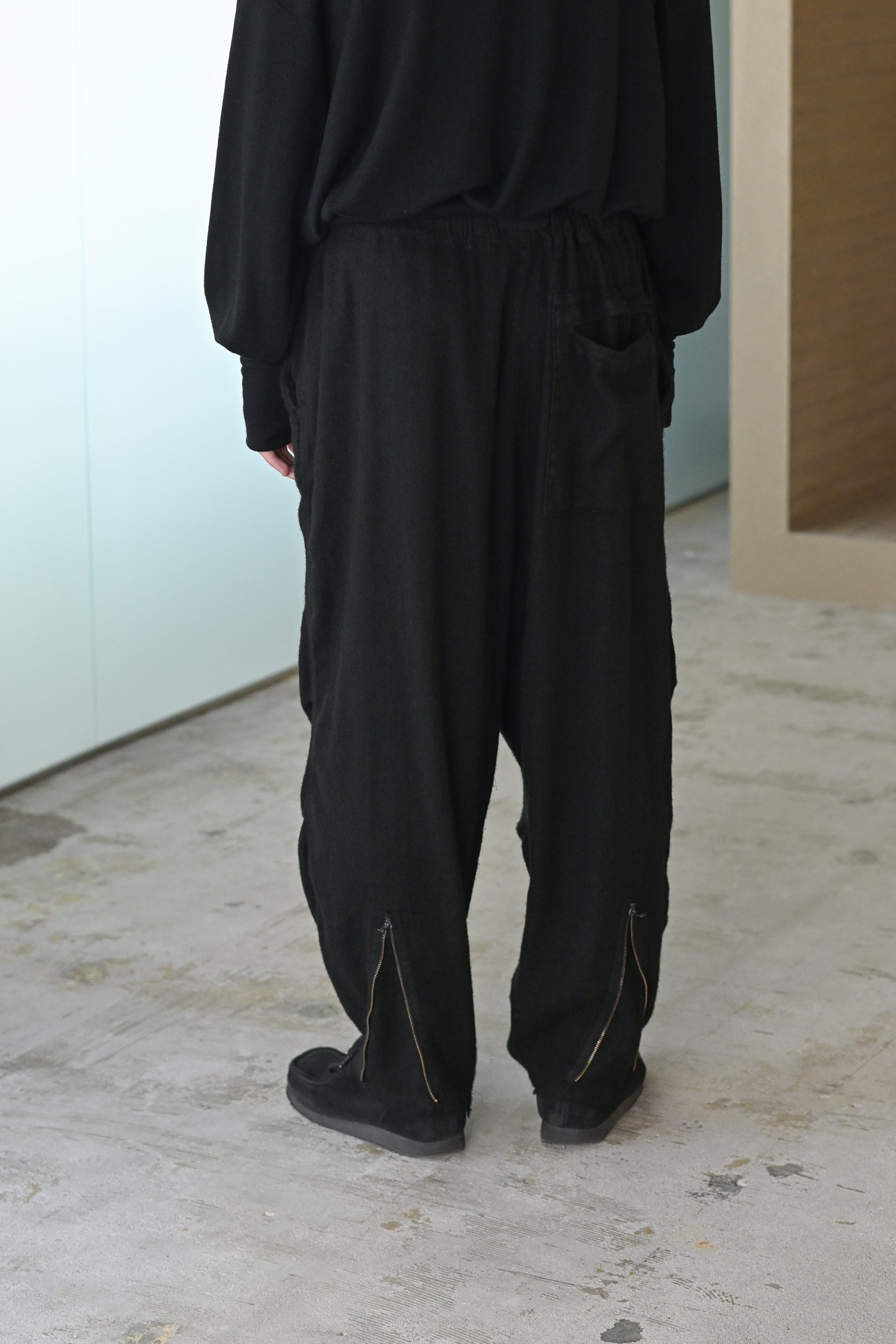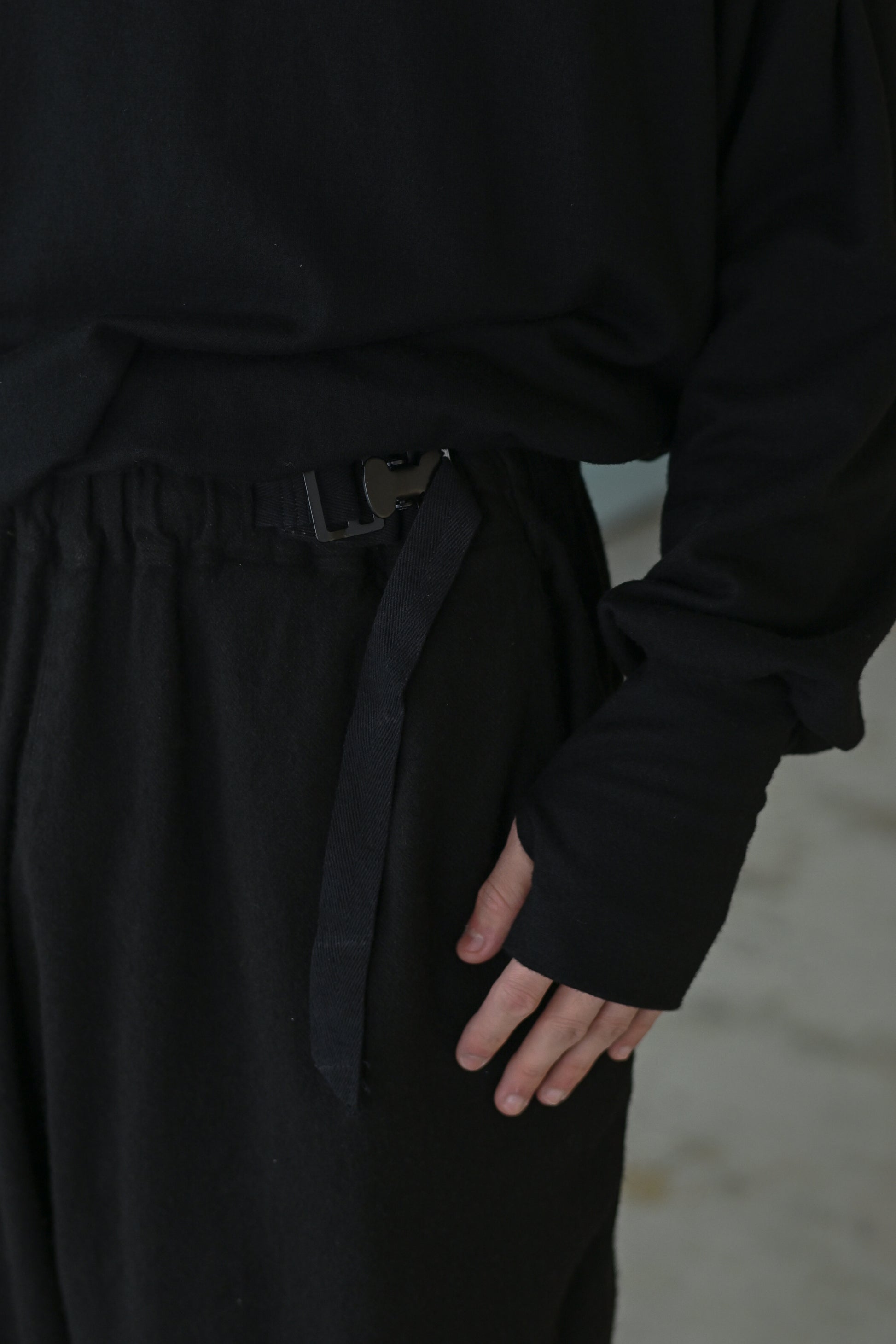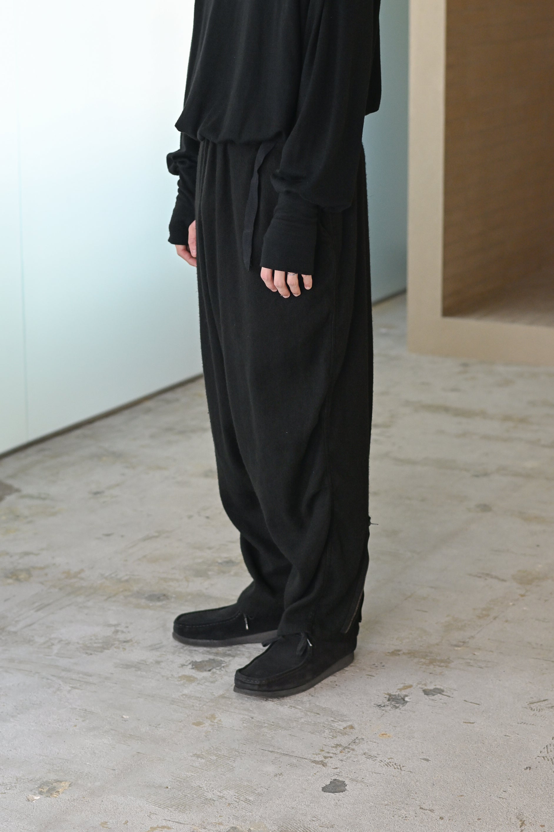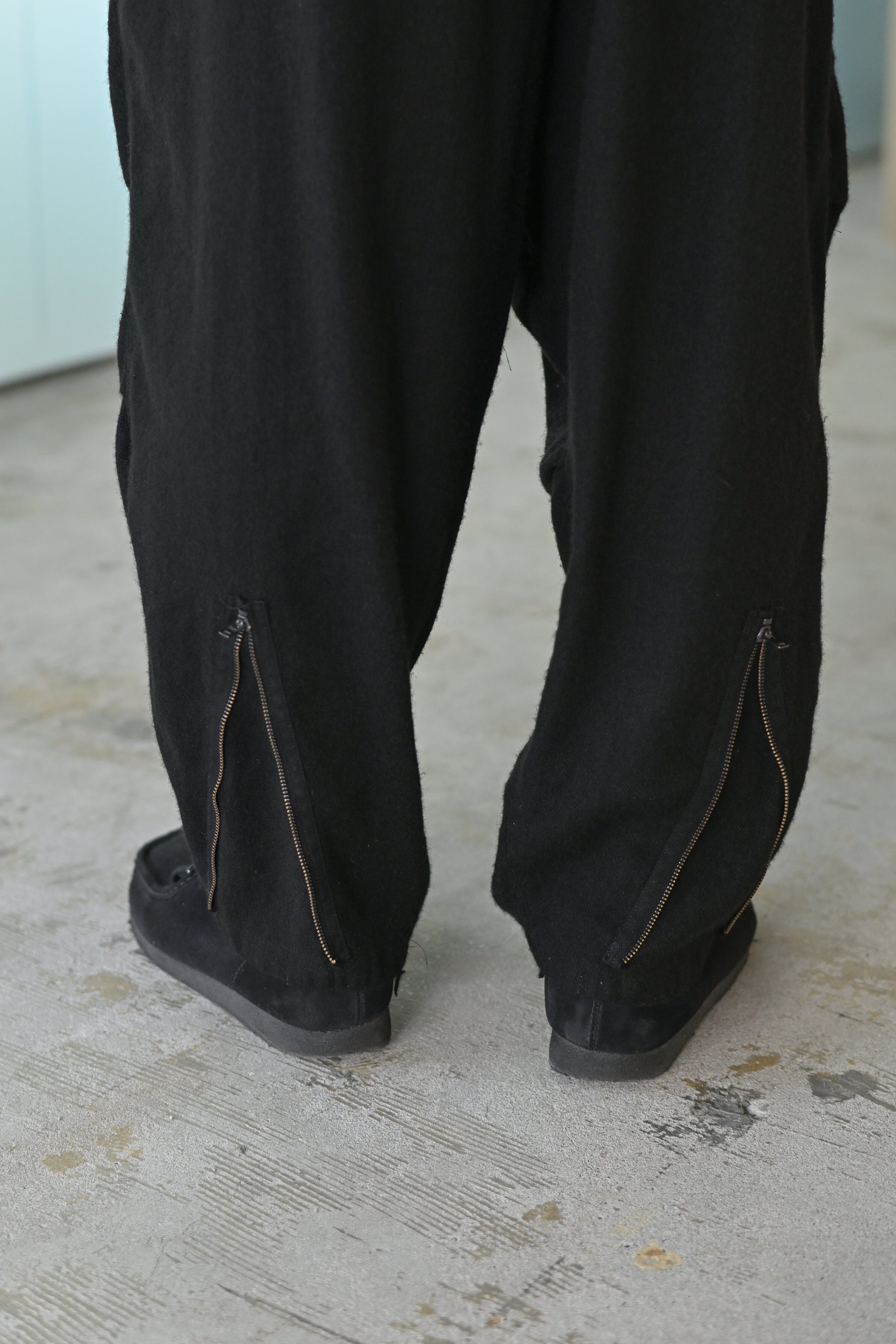 股上をたっぷり取った、裾にかけてきつめにテーパードを感じるサルエル。無愛想なシルエットにつくる事で、組成の印象とは裏腹に緊張感無いbo特異なプロダクトかと思います。きっとこれまでのどれよりも好き嫌いがはっきりするやつです。