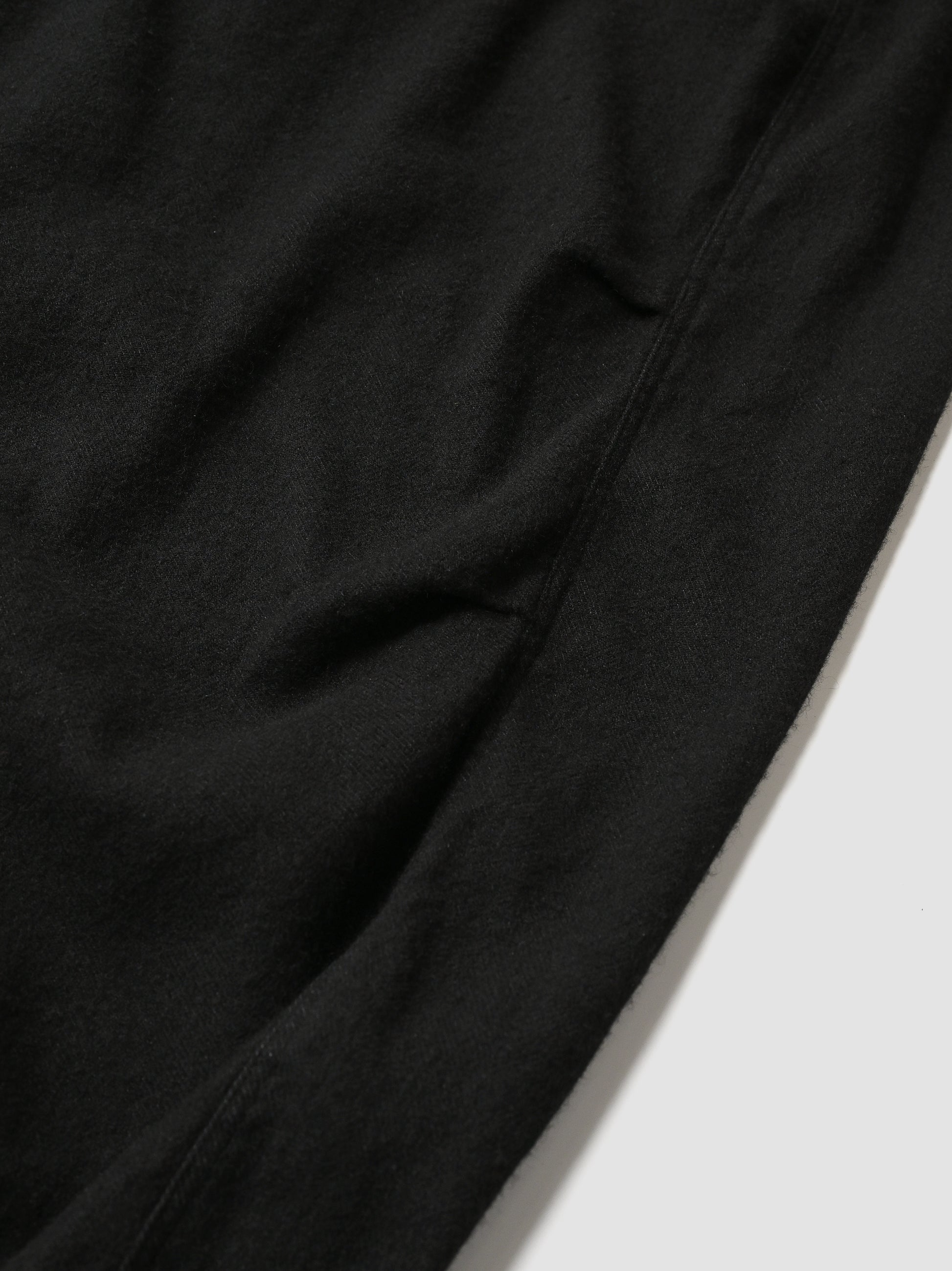 flowerとの名を冠した3型は加工B品が出た際に使われるその言葉を用いて表現されたユーモラスなネーミングです。その為、ご察しの通り世間的にB品とする環境を意図的に狙って製作するという裏をかくようなプロダクト。一見は起毛のように見えますが、履きこむ毎に無数の毛玉やカシミヤが噴き出してくるその先や、タッチの良さも楽しい藻を張ったような素材。両色製品染めですが、違いもありまして、mossは反応染料を黒でセットした際に出る黄緑方向の汚染である為、たて糸のリネンは黒に染まり、カシミヤは黄緑に。blackは予め、カシミヤを先染めの黒糸でセットし、染める事でそのままを作り出しています。狙ってのみ製品として成立する引き出しの豊富さと、その背景としてぼんやりと察する幾度かの失敗。このプロダクトが世に出る事で救われる気持ちもありそうです。