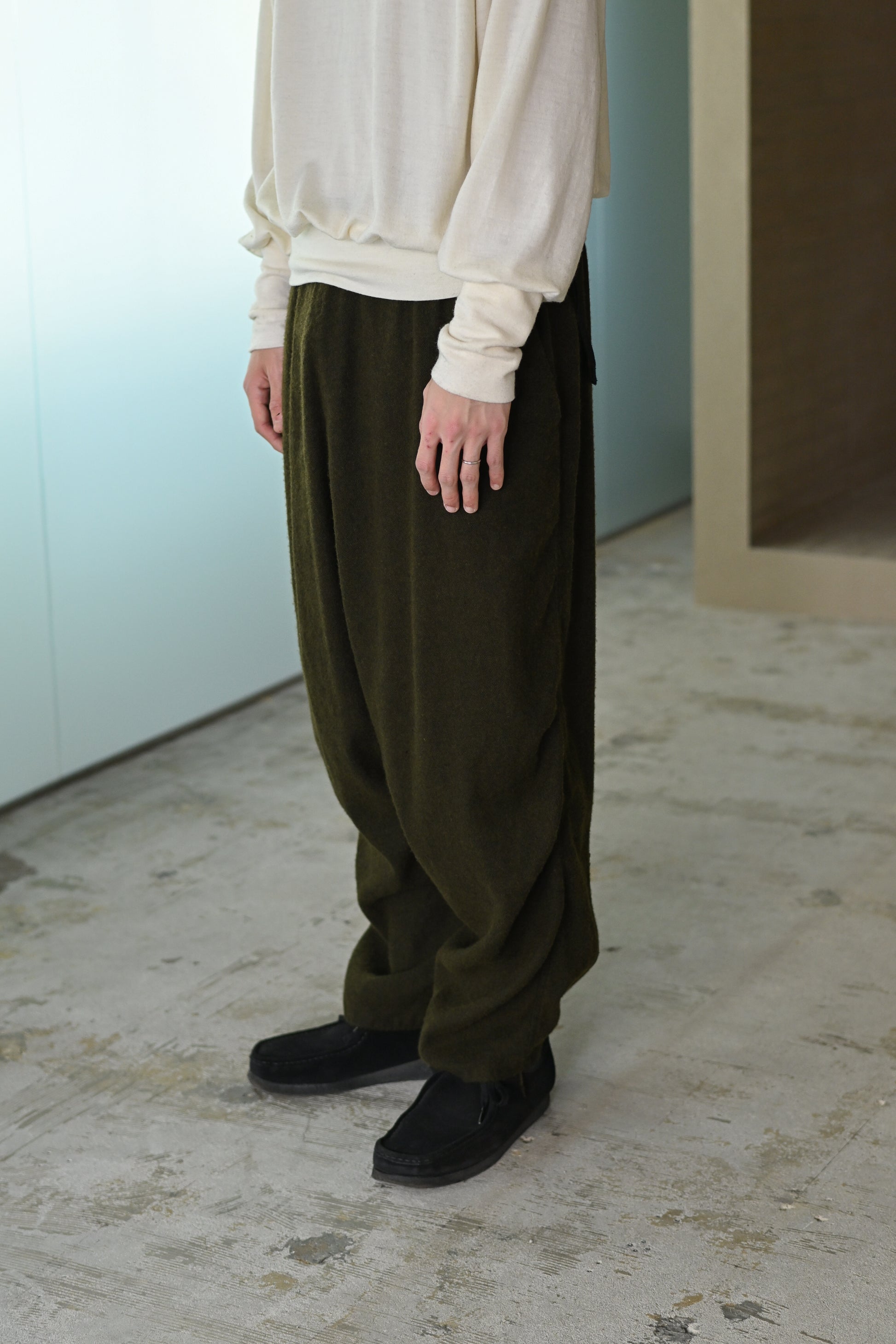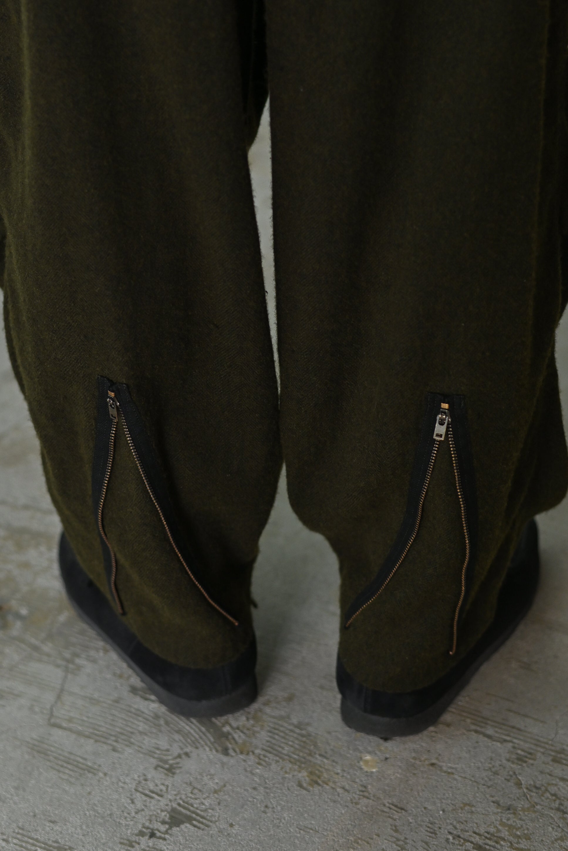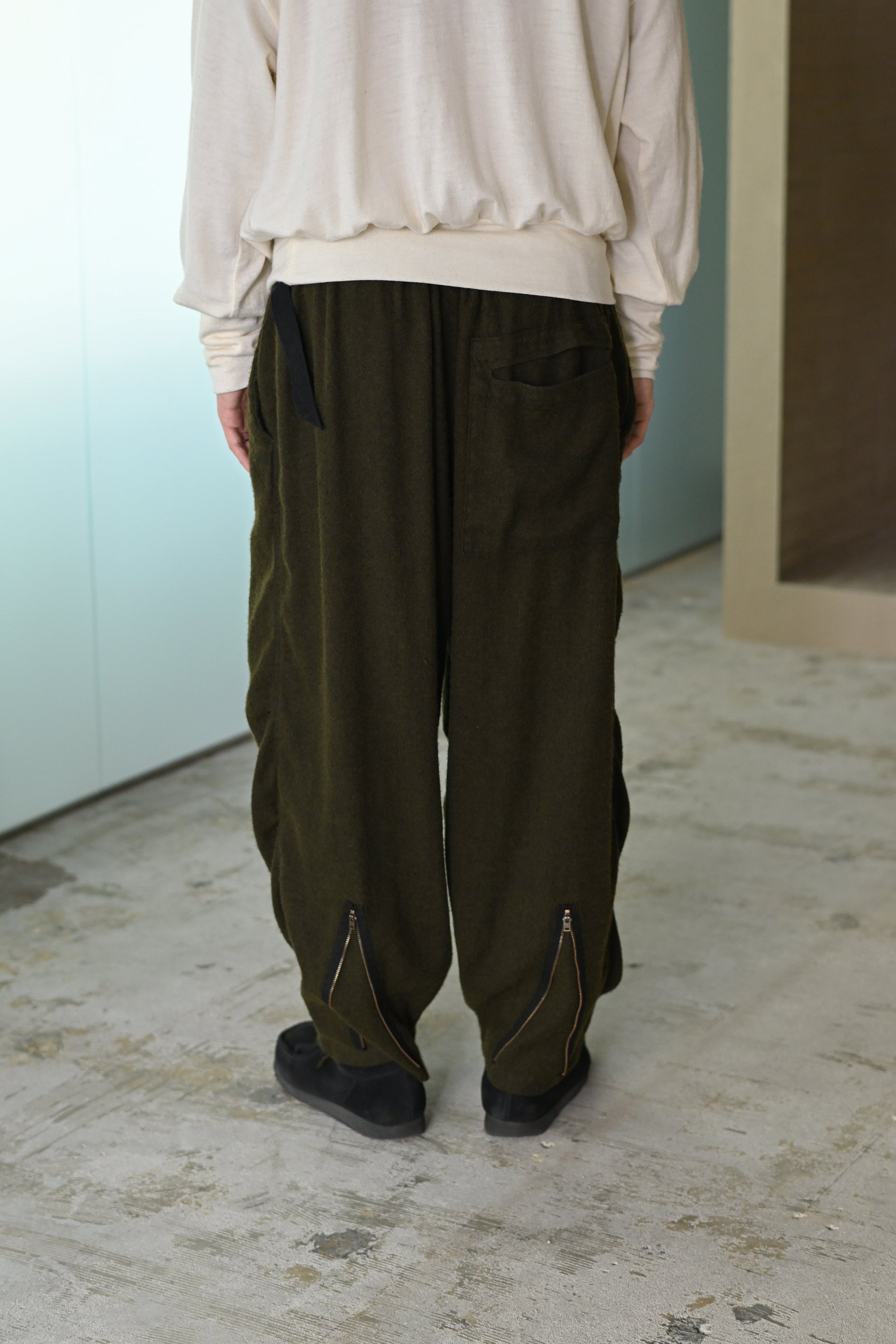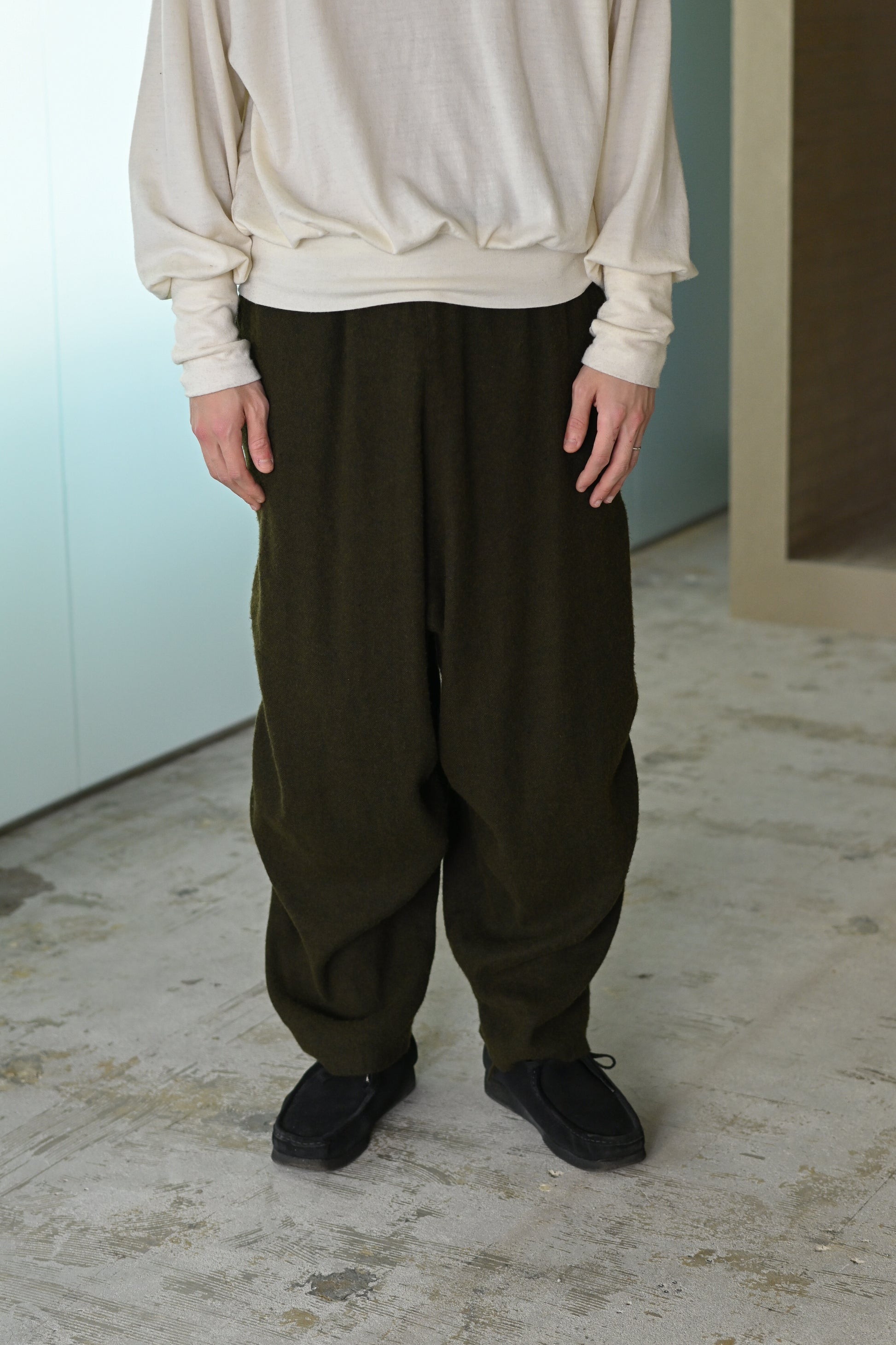 股上をたっぷり取った、裾にかけてきつめにテーパードを感じるサルエル。無愛想なシルエットにつくる事で、組成の印象とは裏腹に緊張感無いbo特異なプロダクトかと思います。きっとこれまでのどれよりも好き嫌いがはっきりするやつです。