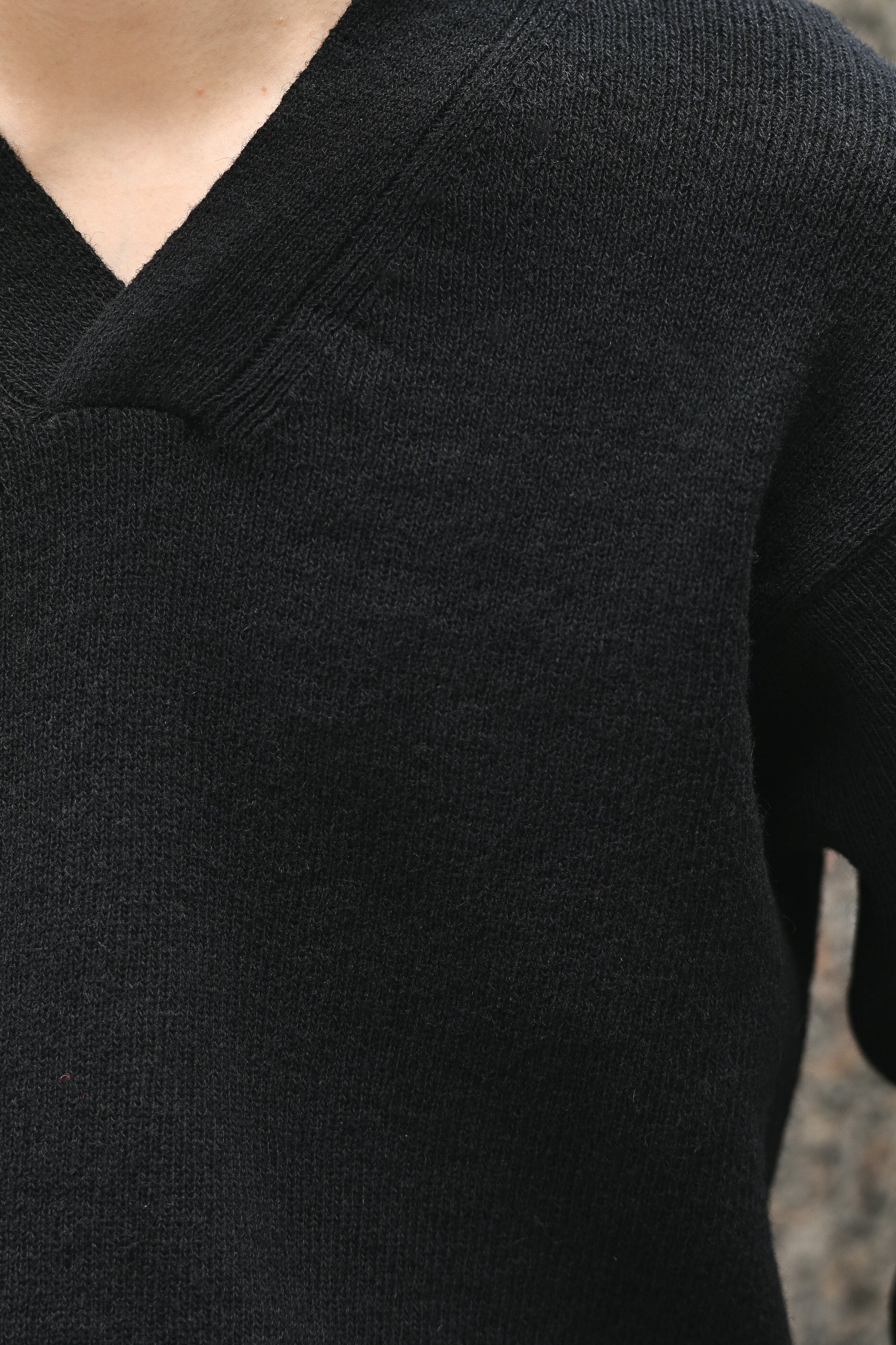 強く撚りをかけることで、丈夫で毛玉にもなりにくく、シェットランド特有の張りのあるヘアーが減り、肌当たりもよくなります。ゴリっとしたタッチ、ミリタリーセーターのような素材感をイメージして制作されていますが、硬さや張り感は生かしながらも、動きやすく、身体に馴染むようにゴム編み組織です。糸が丈夫な上、目を詰めたゴム地で編んでいるのでキックバックもよく、家庭洗濯でも型崩れしにくい優れものです。