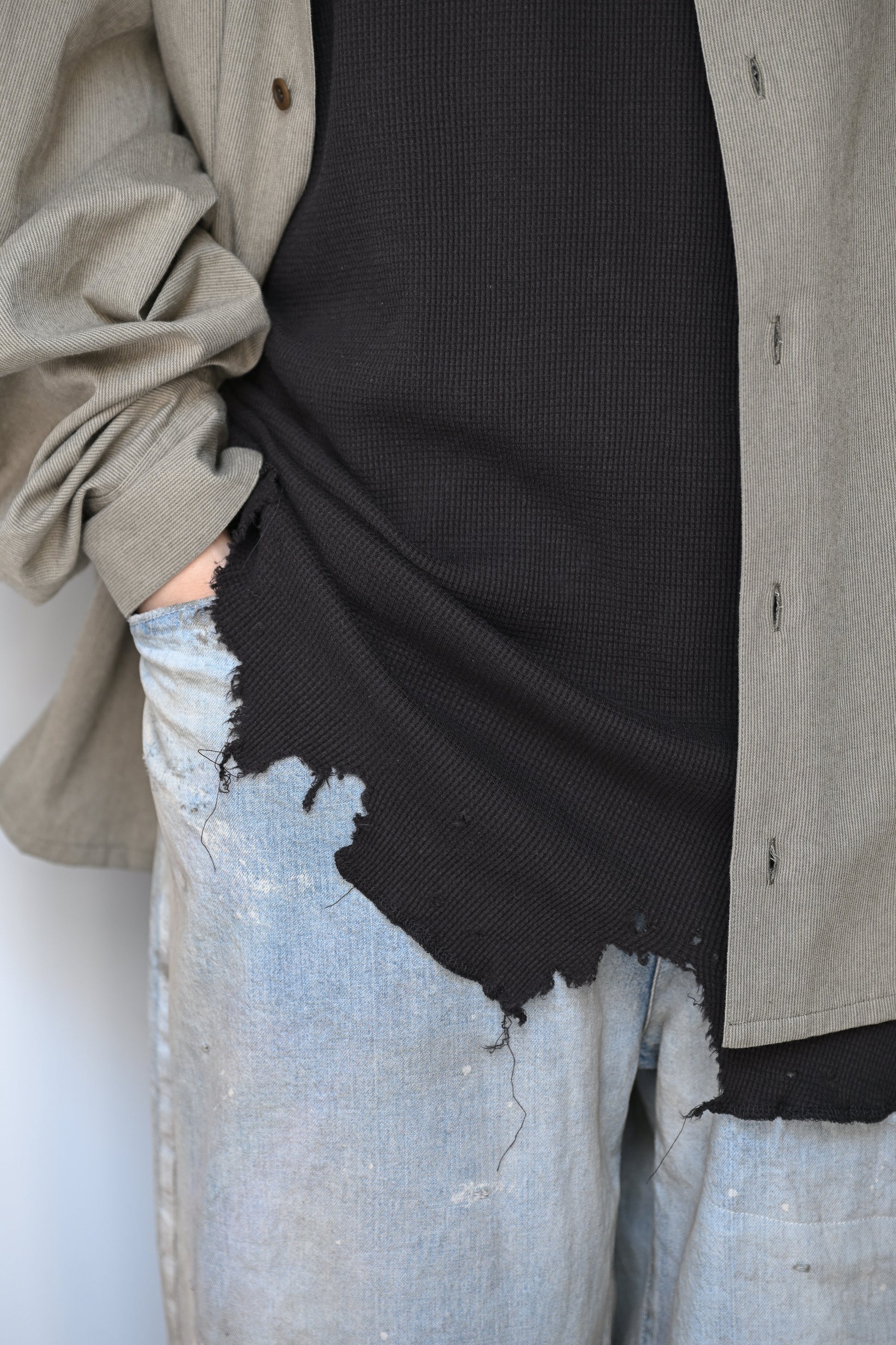 この時期作り続けているダメージワッフルのタックトップ。裾を覗かせてレイヤードにもってこいなアイテムでお好きな方も多いのでないでしょうか。インナーとしても使う頻度は高いでしょうから色違いで選んでも良し、同じものを持っておくのも良しです。ワッフルの洗っての縮み、着用からの伸び、それを続けることでの育つのも楽しみなアイテムです。