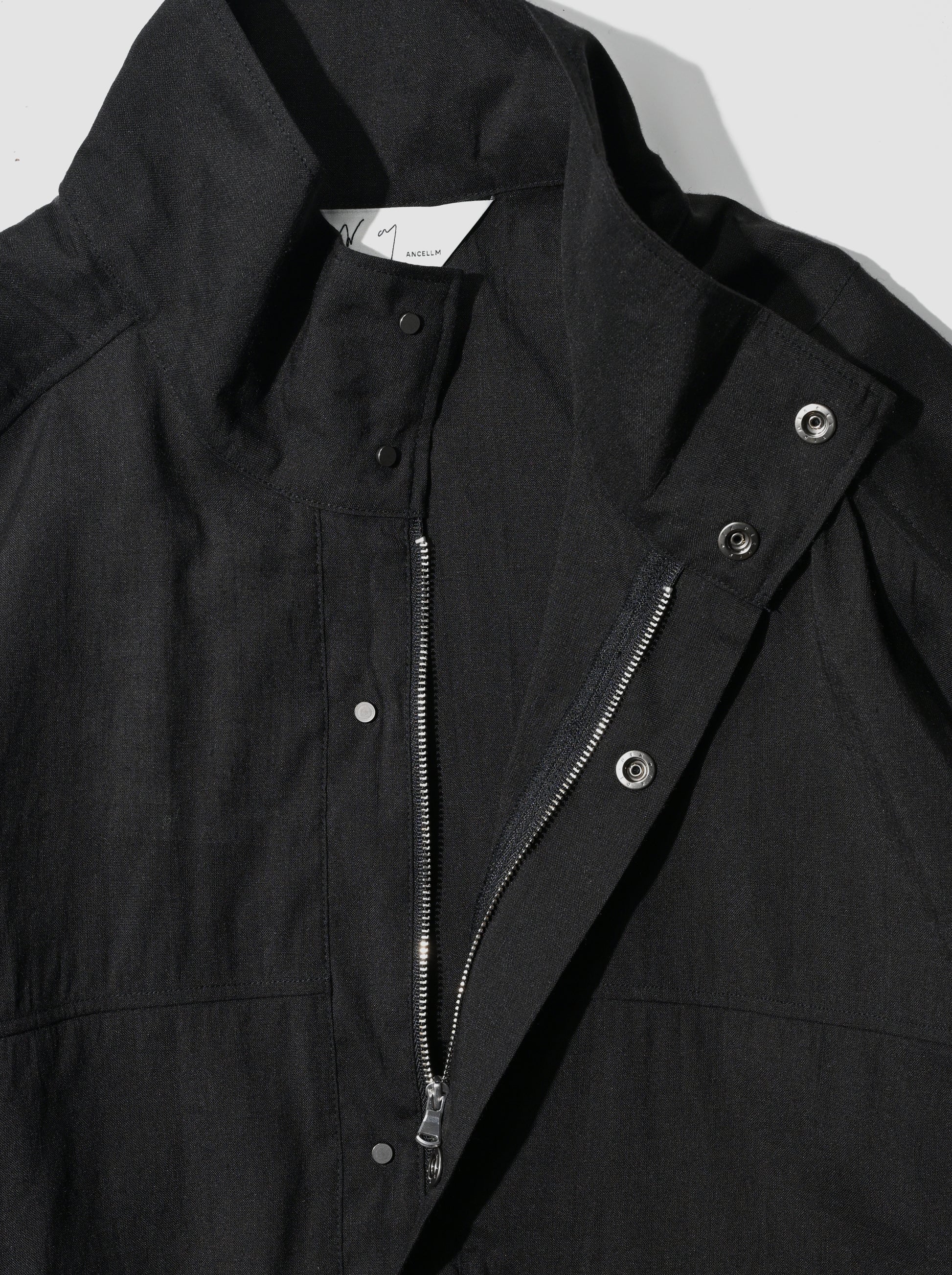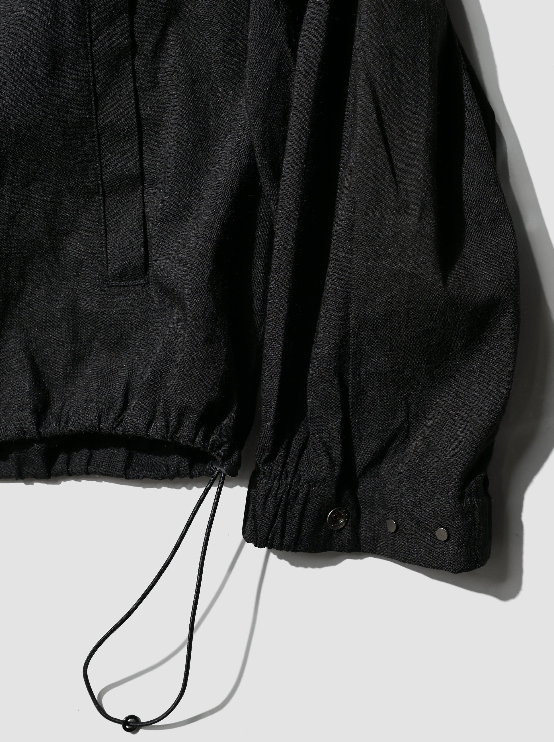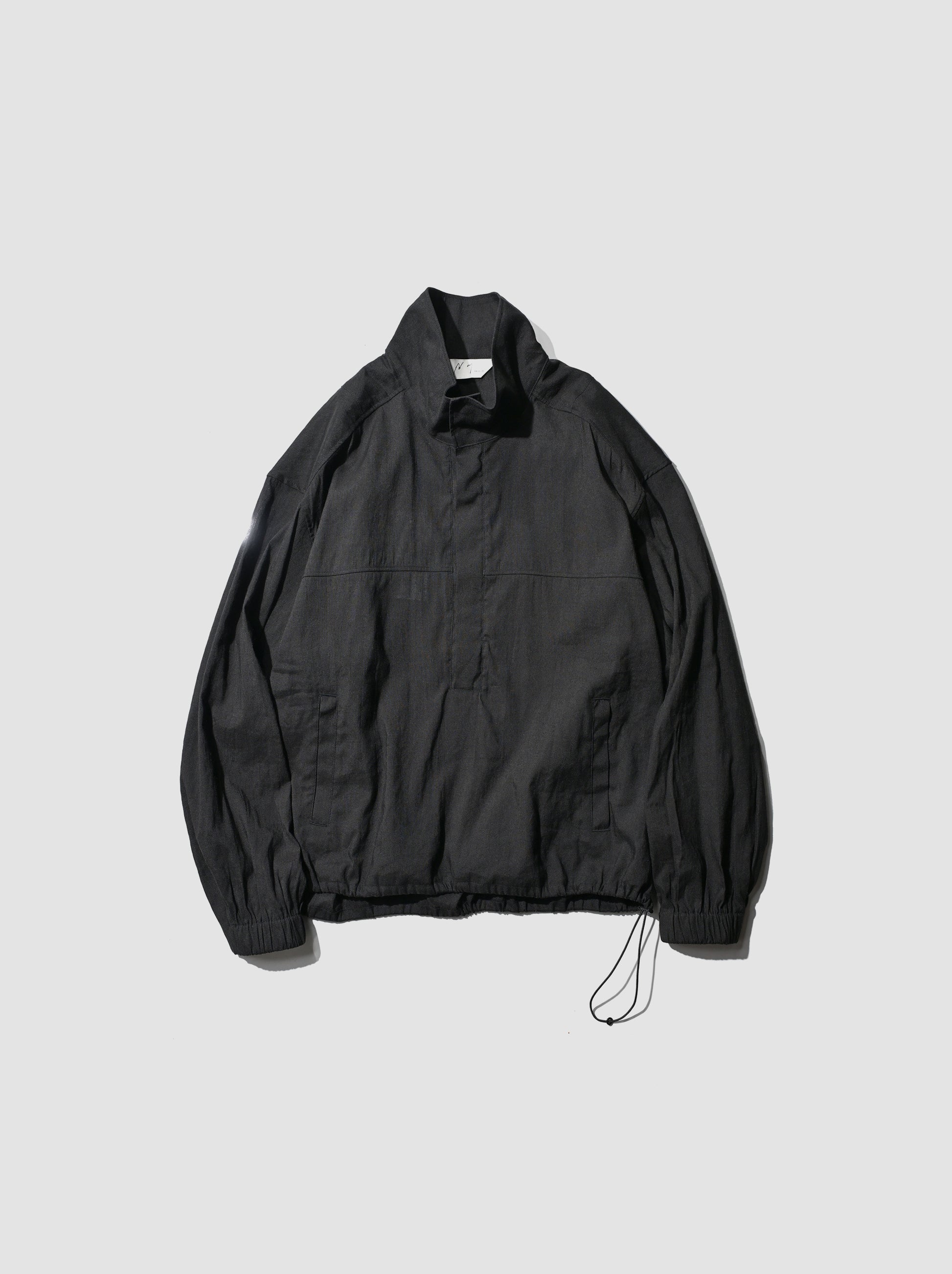 リネンとナイロンのブレンド素材。程度なドライなタッチが肌あたりもよく気温が変わっても気持ちよく着ていただけるかと思います。高めなネック、裾のドローコードでシルエットや着方の幅も広がる1着。同素材のパンツとセットでの着用も。
