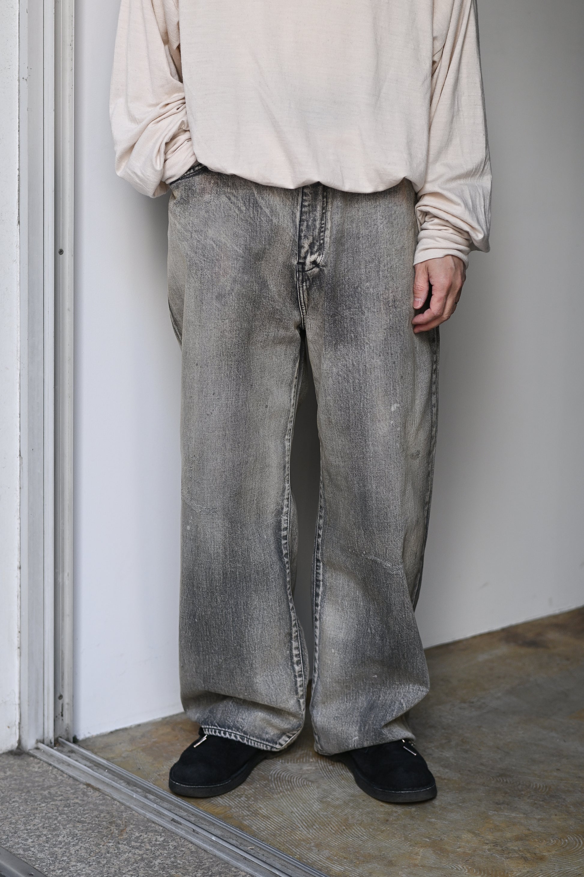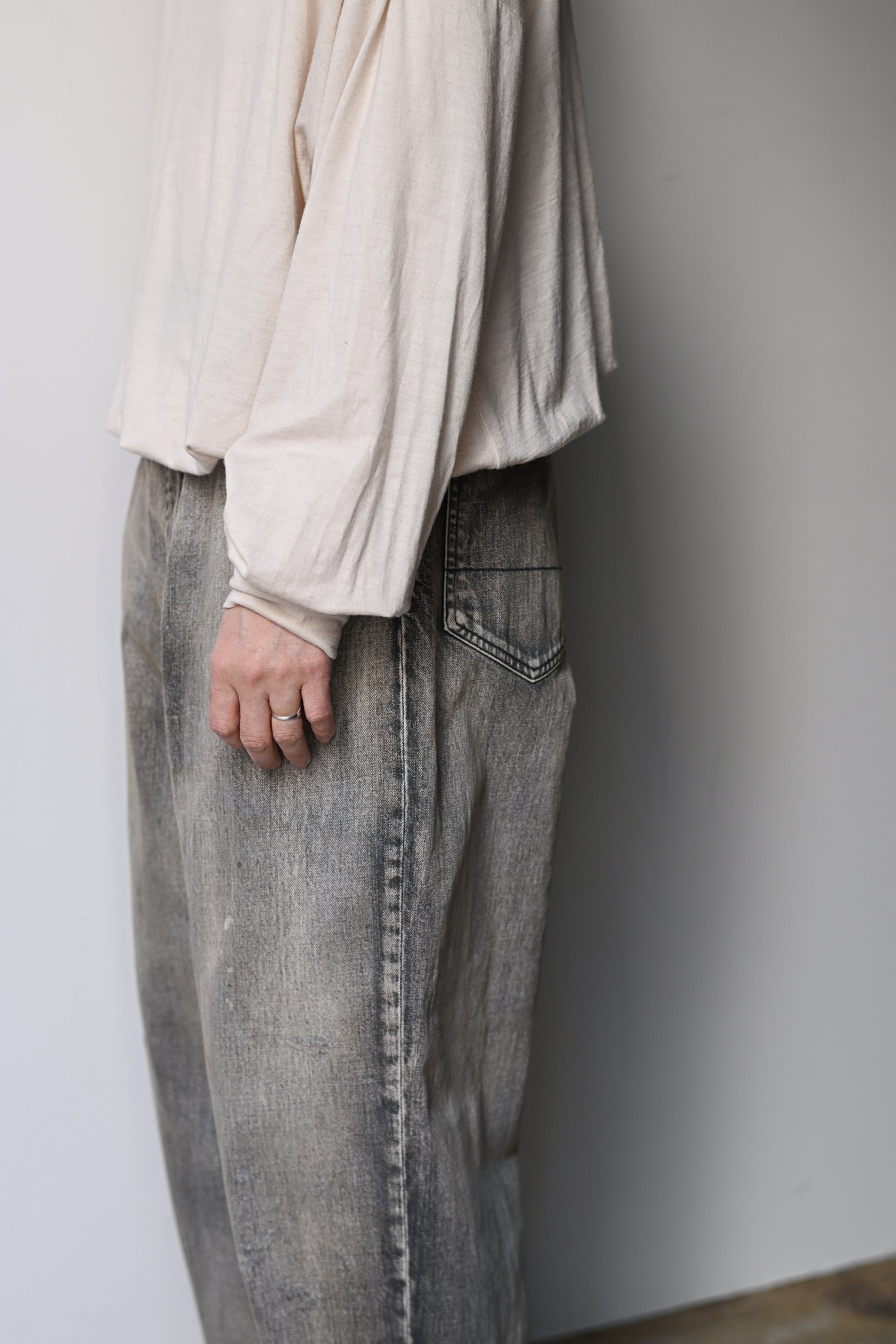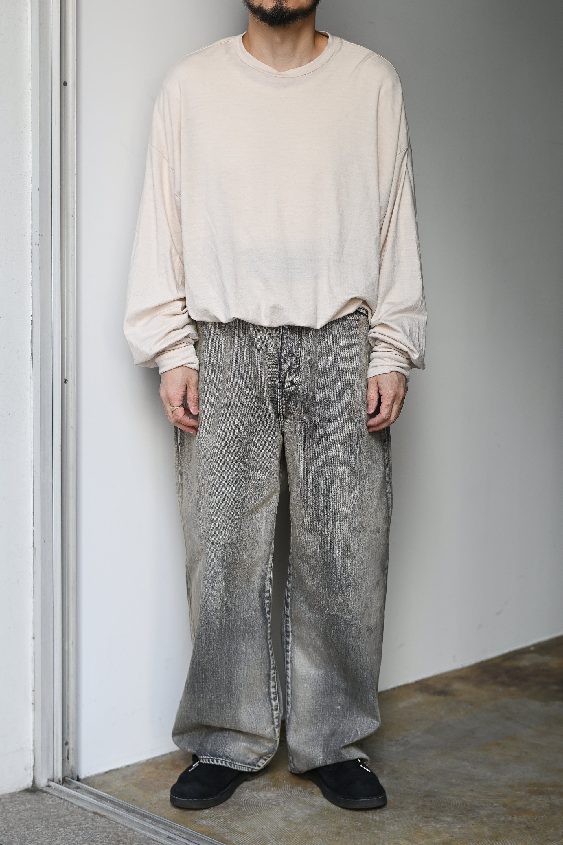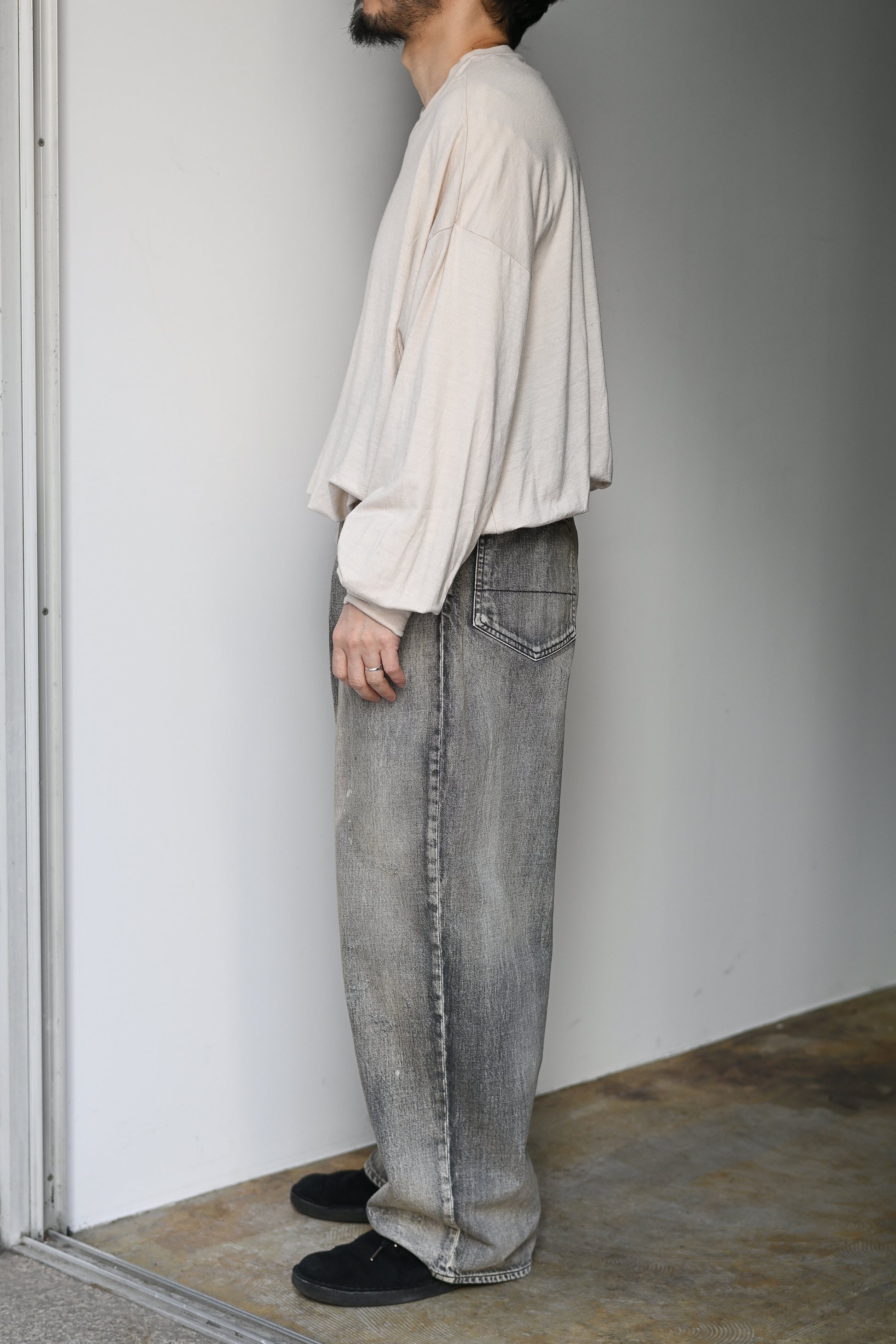 その時その時の時代により良い立ち姿になるようにミリ単位での調整をしてアップデートし続けているANCELLMを代表するスタンダードモデル。程よいゆとりとテーパードからなるシルエットは綺麗なセミワイド。幅広いスタイルに活用できるモデルです。加工も他デニムと同様に熟練の職人さんたちの手作業から生まれ、ダメージはじめ、色を落としたベースカラーに対して淡色、中間色、濃色それぞれ足して色味のバランスを調整、さらにANCELLM独自の調合色をプラスと、時間と手間を要した一本は流石の雰囲気です。
