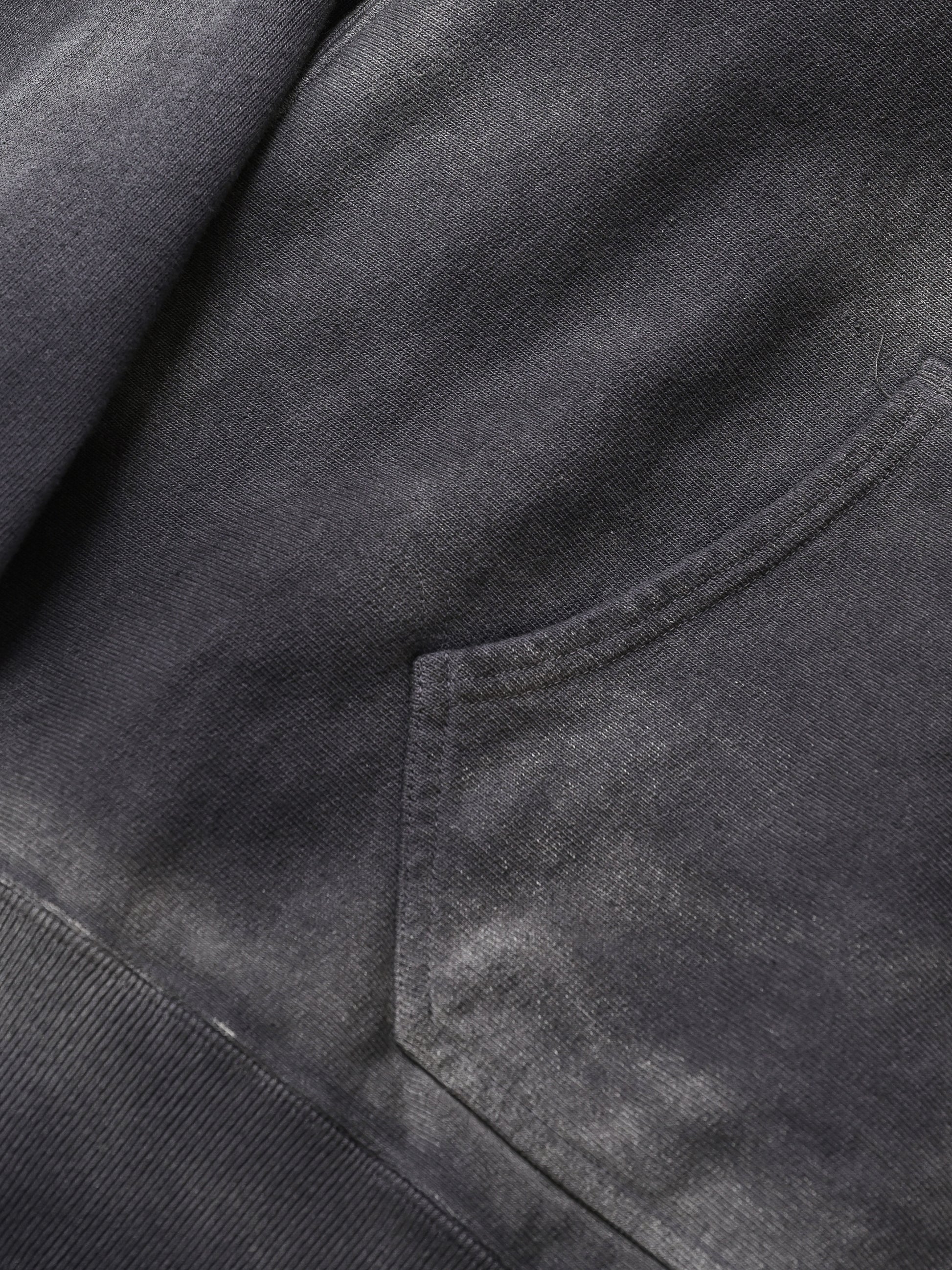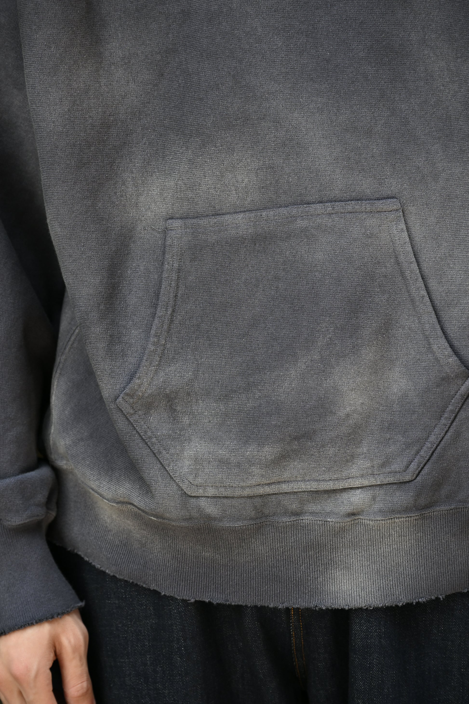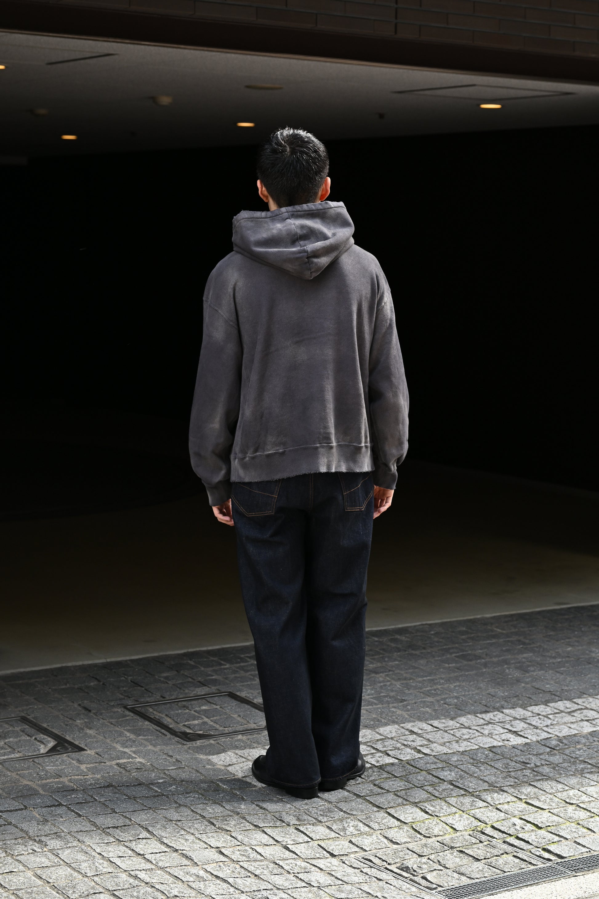 デニムと同じく定番のフーディーでありますが、今季のプロダクトにはそれを感じさせない独自の染色技法と加工から生み出したグラデーションの美しさがあります。まるで水に広がるグラデーションのような仕上がりはランダムに現れる色彩の個性と一着たりとも同じものは作れない偶然的な必然。是非同色のアイテムとも合わせてみて下さい。より際立ち、浮かび上がると思います。