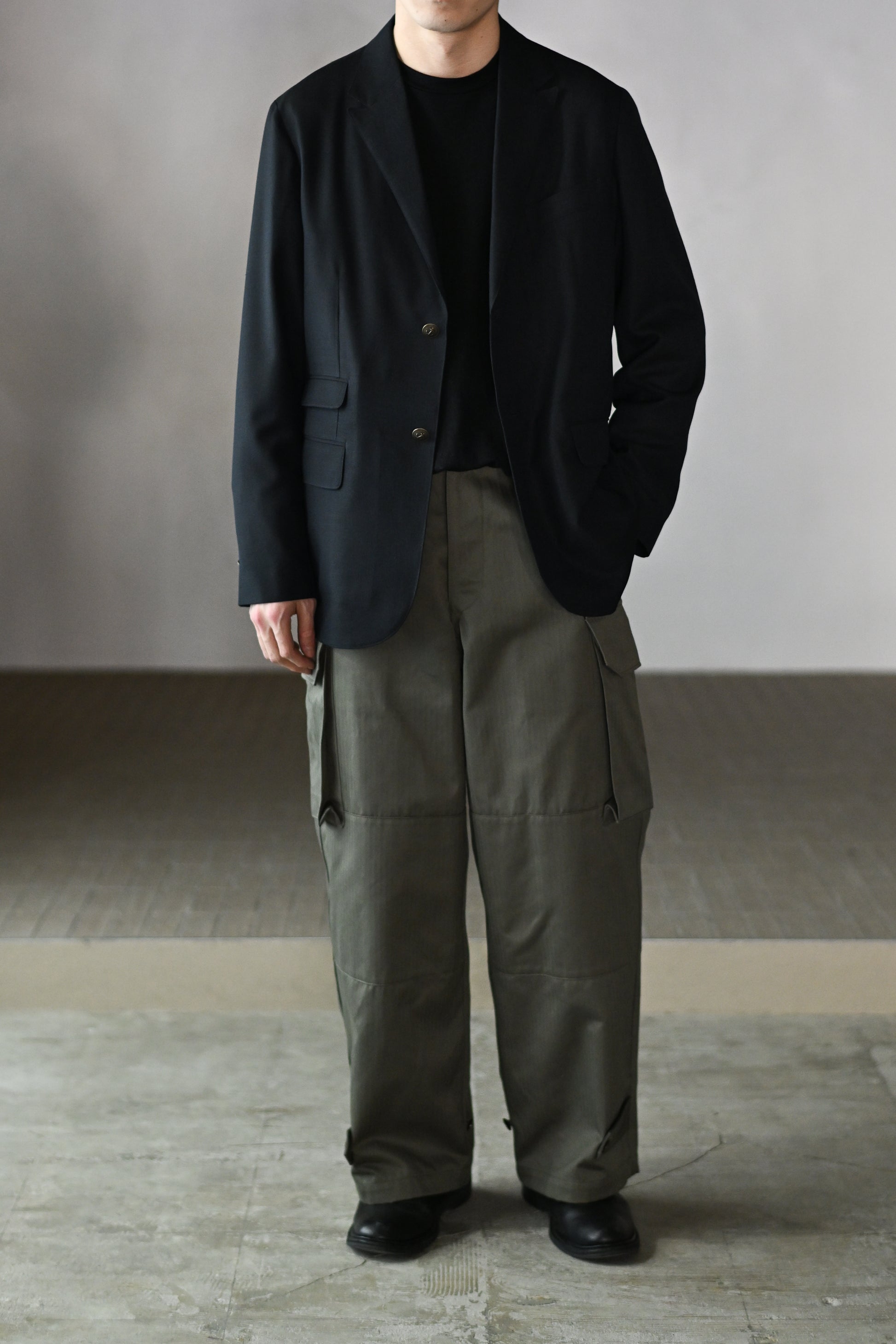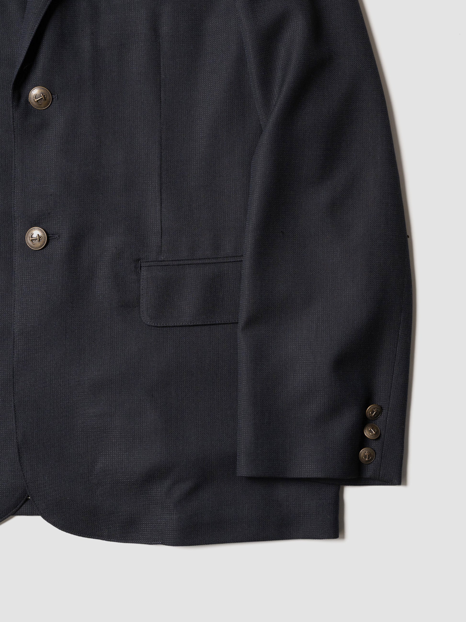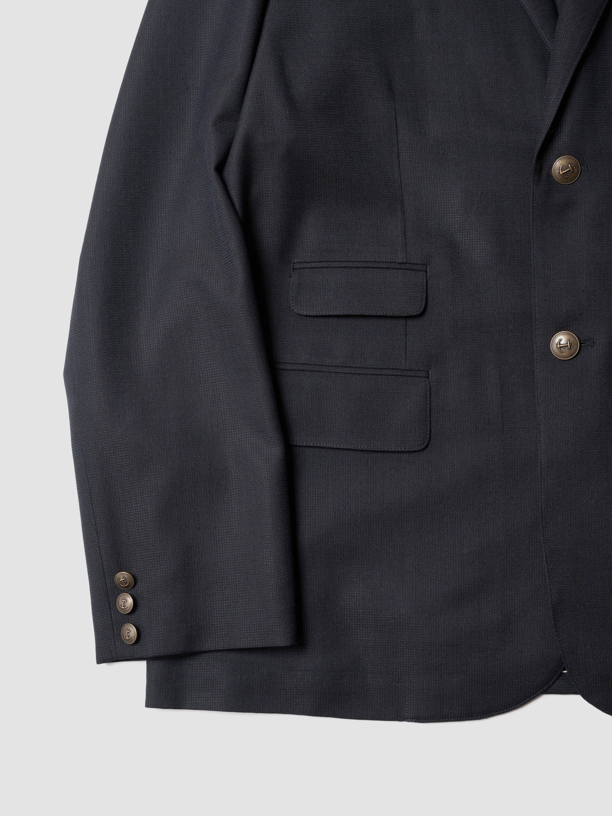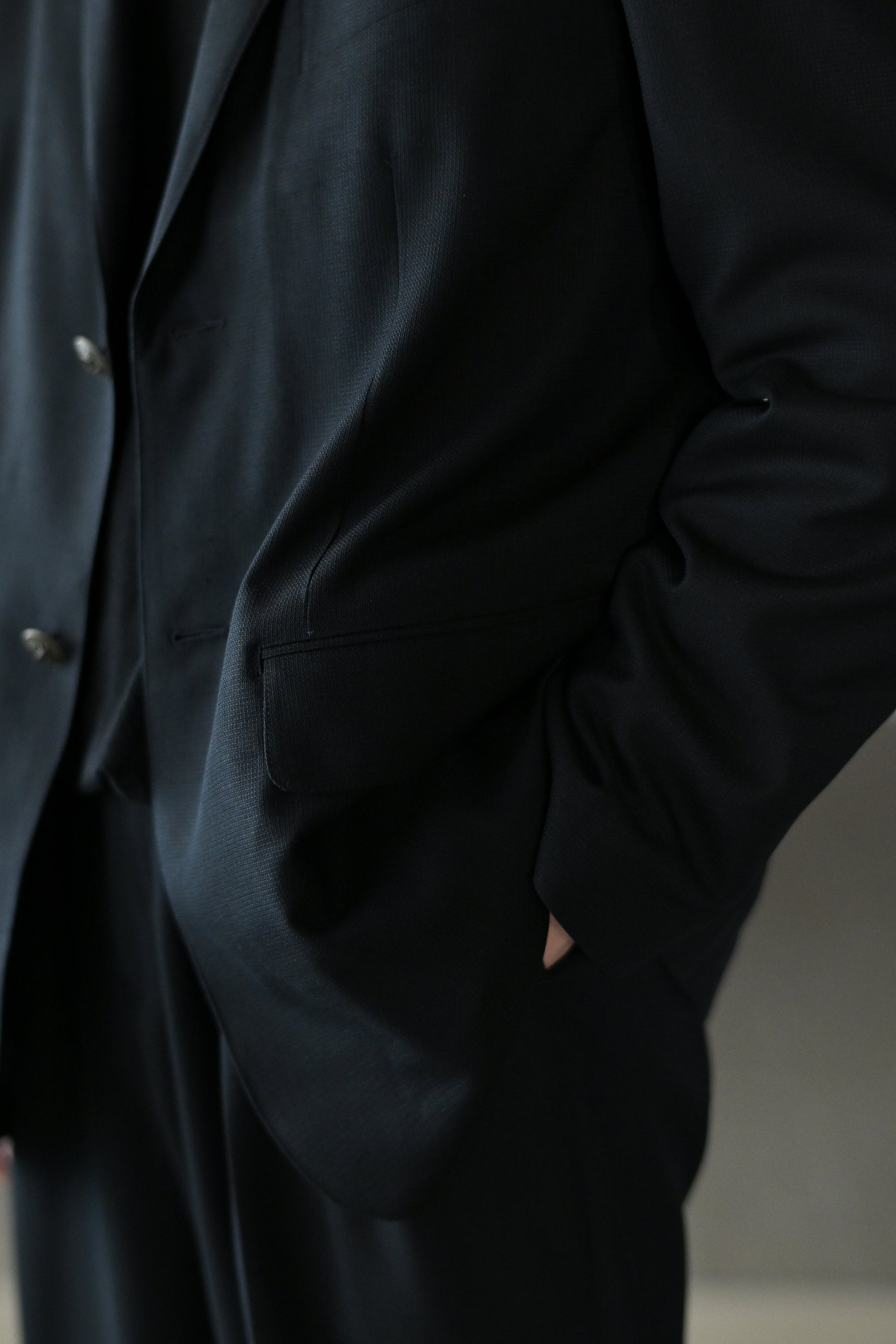 春夏用の紺ブレ、ネイビーセットアップをイメージして、熱帯素材と言えばのヴィンテージ、英40年代のパナマクロスをスーパー140'Sウールとシルクで製作。ブッシュジャケットやグルカパンツなどの夏アイテムにピッタリなメッシュ調のサラサラとしたタッチとシルクの落ち感が気持ちの良い1着となっています。
