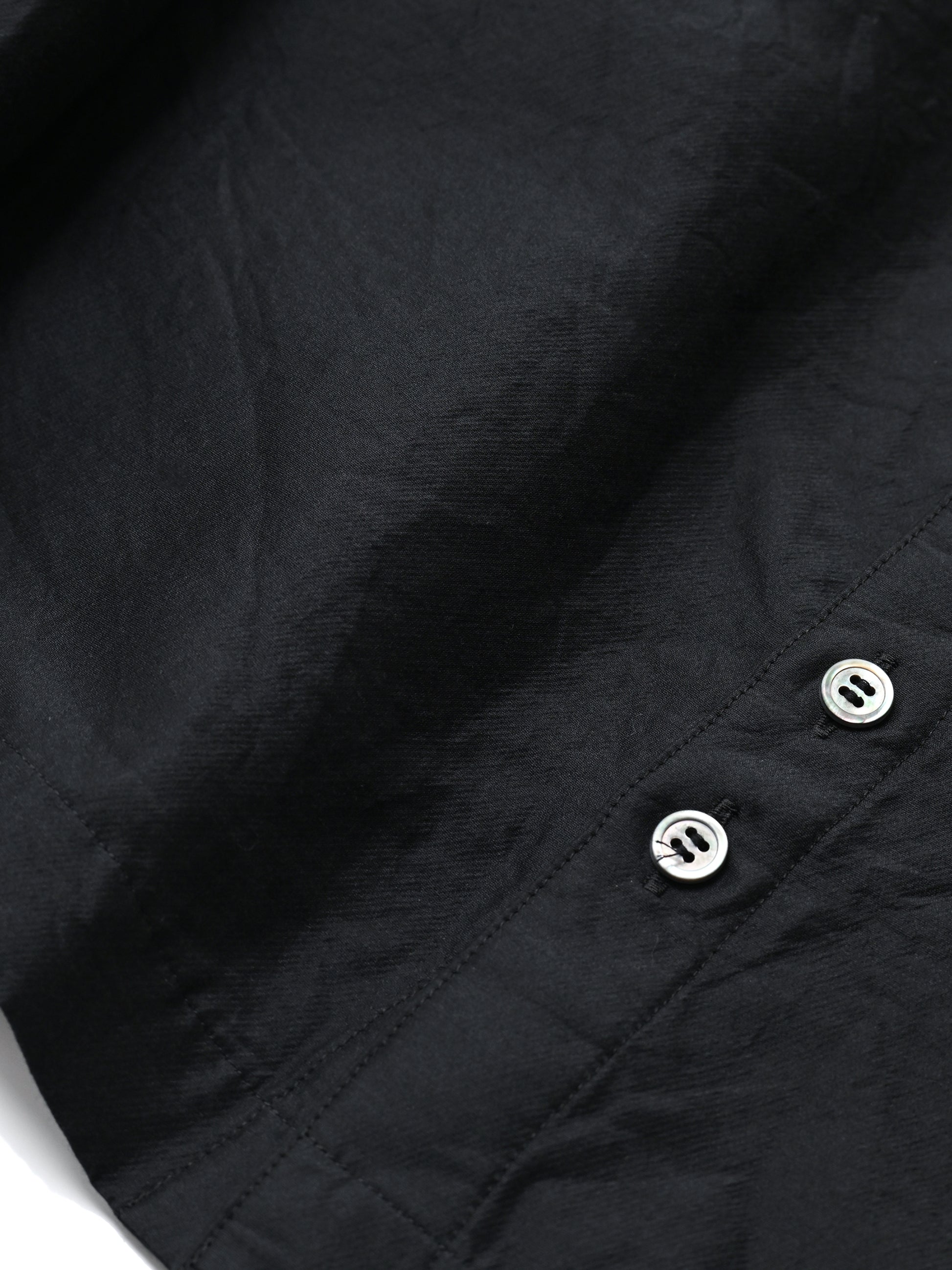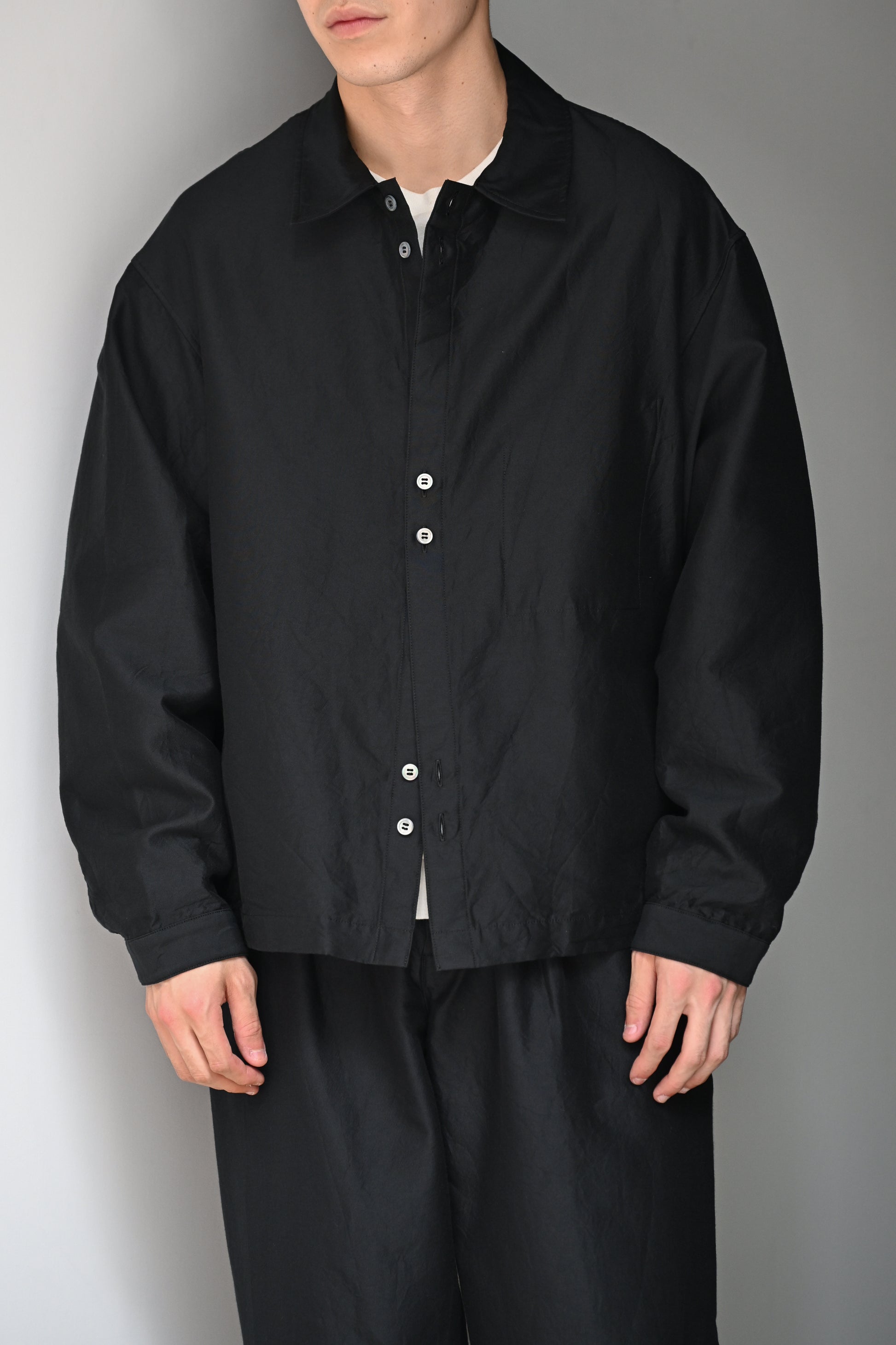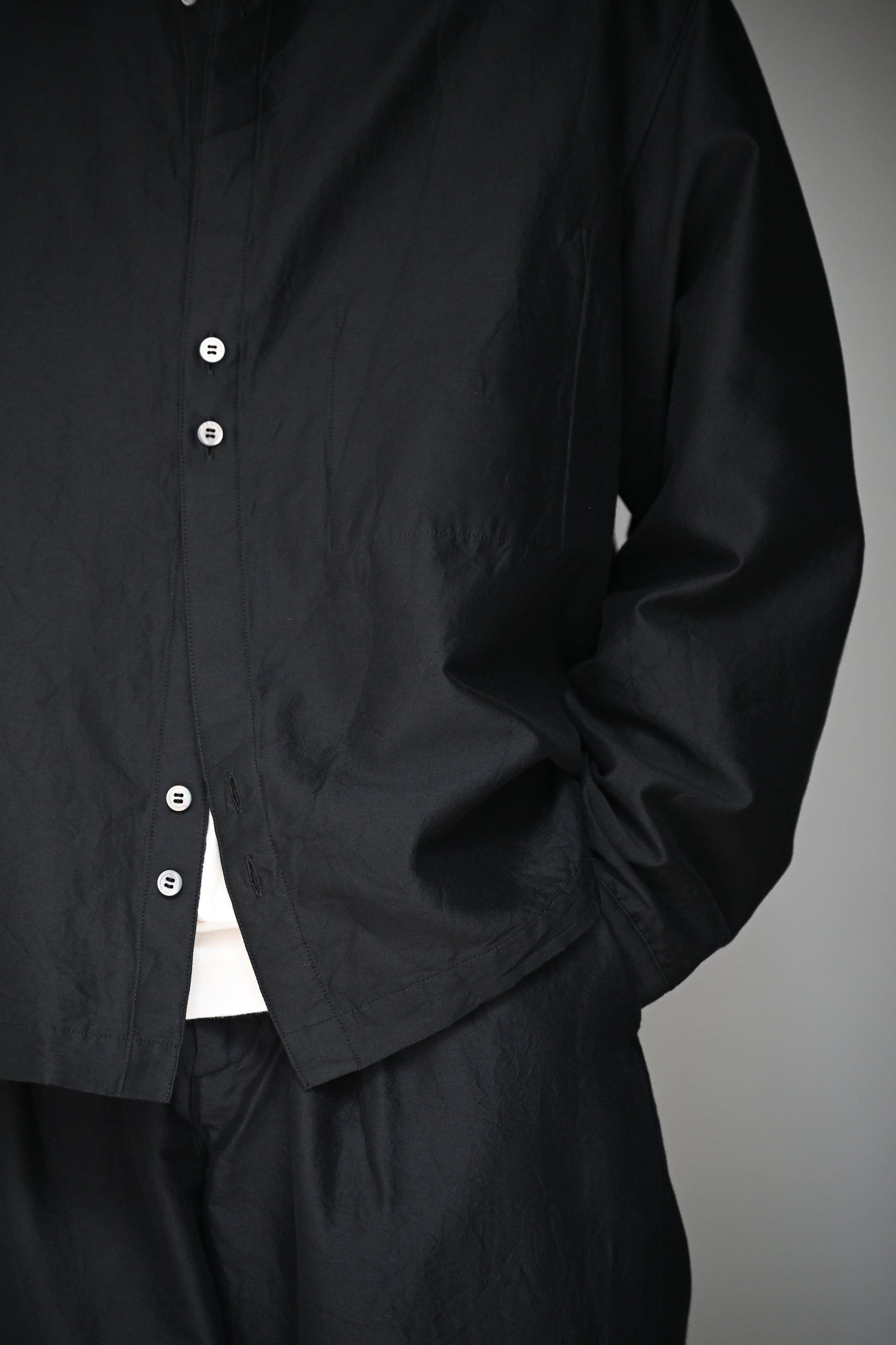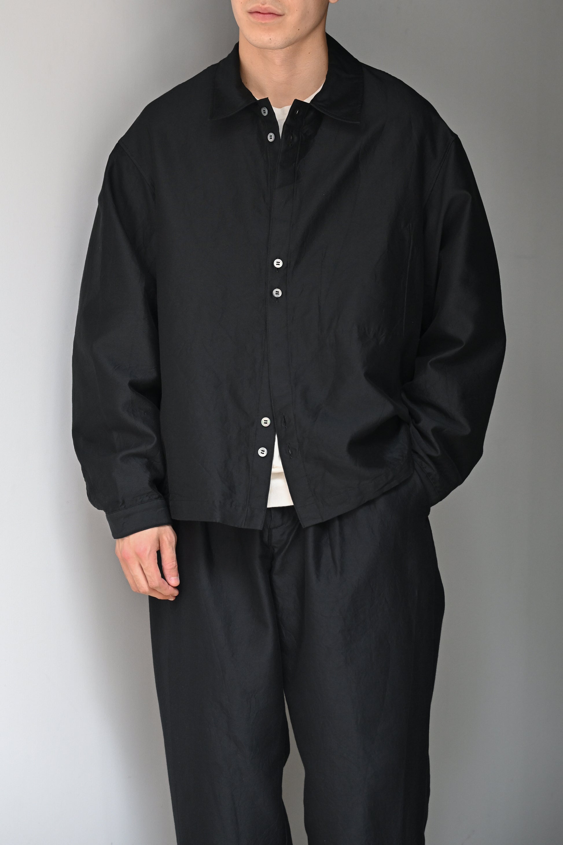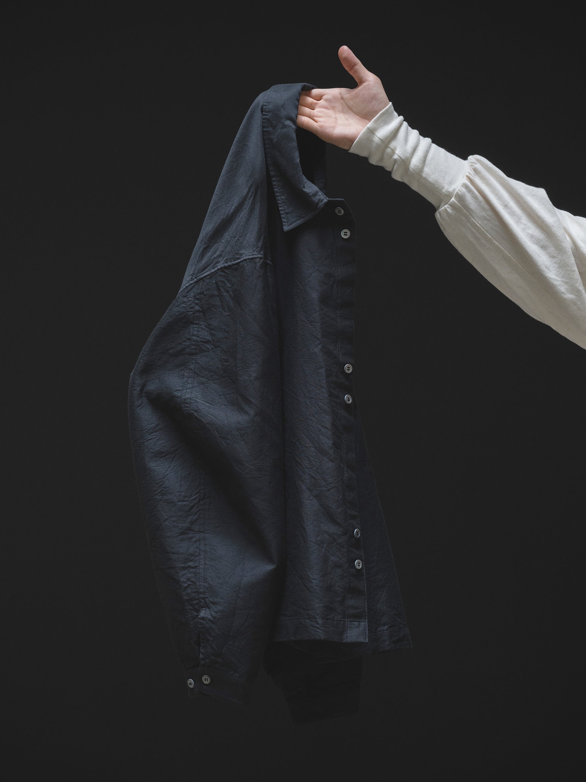 和製織物で作られるコットンシルクの二重織の規格。ソリッドな表面に反して裏面は微細に起毛したベビータッチ。シャツより軽やかながら、フォルムとデザインはブルゾン。西洋の服装史にある飾りを参考とした不規則な鈕配置が特徴のシャツブルゾンです。