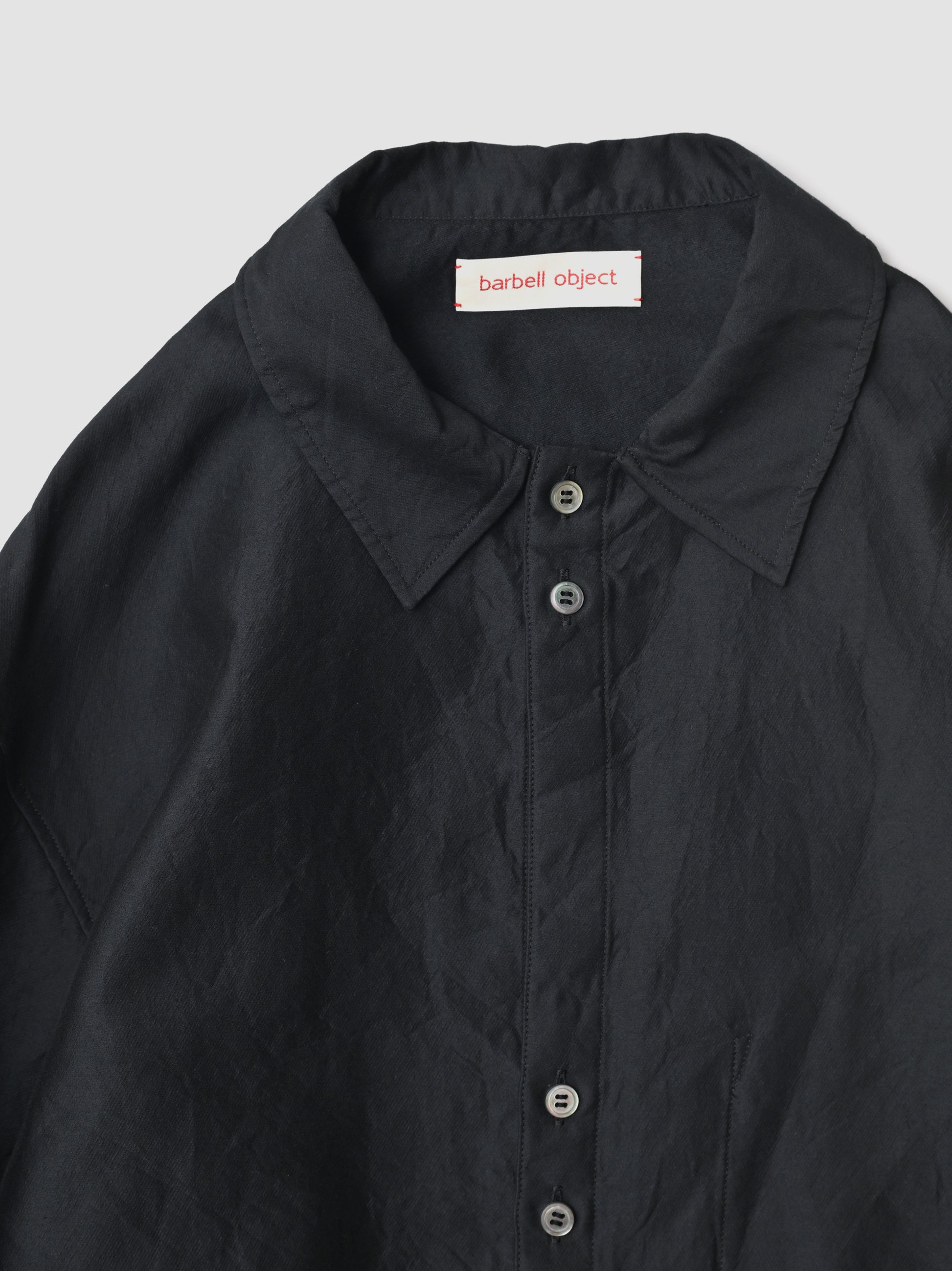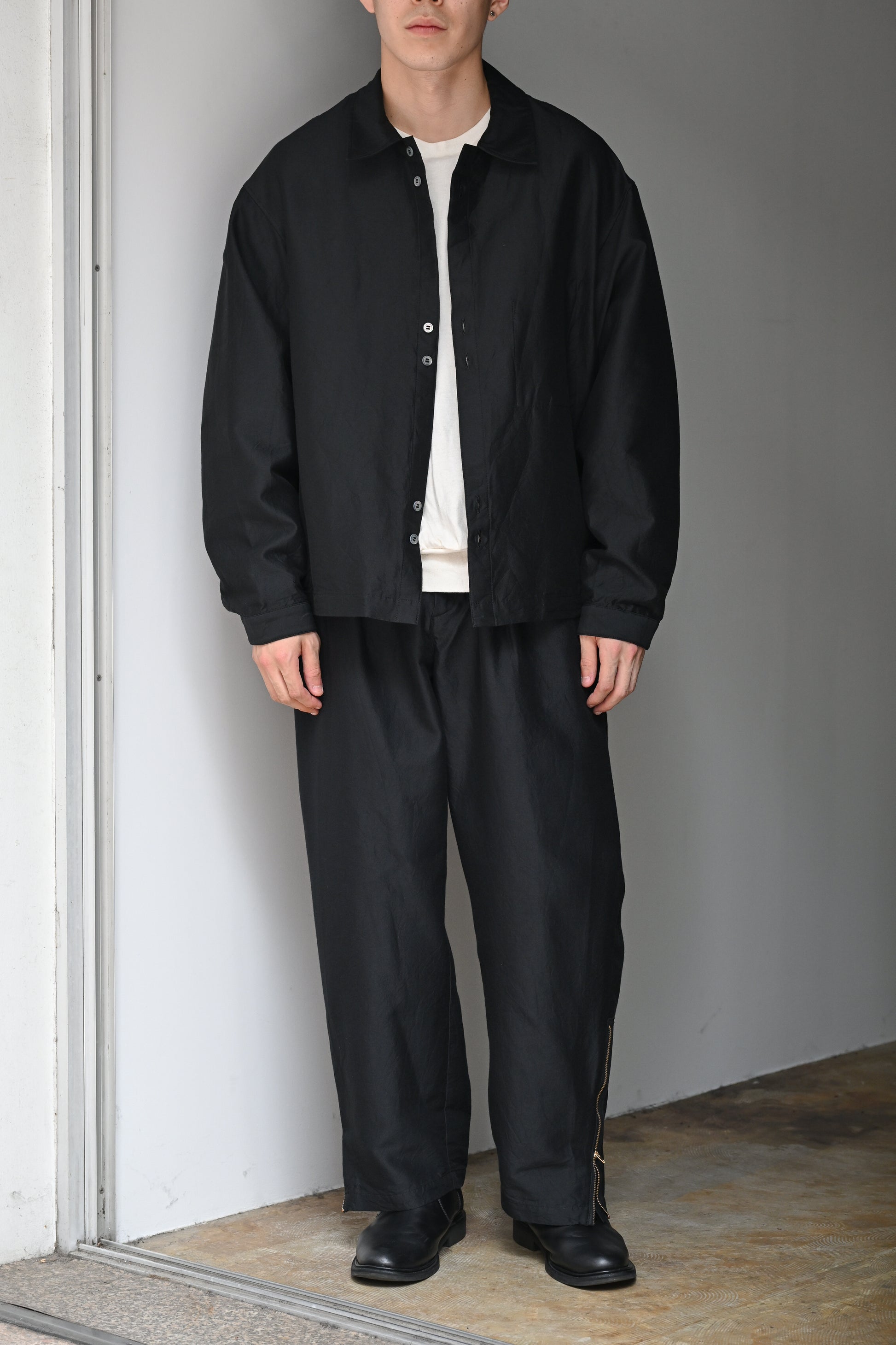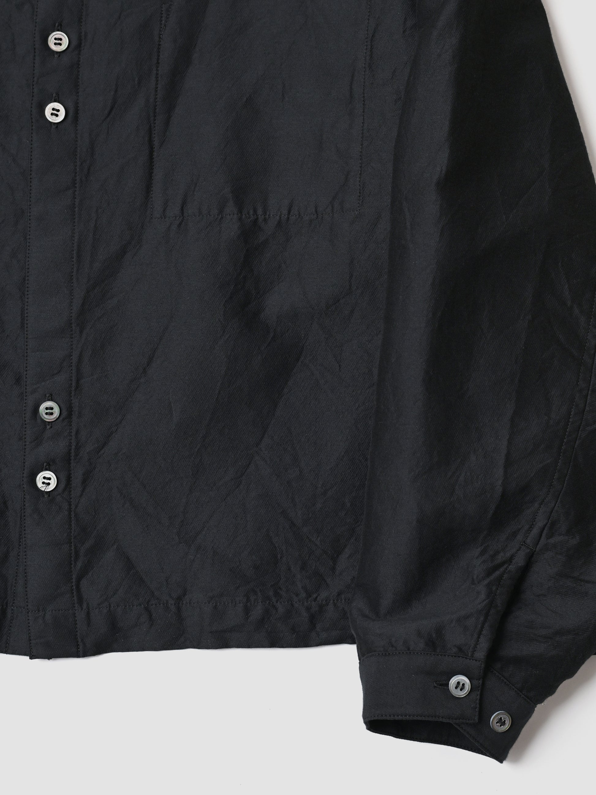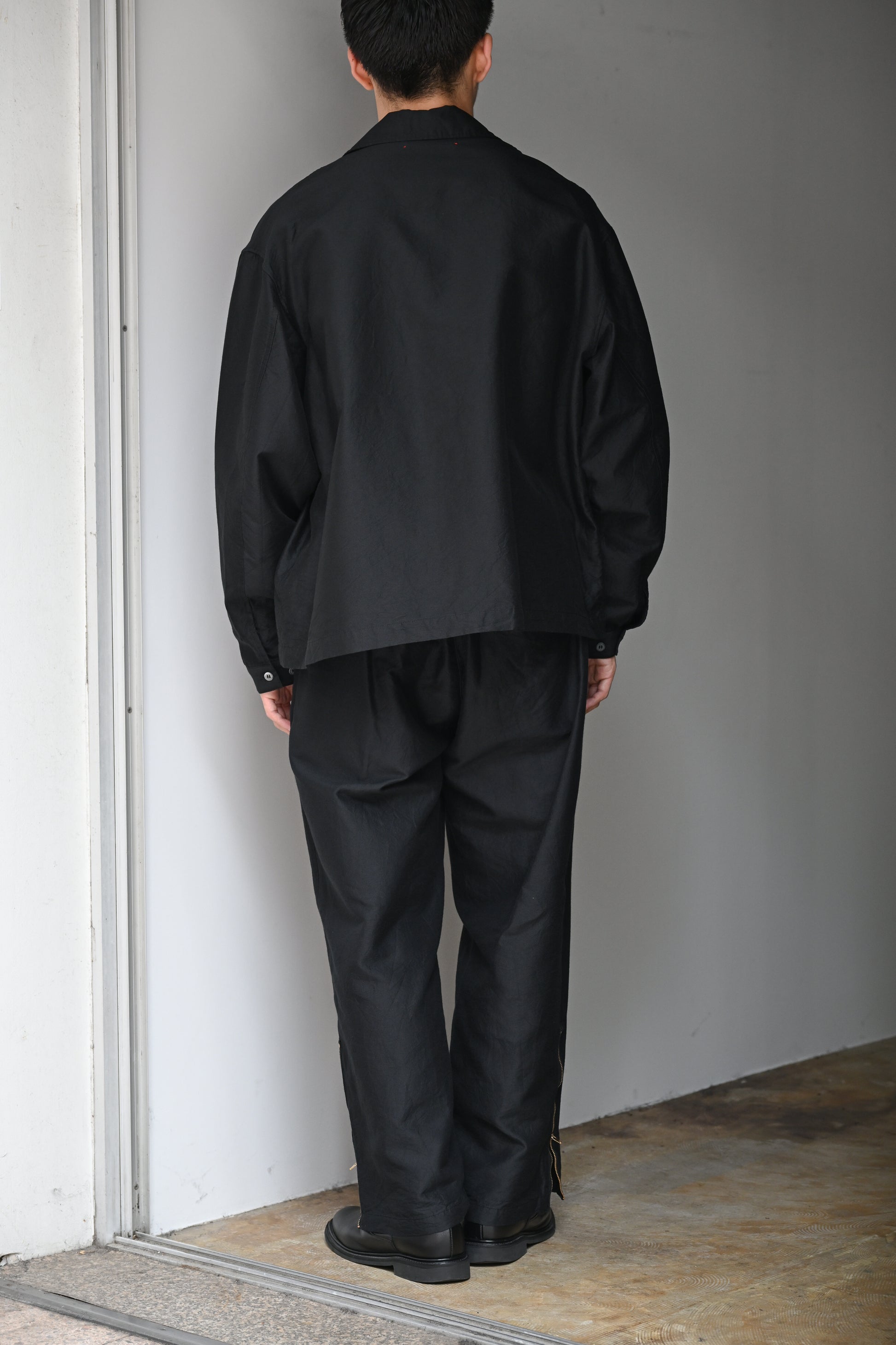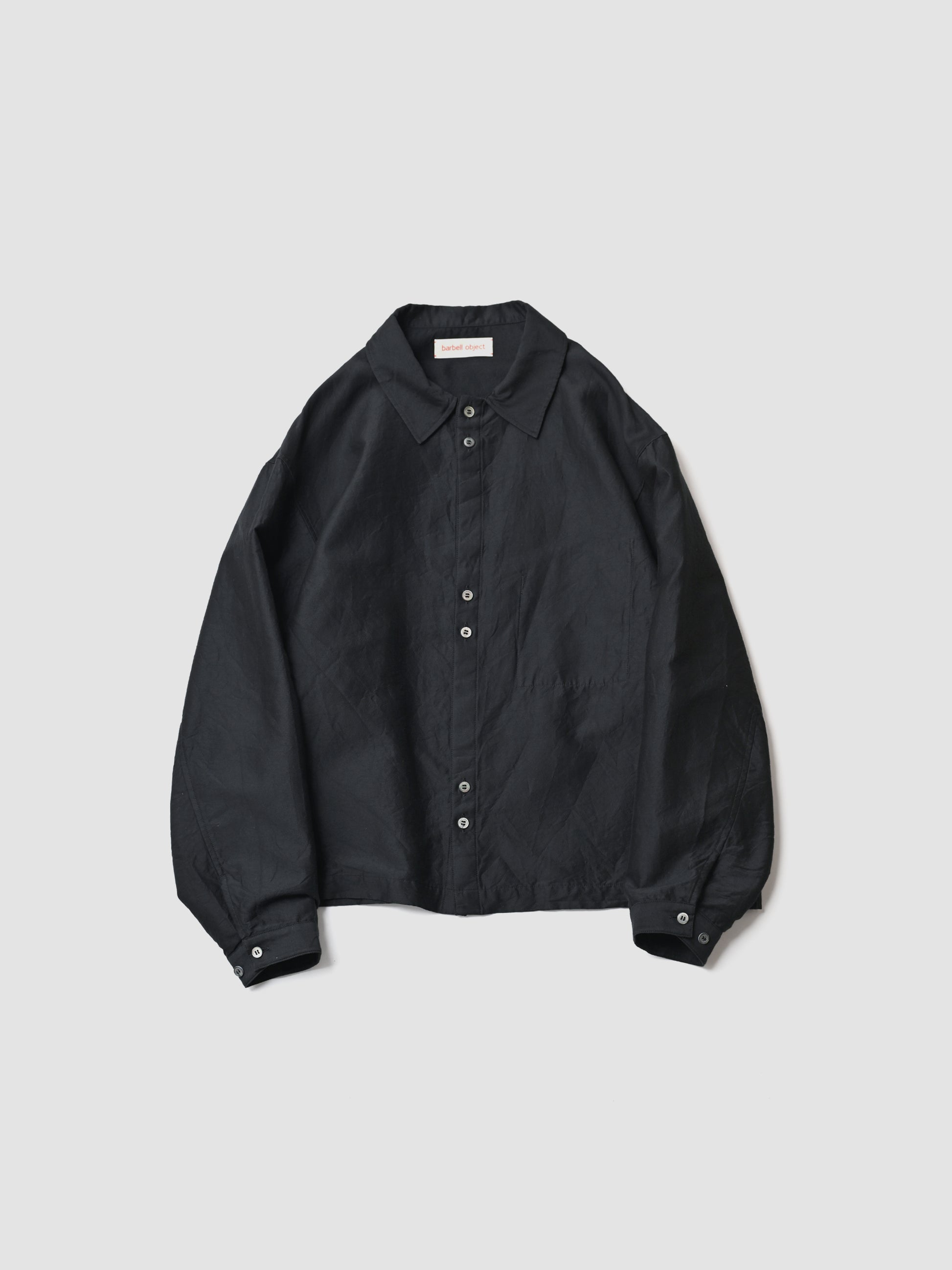 和製織物で作られるコットンシルクの二重織の規格。ソリッドな表面に反して裏面は微細に起毛したベビータッチ。シャツより軽やかながら、フォルムとデザインはブルゾン。西洋の服装史にある飾りを参考とした不規則な鈕配置が特徴のシャツブルゾンです。