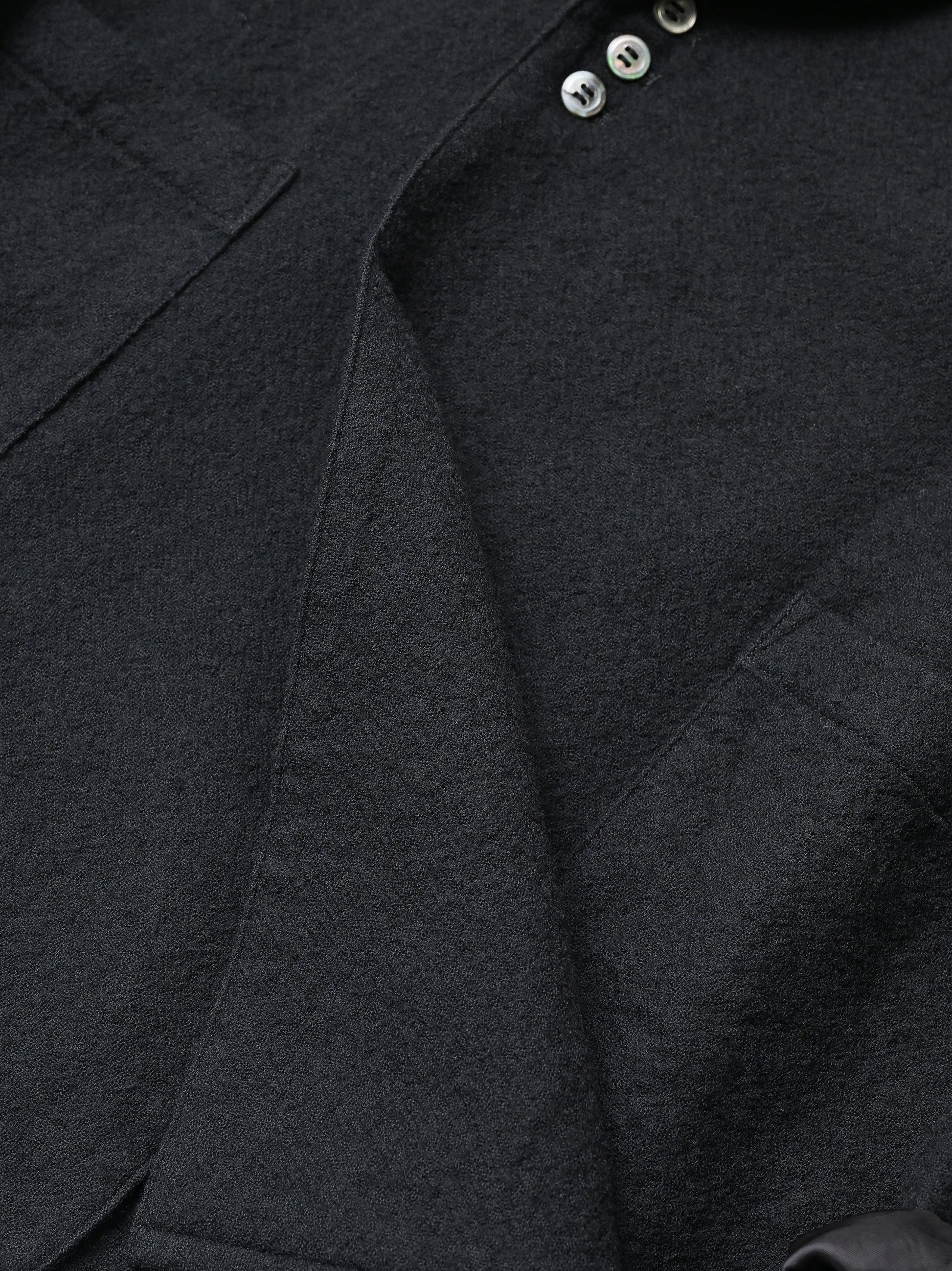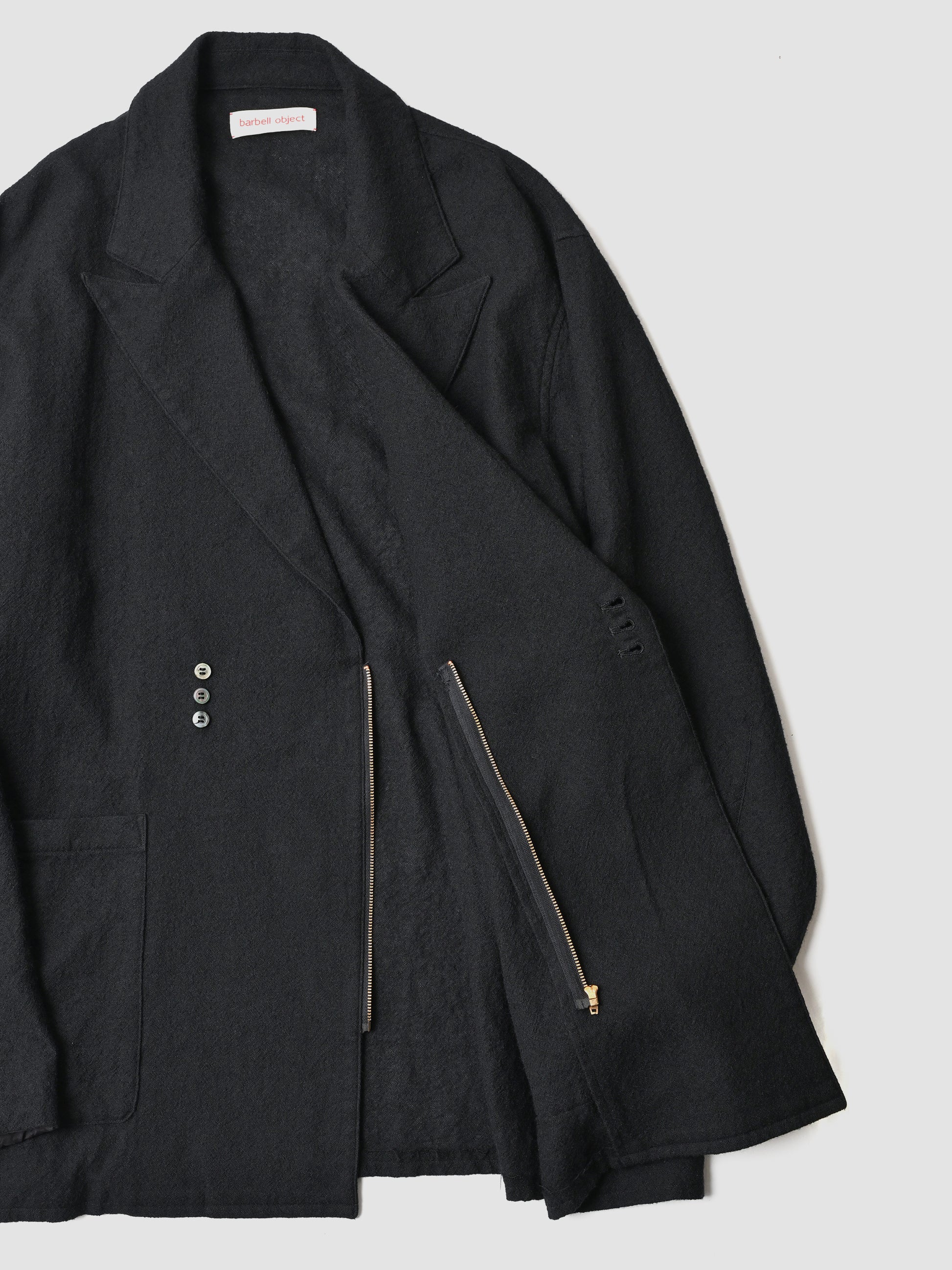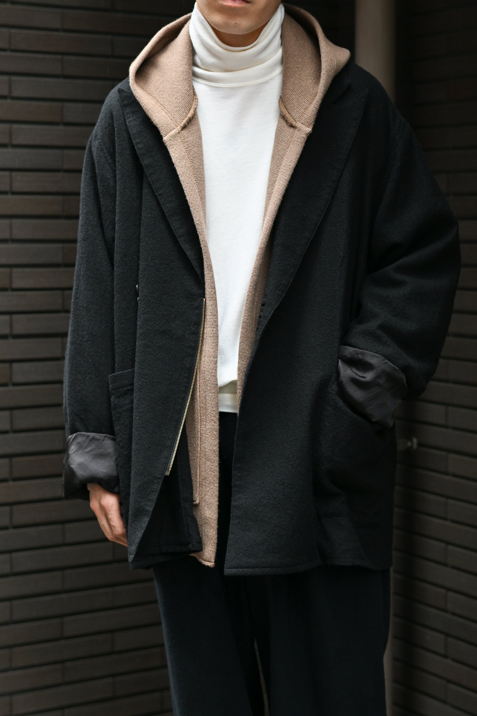 雰囲気ではなく、確かに空気を含んだ上着というテーマで作られた腿中程の着丈のテーラードジャケットを伸ばし、ボリュームをつけたチェスターコート。袖から裏地が噴き出るデザイン。袖捲りして雑多な感じ。それで良い感じです。
