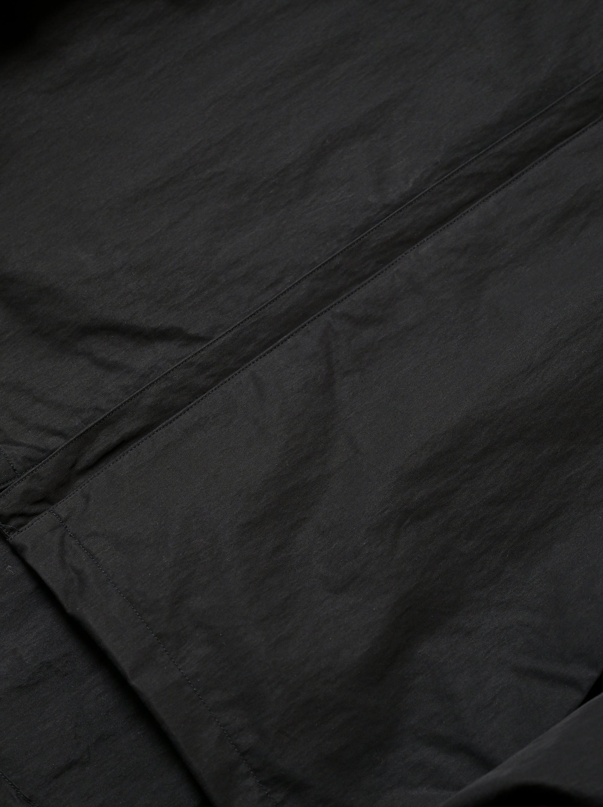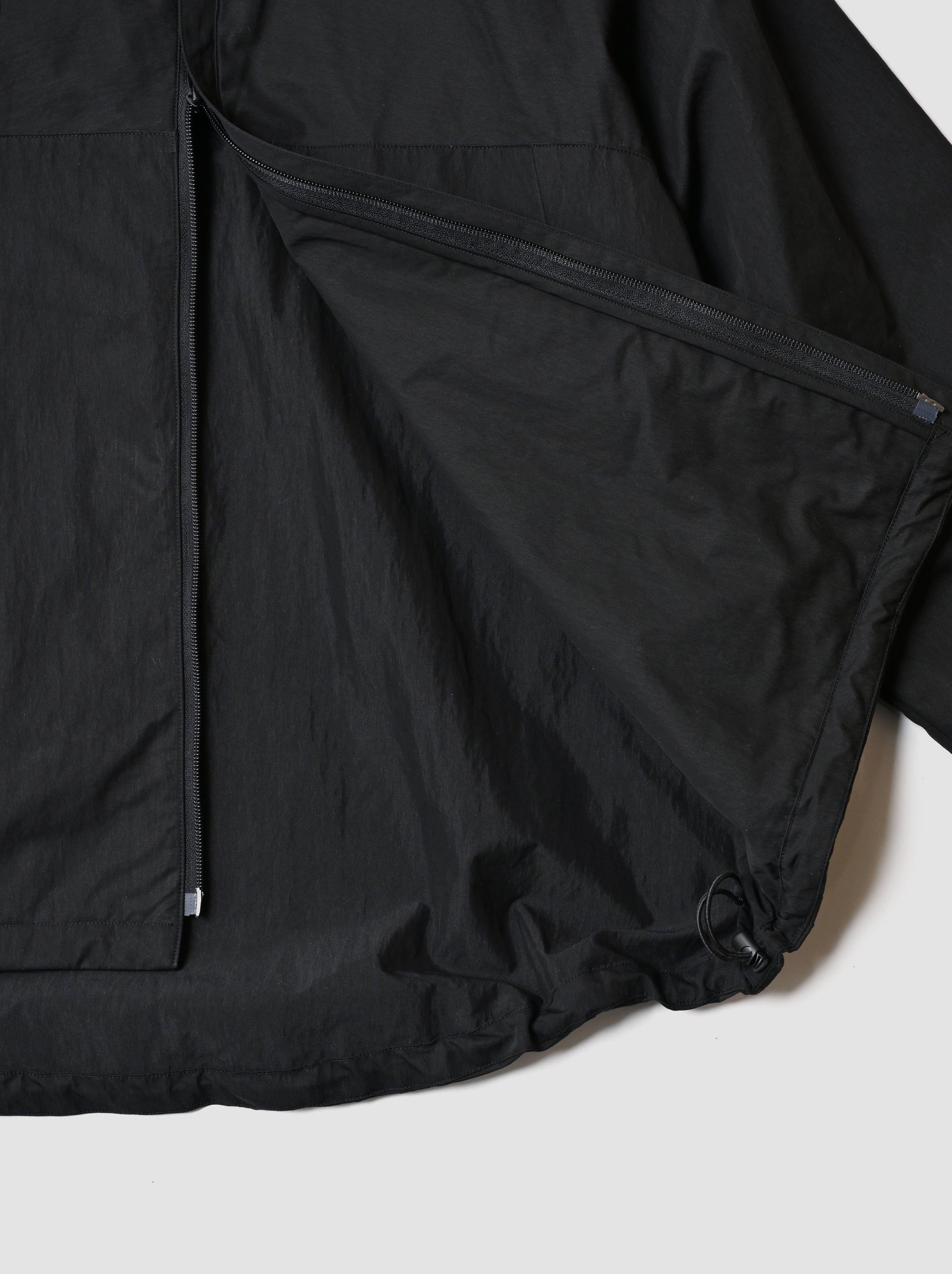 超高密度に織られた素材は経糸にコットン、緯糸にナイロンを使用した交織ツイル。それぞれ素材感は引き立ち、ややハリのあるタッチに撥水加工も施されています。ブルゾンのような見え方のフロントに対して後ろ見頃着丈は長くなり前後差のあるシルエットに。大きすぎずなバランスもインナー使いから春先の軽い羽織りとしても重宝する一着。