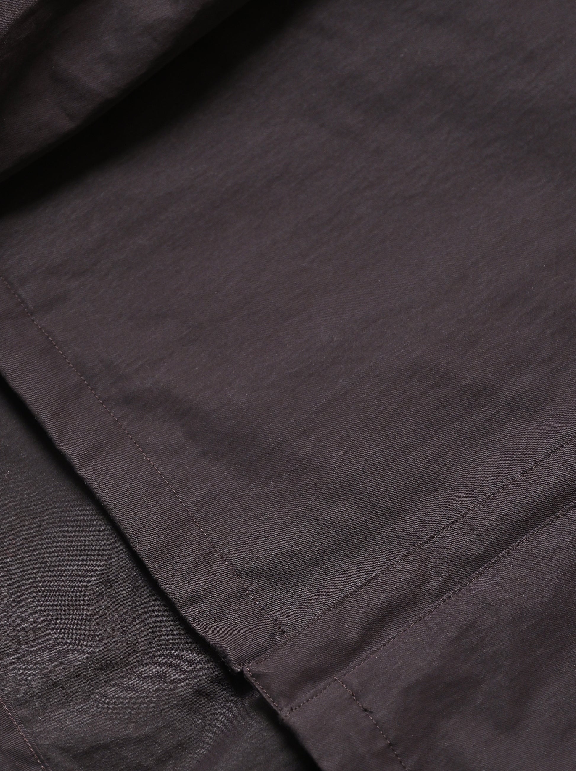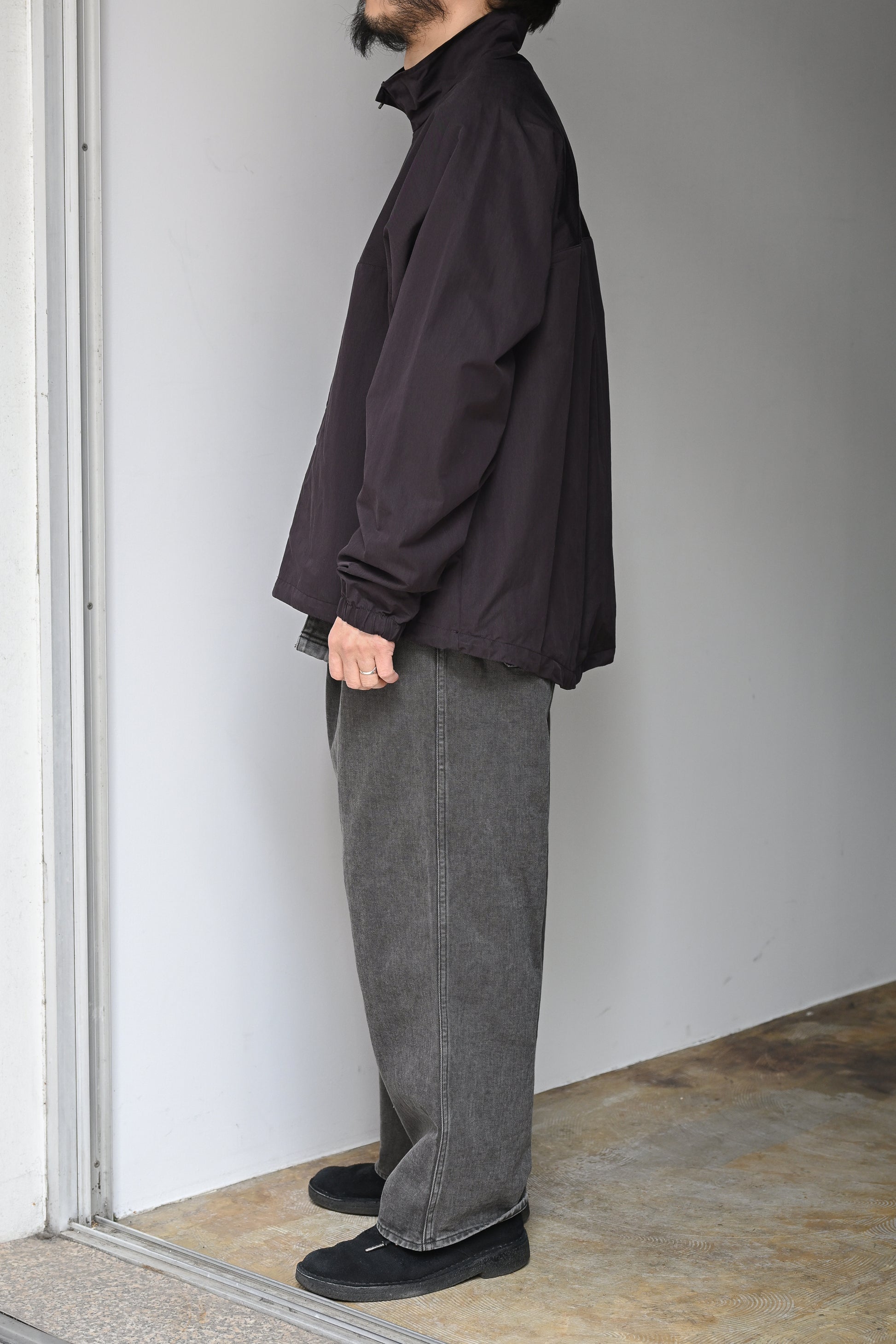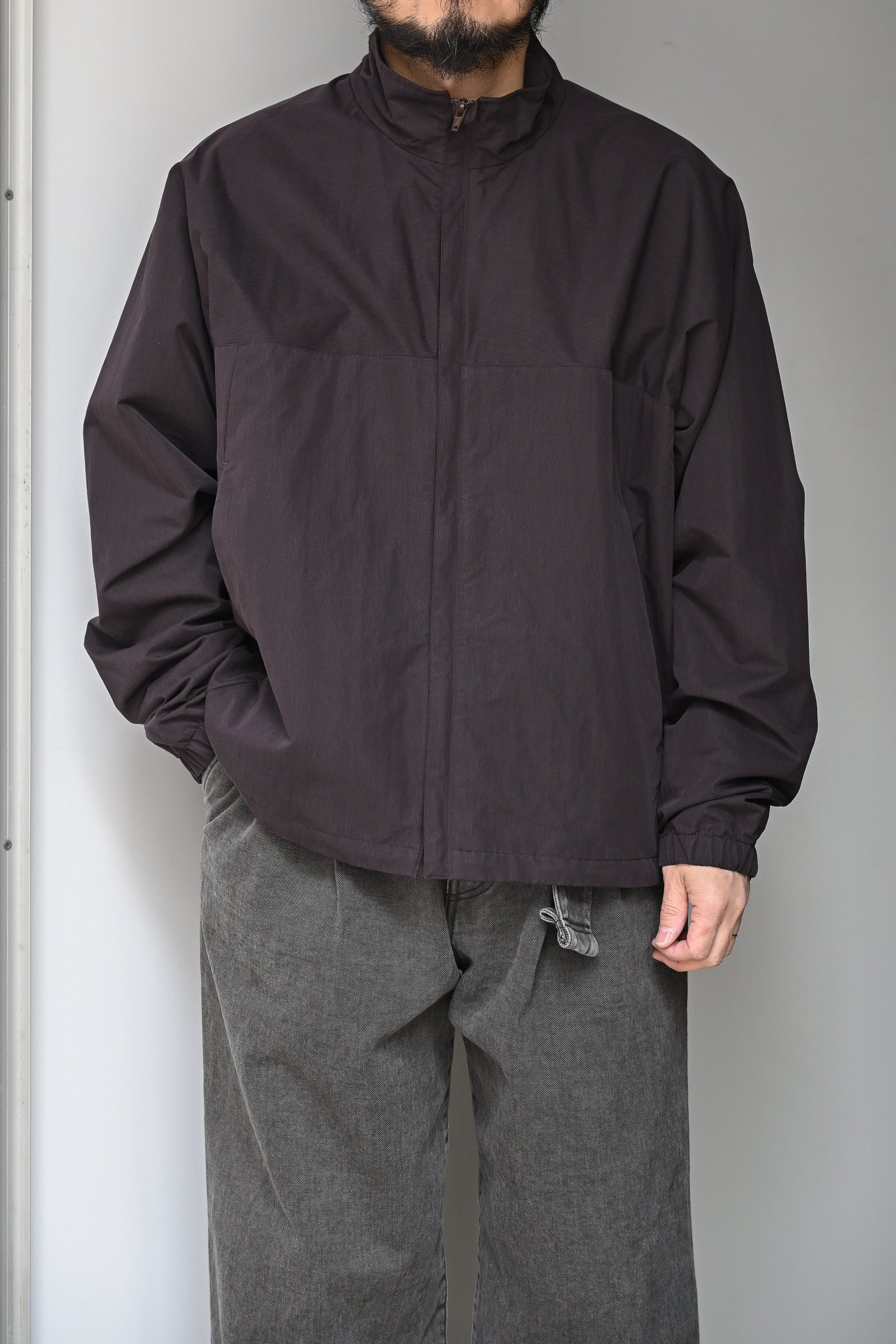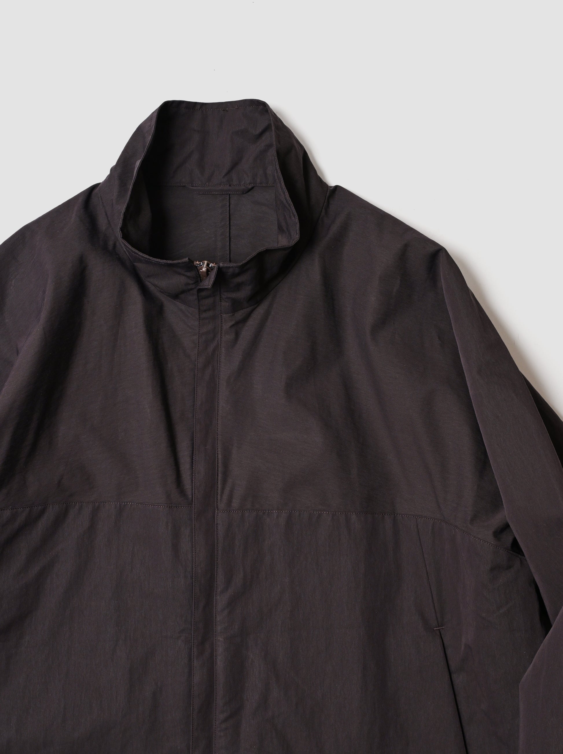 超高密度に織られた素材は経糸にコットン、緯糸にナイロンを使用した交織ツイル。それぞれ素材感は引き立ち、ややハリのあるタッチに撥水加工も施されています。ブルゾンのような見え方のフロントに対して後ろ見頃着丈は長くなり前後差のあるシルエットに。大きすぎずなバランスもインナー使いから春先の軽い羽織りとしても重宝する一着。
