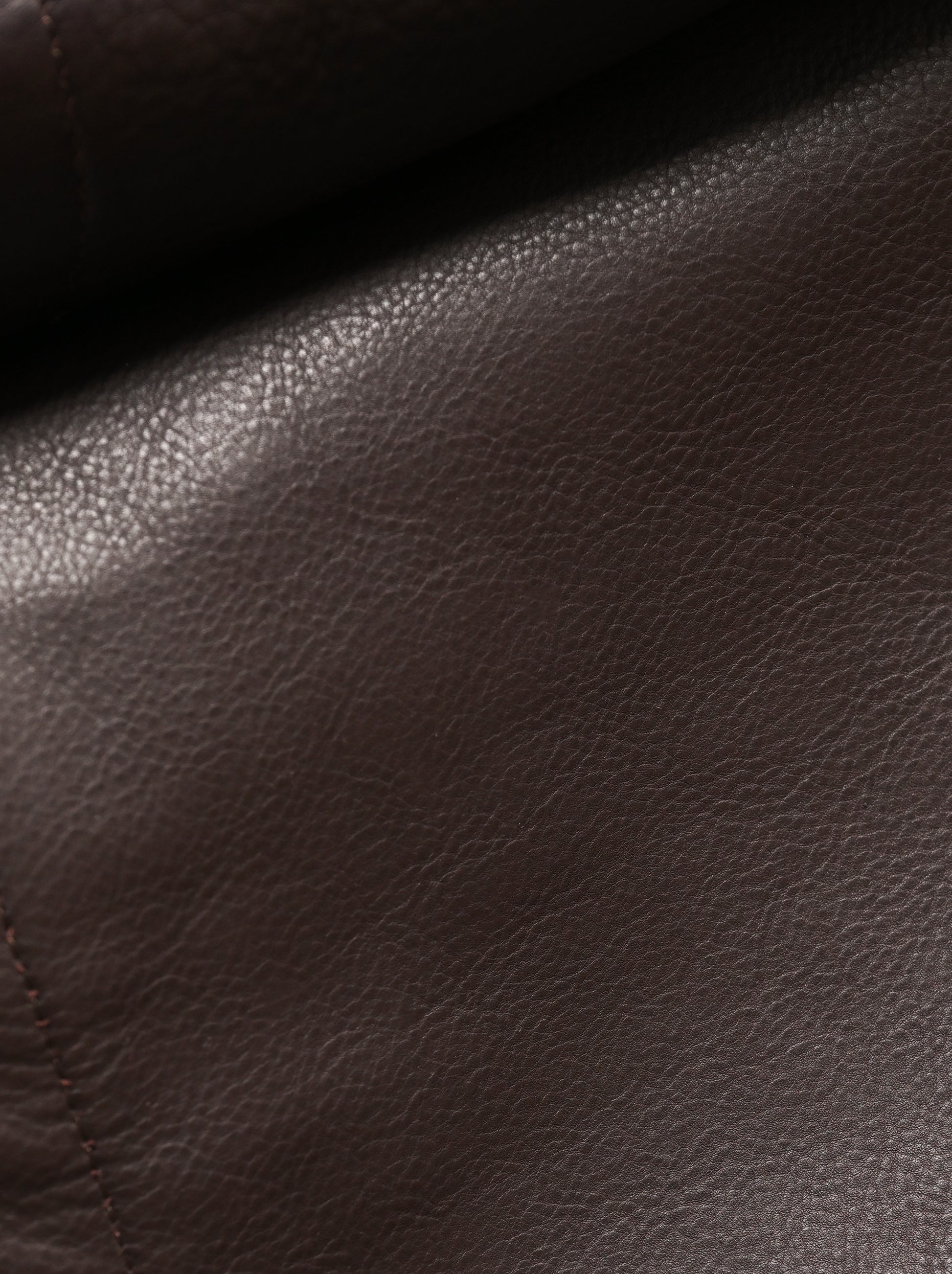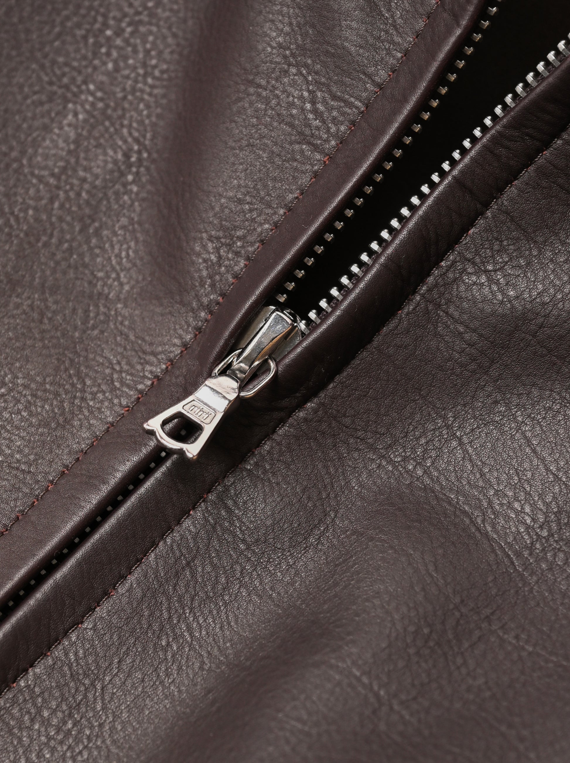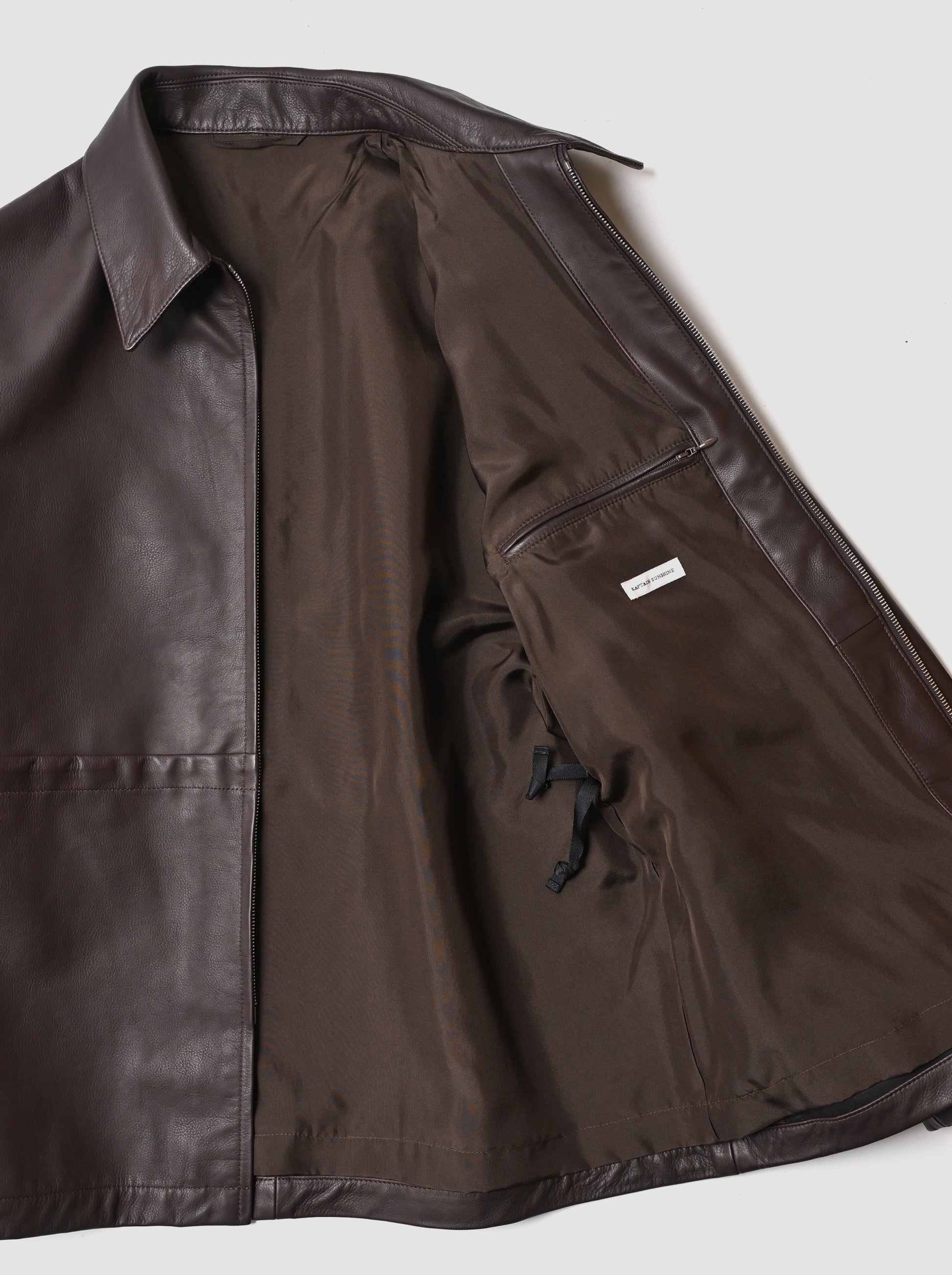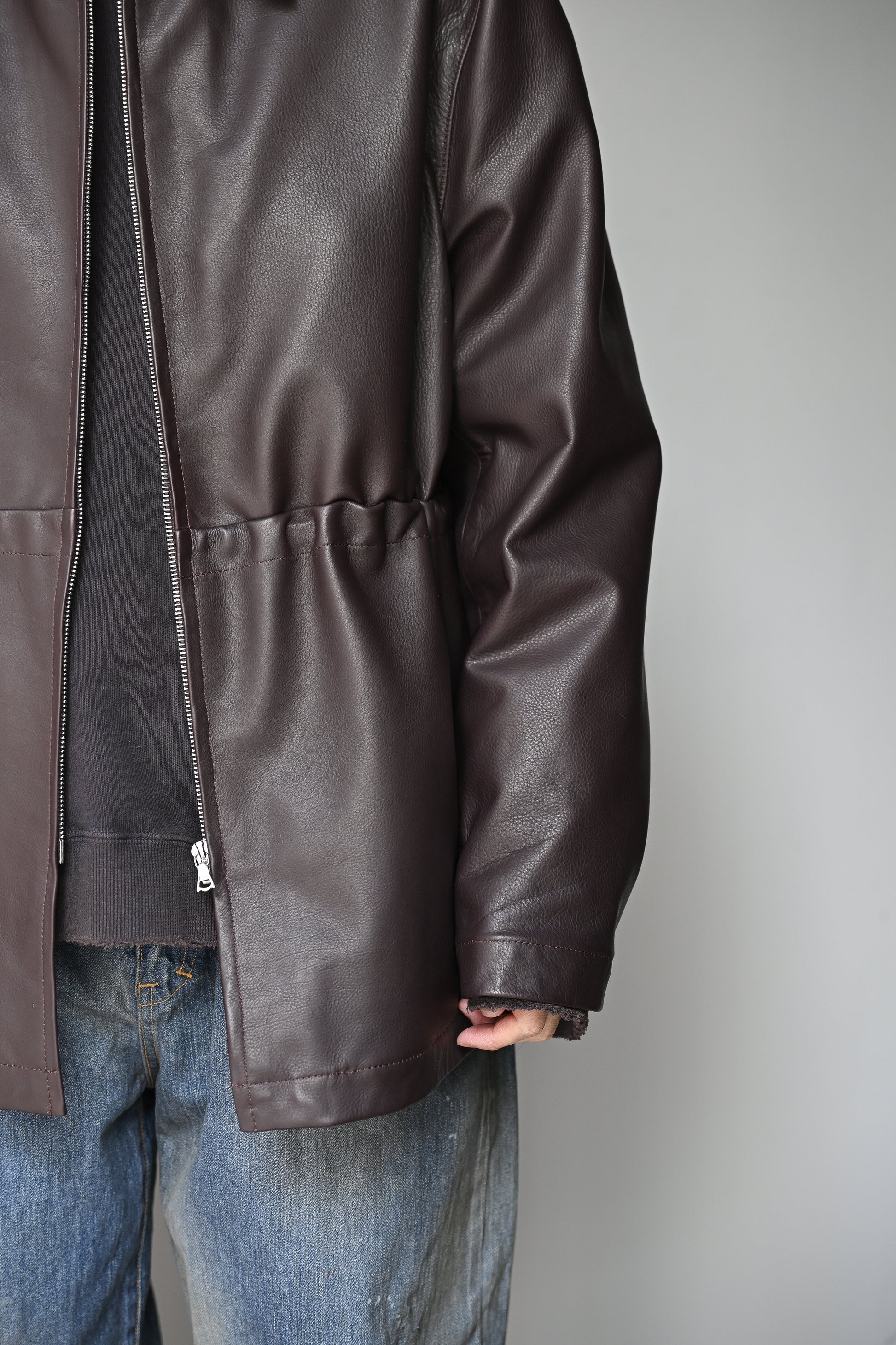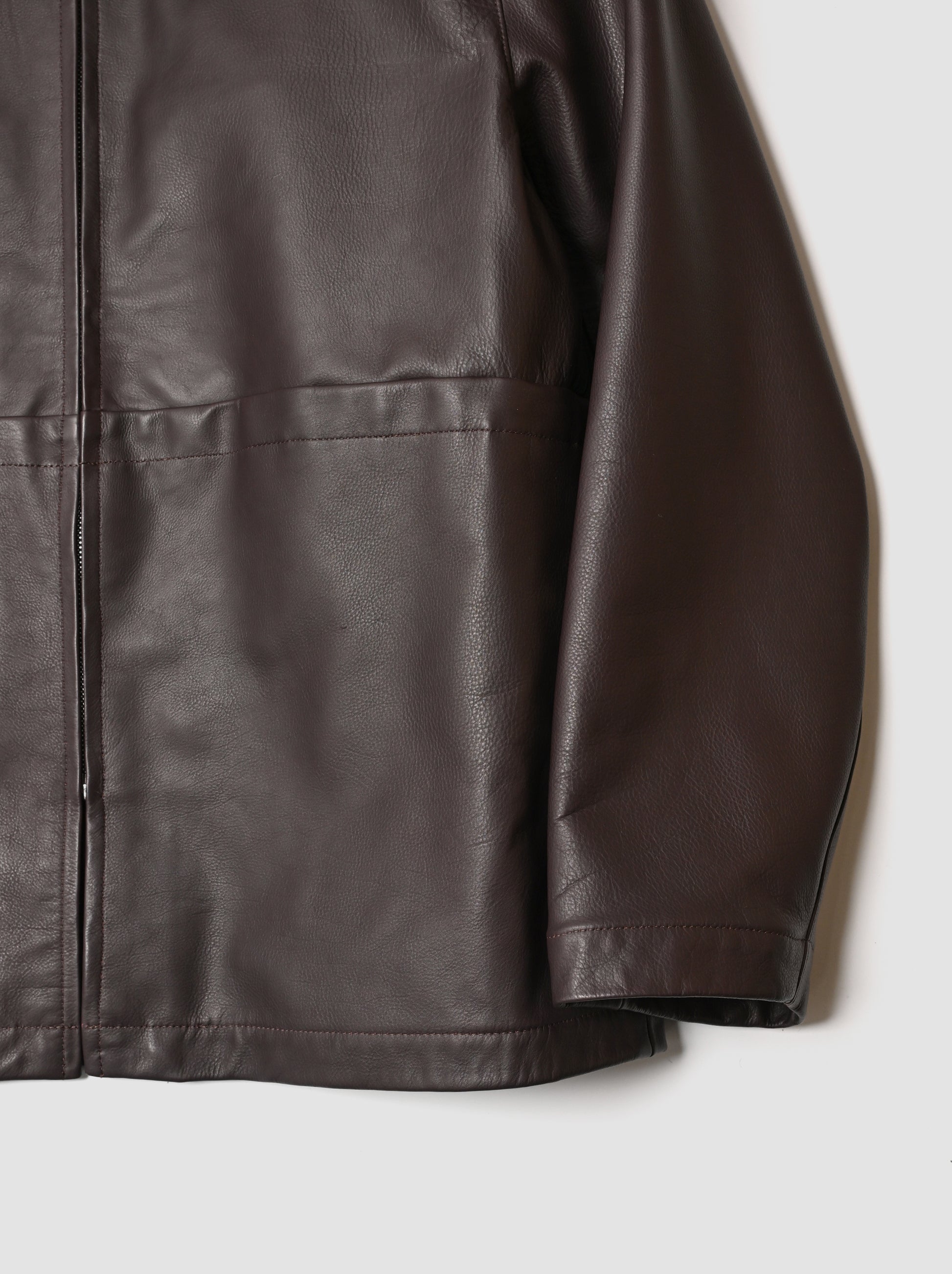やや赤みと深みあるブラウンのジップジャケットはシープスキンを使用。フランスの原皮を使っておりシボの表情や風合いの良さが感じ取れます。内ポケットは両胸に2箇所、ウエストにはドローコードがつき、絞って印象も変えれます。個人的には絞った雰囲気好きです。柔らかく着心地もとても良いので、是非実際に袖を通していただきたいです。