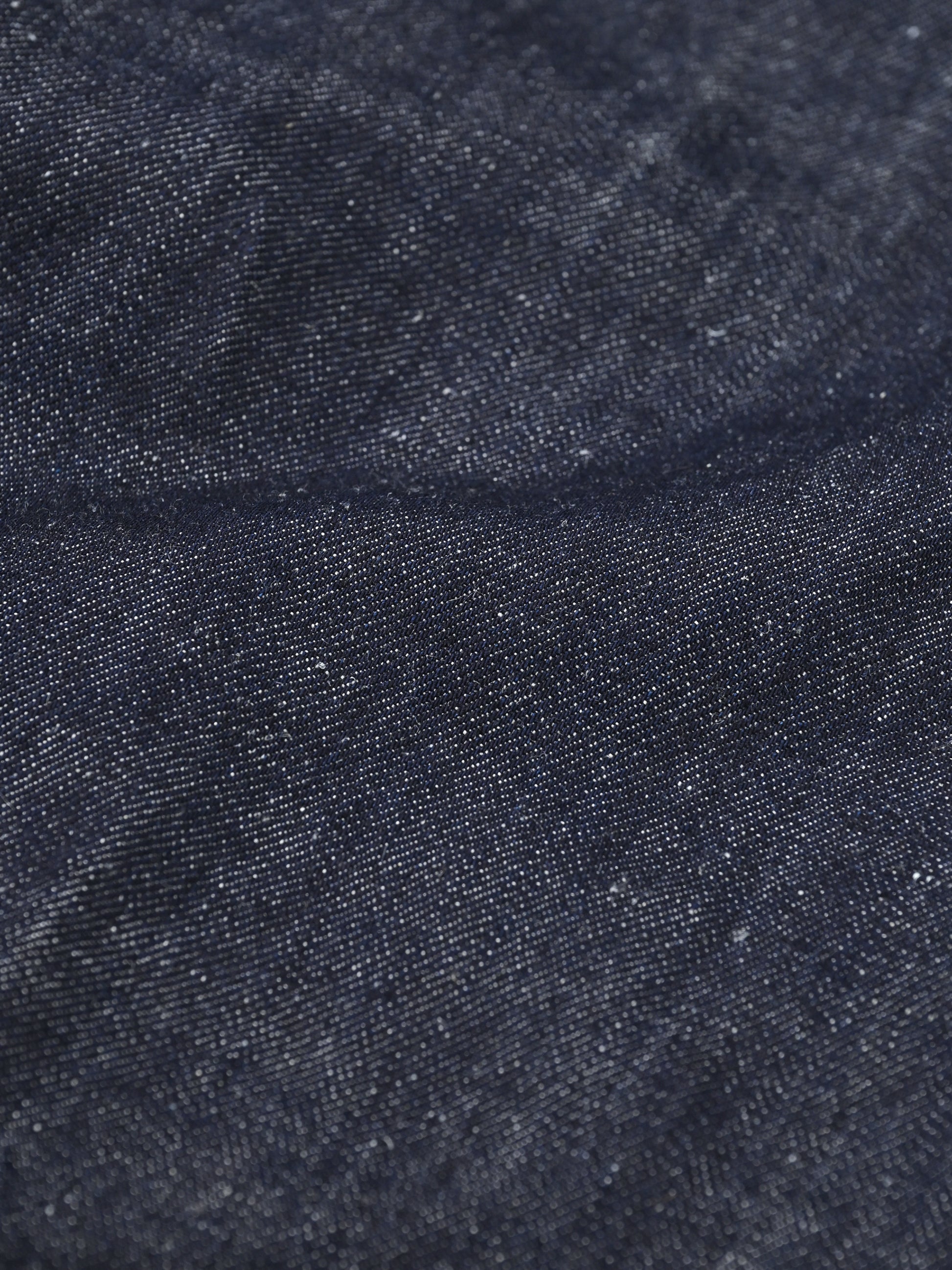 オリジナルとなるデニム生地は、経糸にオーガニックコットンをインディゴで中白染め、緯糸には大麻を用いており、岡山県井原市で織り上げています。交織ゆえにコットンと大麻それぞれの質感をしっかり感じられ、着用と洗濯から色落ちはもちろん、柔軟性も加わり、着心地の変化も楽しみな一本。程良い厚みはオールシーズン着用も可能です。
