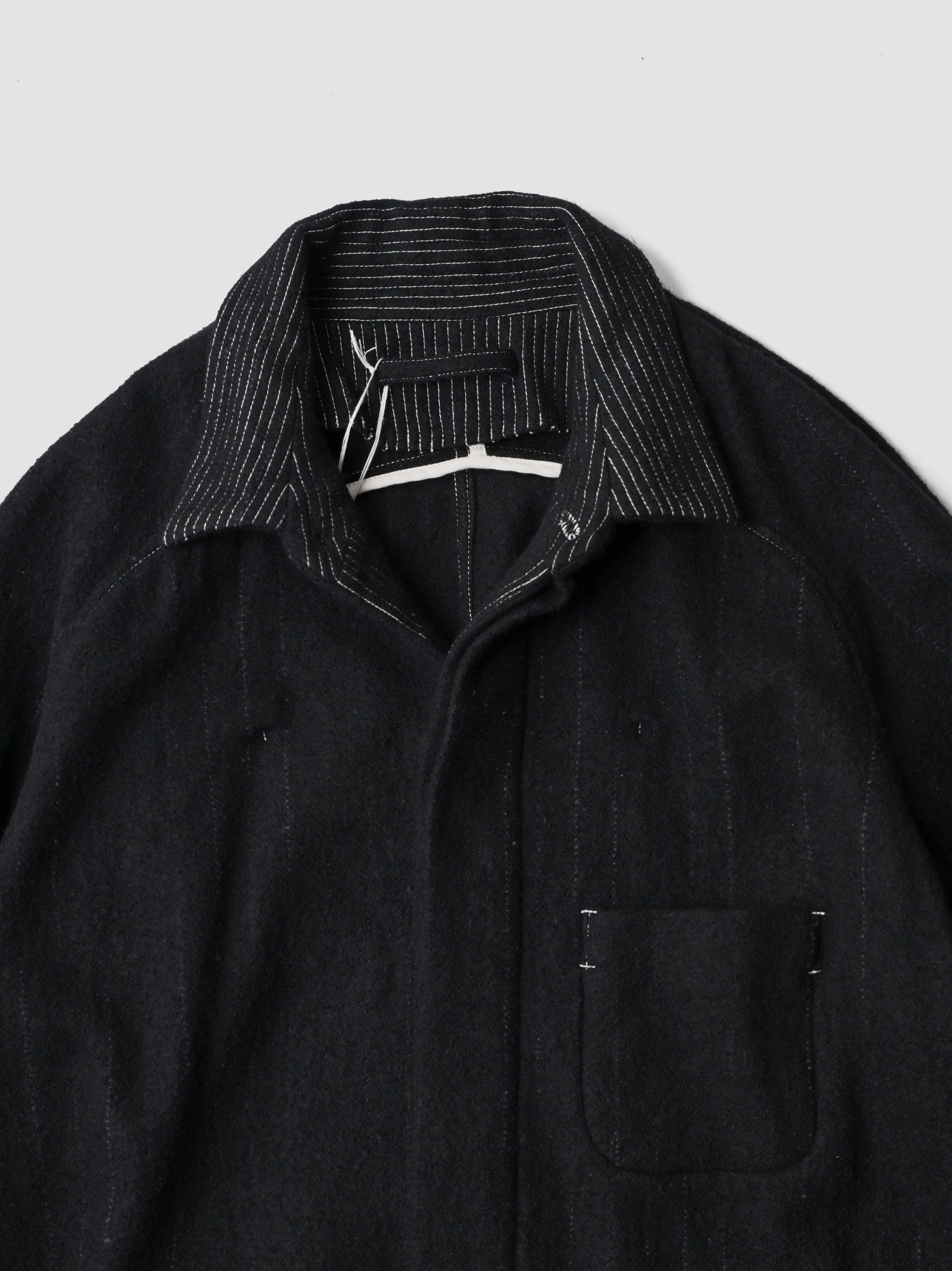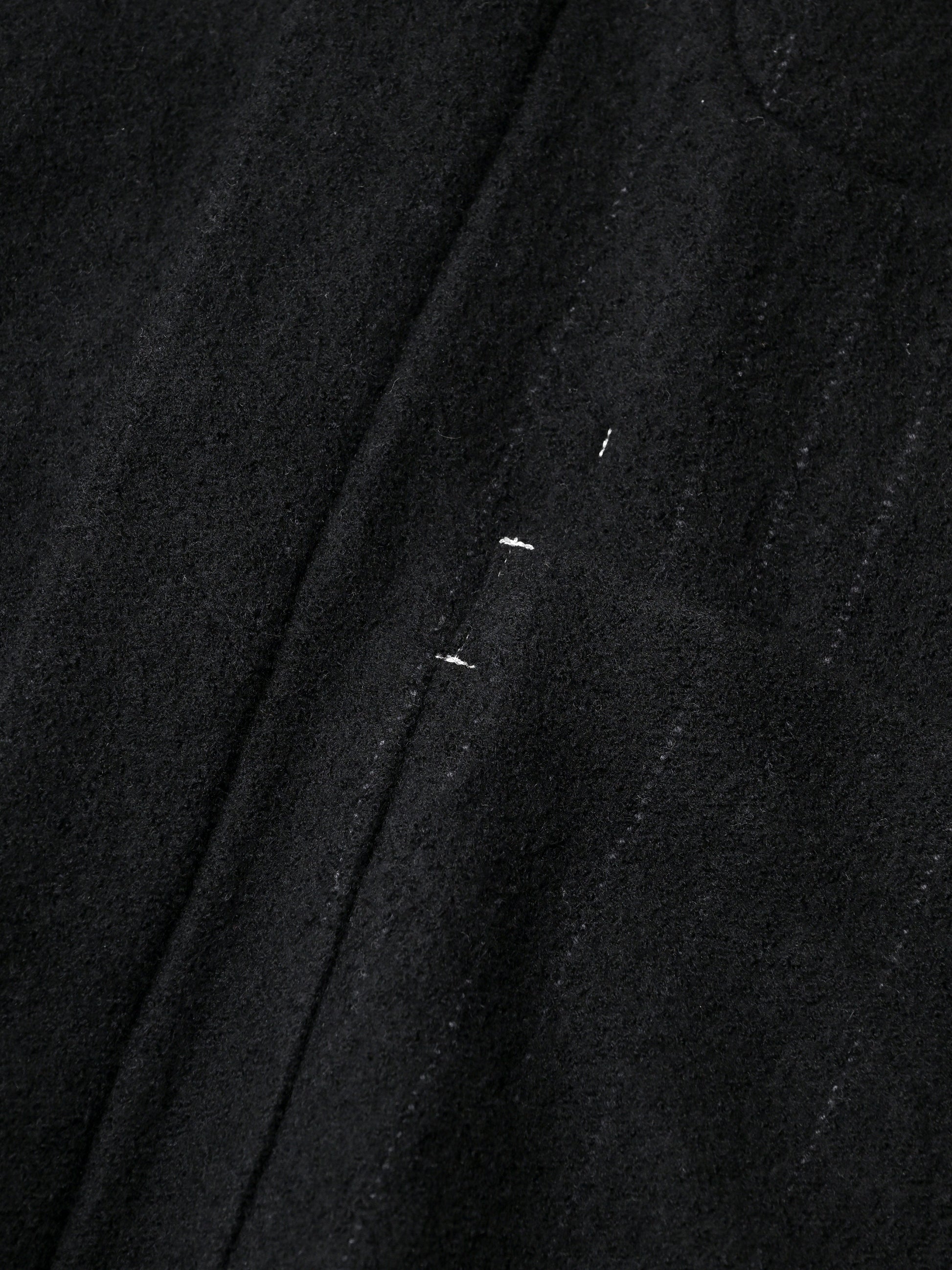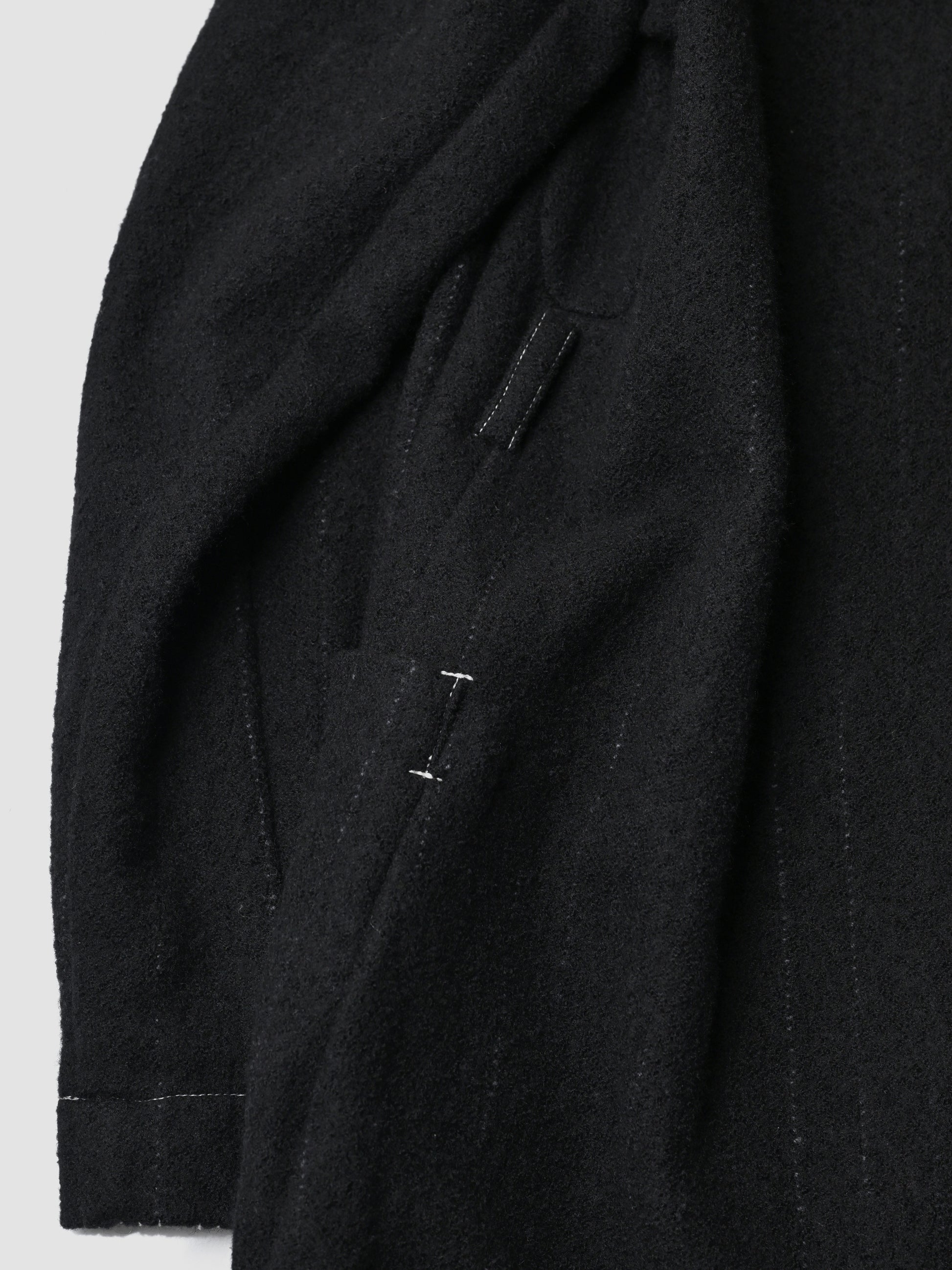 起毛させたウールブークレに、チョークストライプを模したステッチワークを不規則に施した起毛のウールサキソニーのコンビネーション。ハンドワークで繋ぎ合わせ、いやおなしにまとまった一作。裏地も顔料プリントからの絞染。アルチザンの佇まいは見事。理由を求められる時代になってきましたが、その理由は確かに宿しており、とはいえ、そう気構える必要無いほど、ディテールは気を利かせており、デザイナーのホスピタルもアイデンティティも感じられる仕上がりです。何より雰囲気がとても良い。