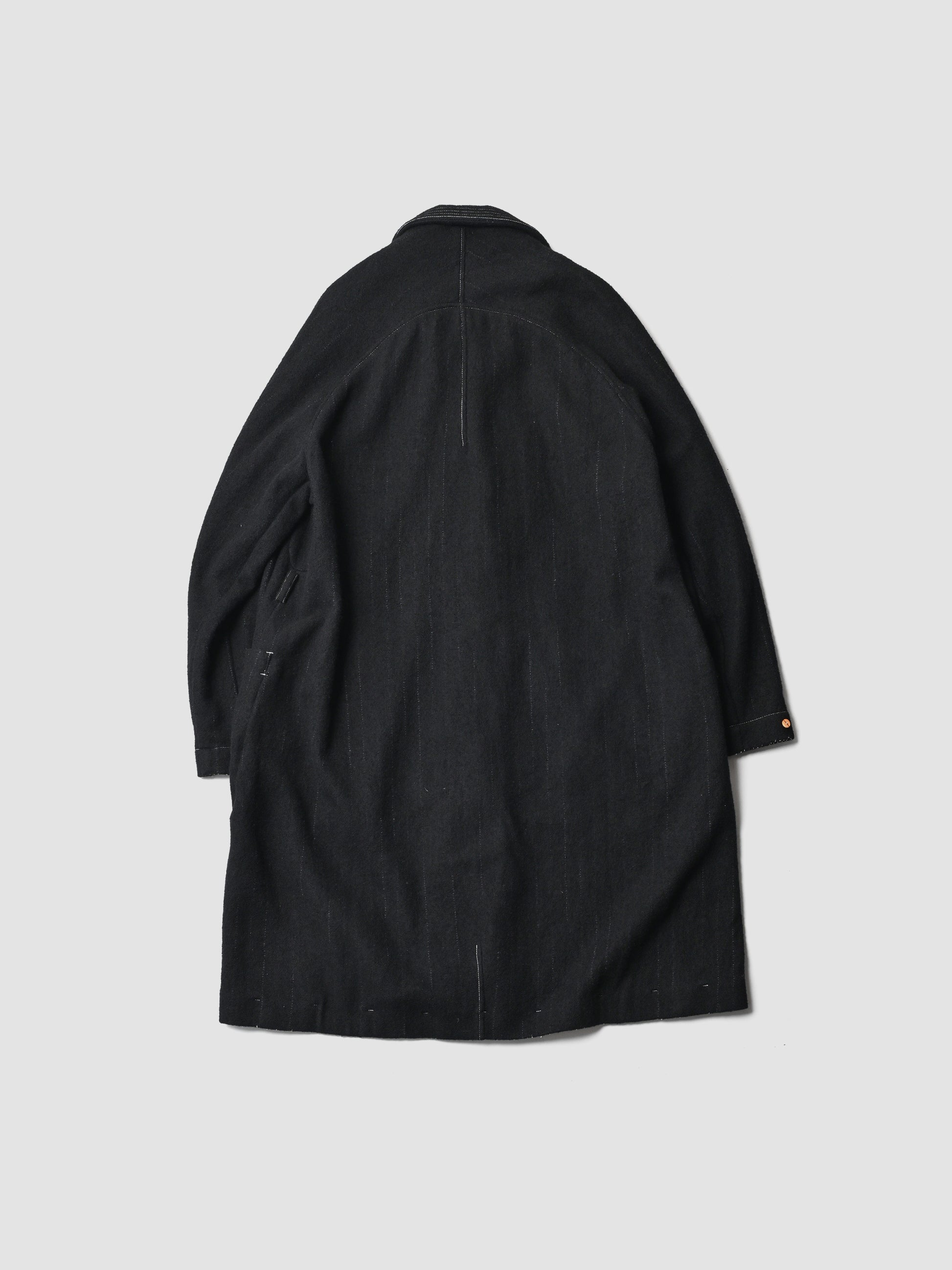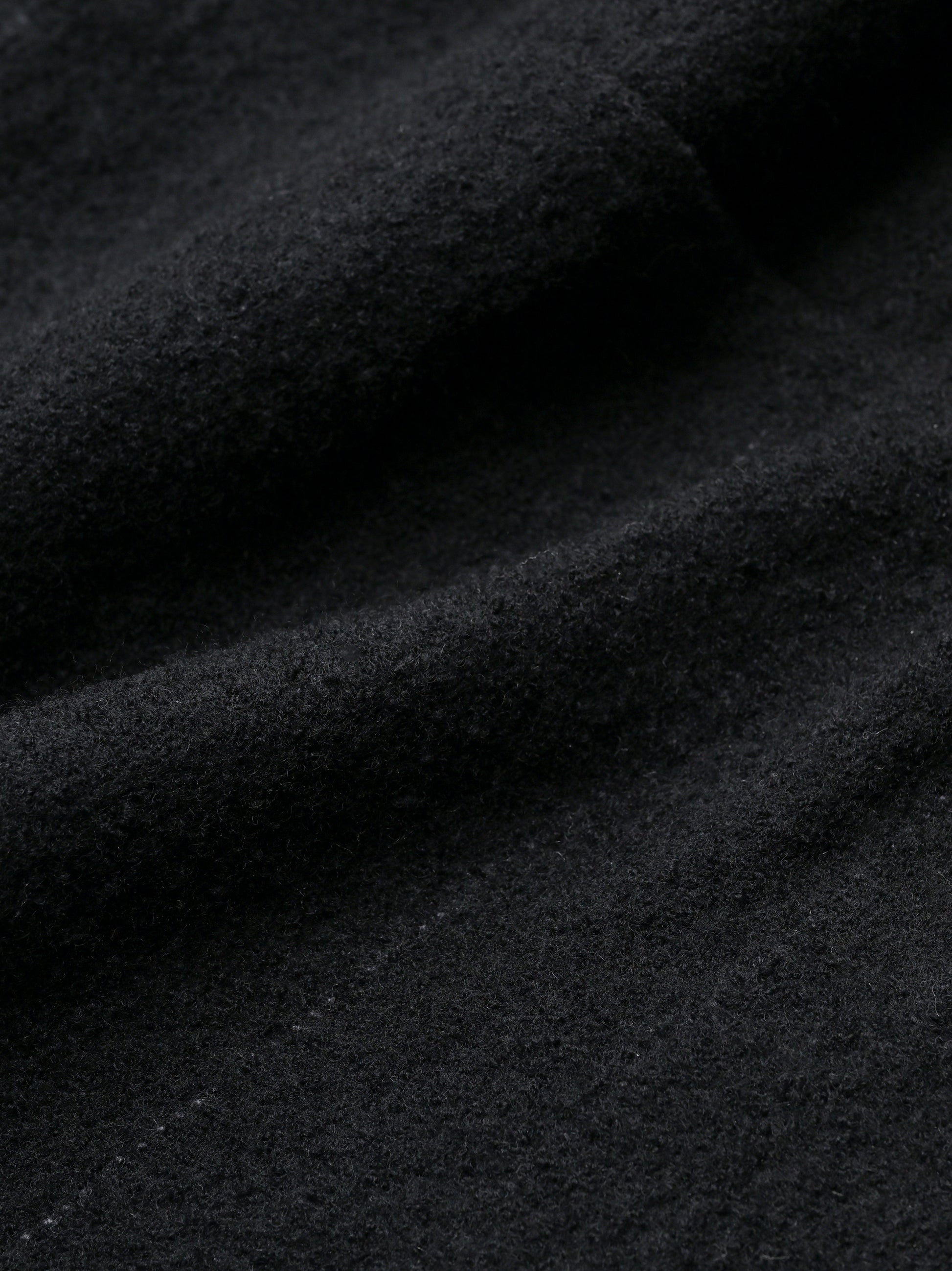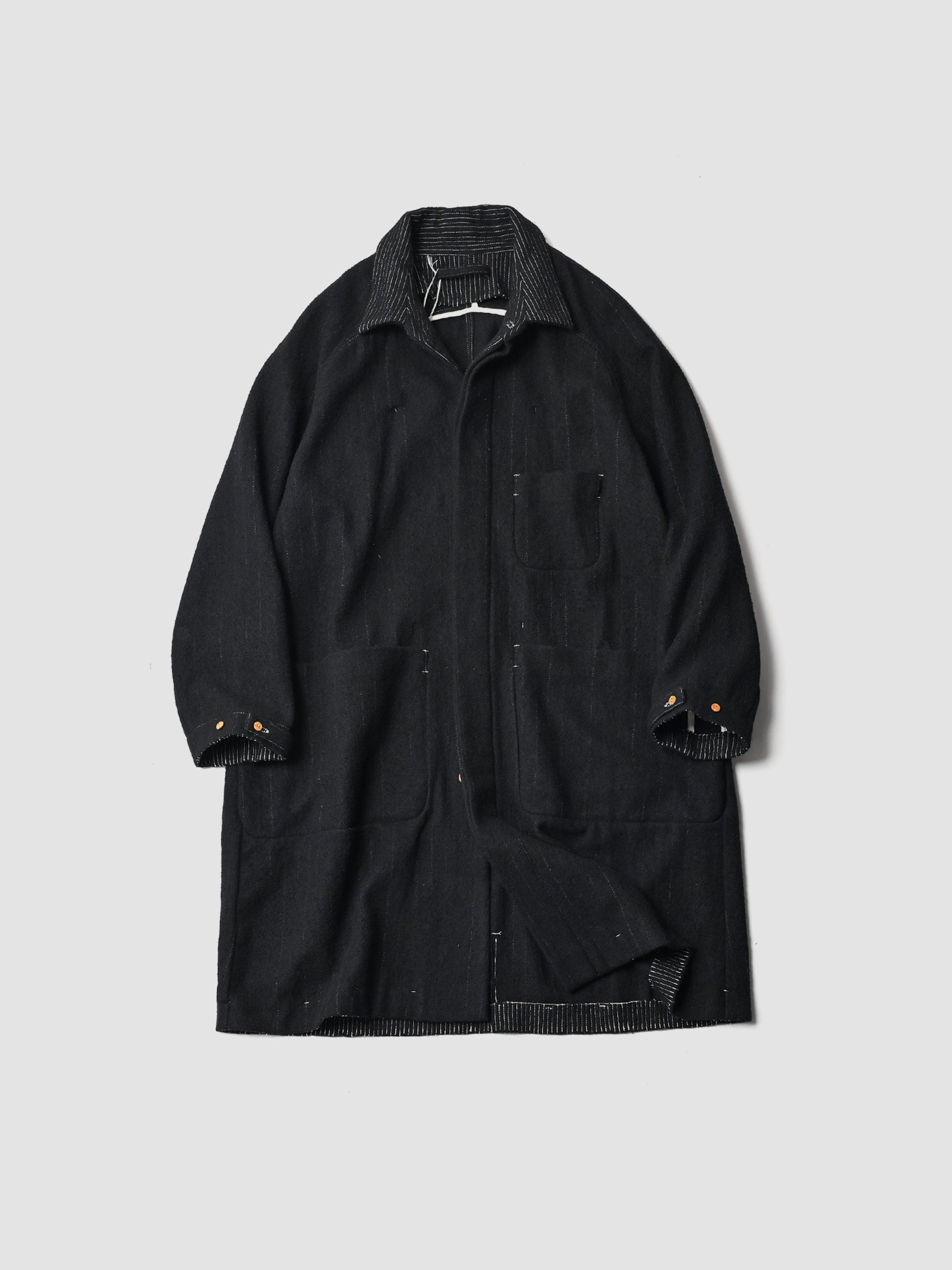 起毛させたウールブークレに、チョークストライプを模したステッチワークを不規則に施した起毛のウールサキソニーのコンビネーション。ハンドワークで繋ぎ合わせ、いやおなしにまとまった一作。裏地も顔料プリントからの絞染。アルチザンの佇まいは見事。理由を求められる時代になってきましたが、その理由は確かに宿しており、とはいえ、そう気構える必要無いほど、ディテールは気を利かせており、デザイナーのホスピタルもアイデンティティも感じられる仕上がりです。何より雰囲気がとても良い。