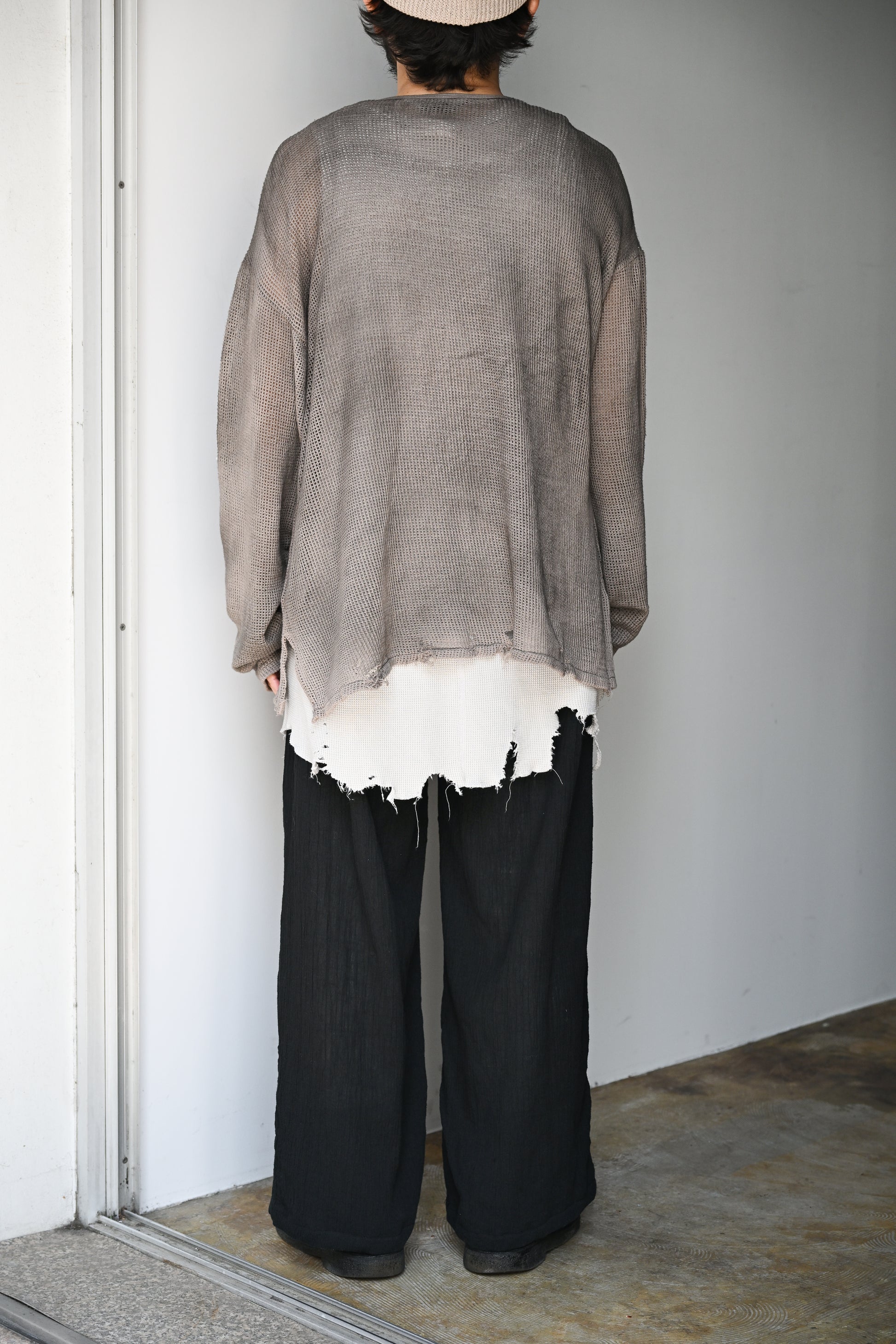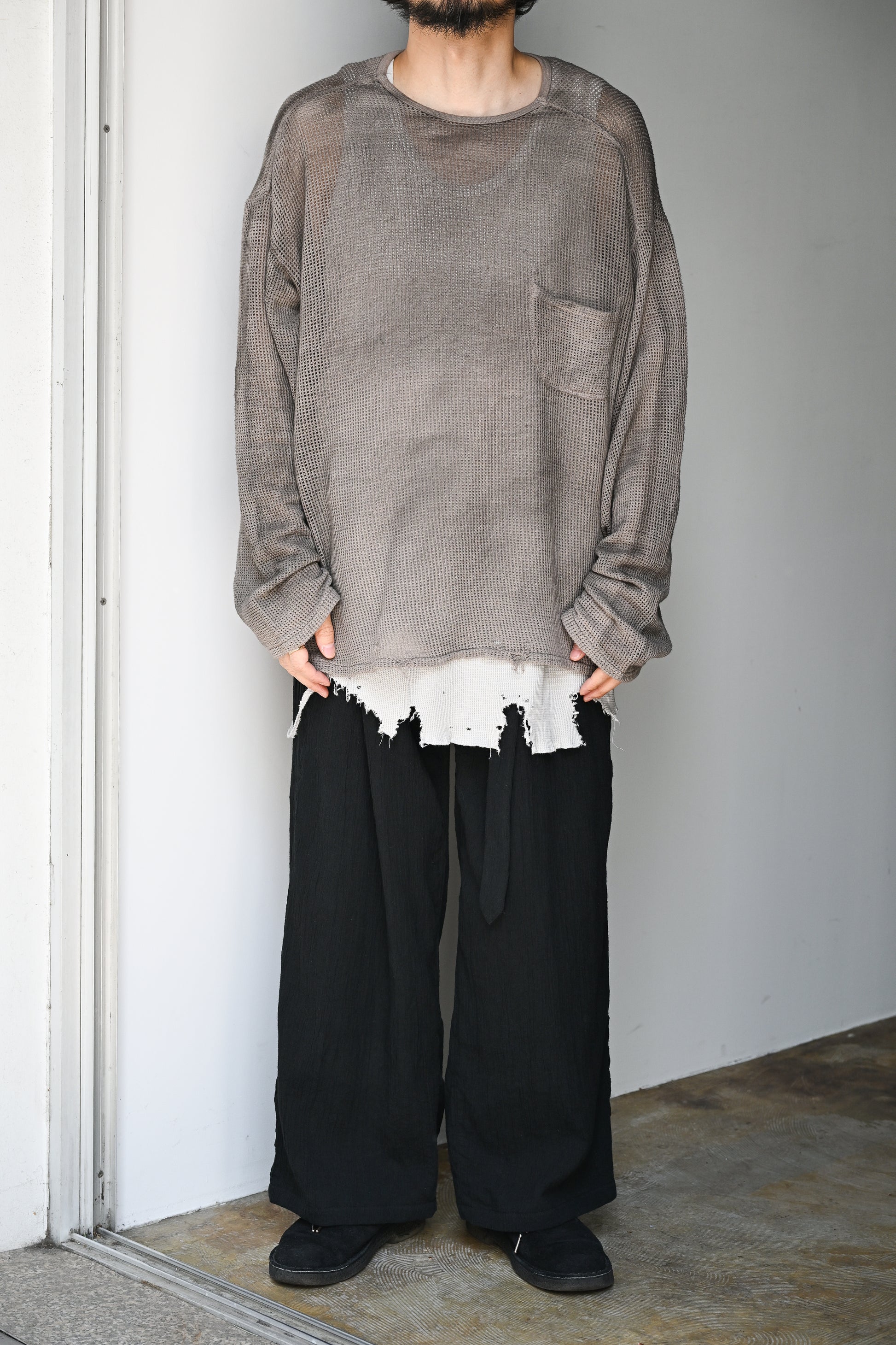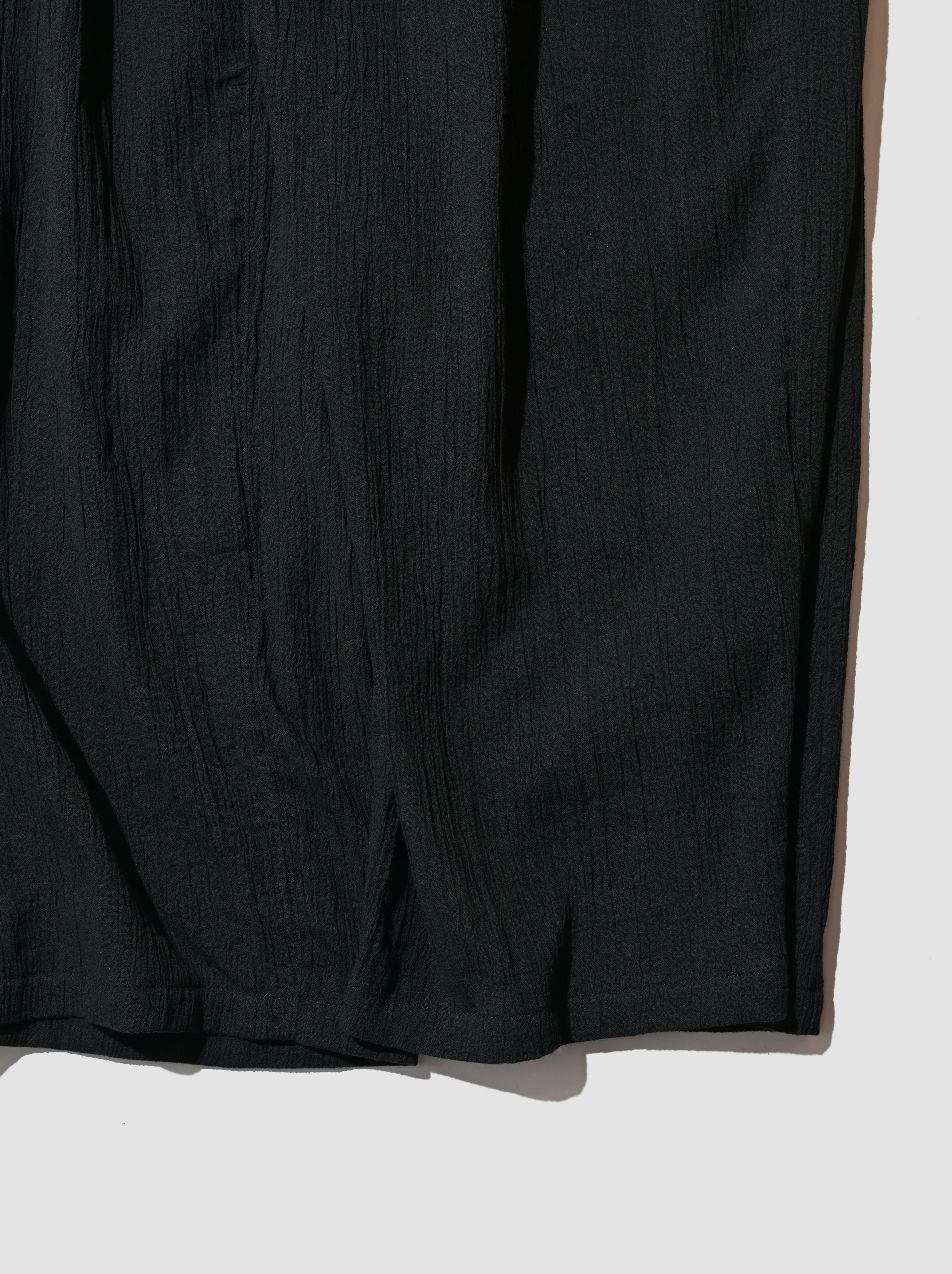ANC-SH94 CREPE HALF ZIP SHIRTと同素材となるこちらは独特なシボが特徴のクレープ素材。以前にもお伝えしていますが肌離れの良い素材なので夏場でも快適に着ていただけると思います。たっぷりと分量はとりながらも落ち間のある素材とパターンから綺麗なシルエットになっております。