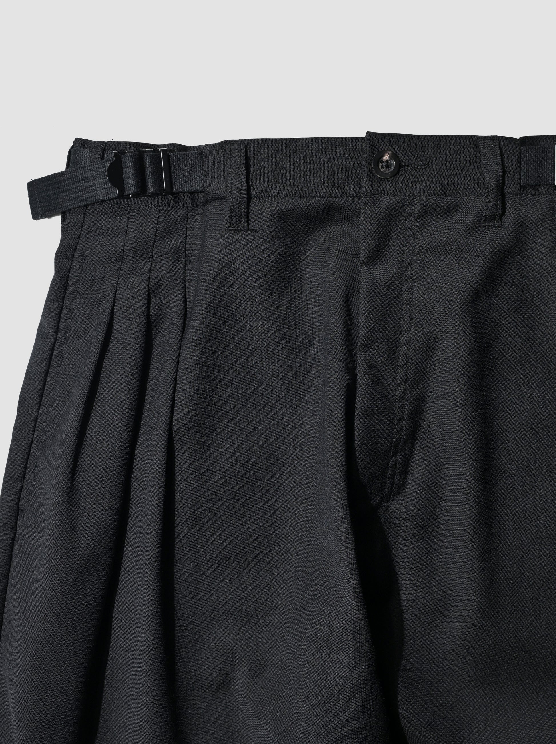 ウールをメインに3素材がミックスしたスラックス。言うまでもなく軽くて着心地は良しです。綺麗な見え方のする素材とシルエットながらも広めのタックとドレープがリラックスした雰囲気を醸し出します。ウエストの左右のアジャスターが何より着脱が楽ちん。気付いたら穿いてしまうスラックスです。