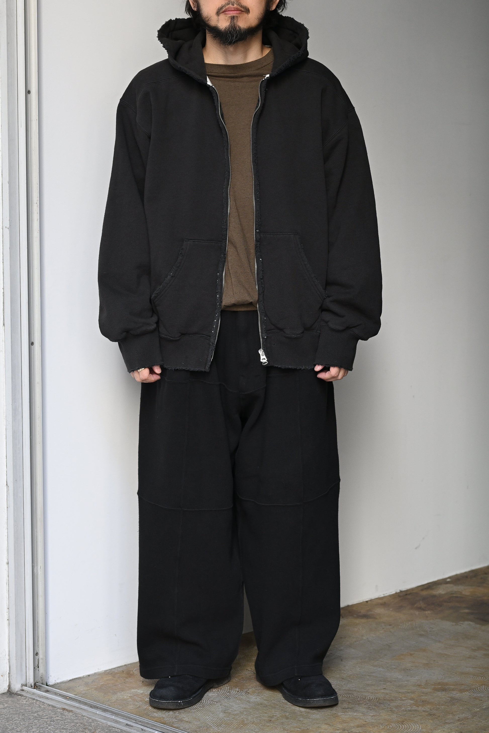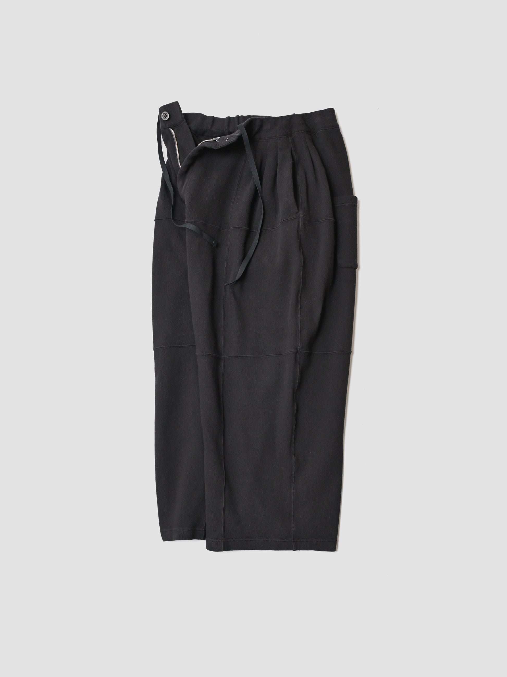 サイズは大きくゆったりとした膨らみのあるこちらのパンツは立体的な表情となるようパネルで切り替え。素材は肌着などで使われるスムースニットを太番手に改良。スウェットのような雰囲気ながらも、生地の落ち感と上記シルエットから履き心地の良さは言うもまでもなく快適です。REDの色味で楽しむも良し、ゆったりと広がるシルエットで楽しむか。スタイルを組むのも楽しみな一本です。