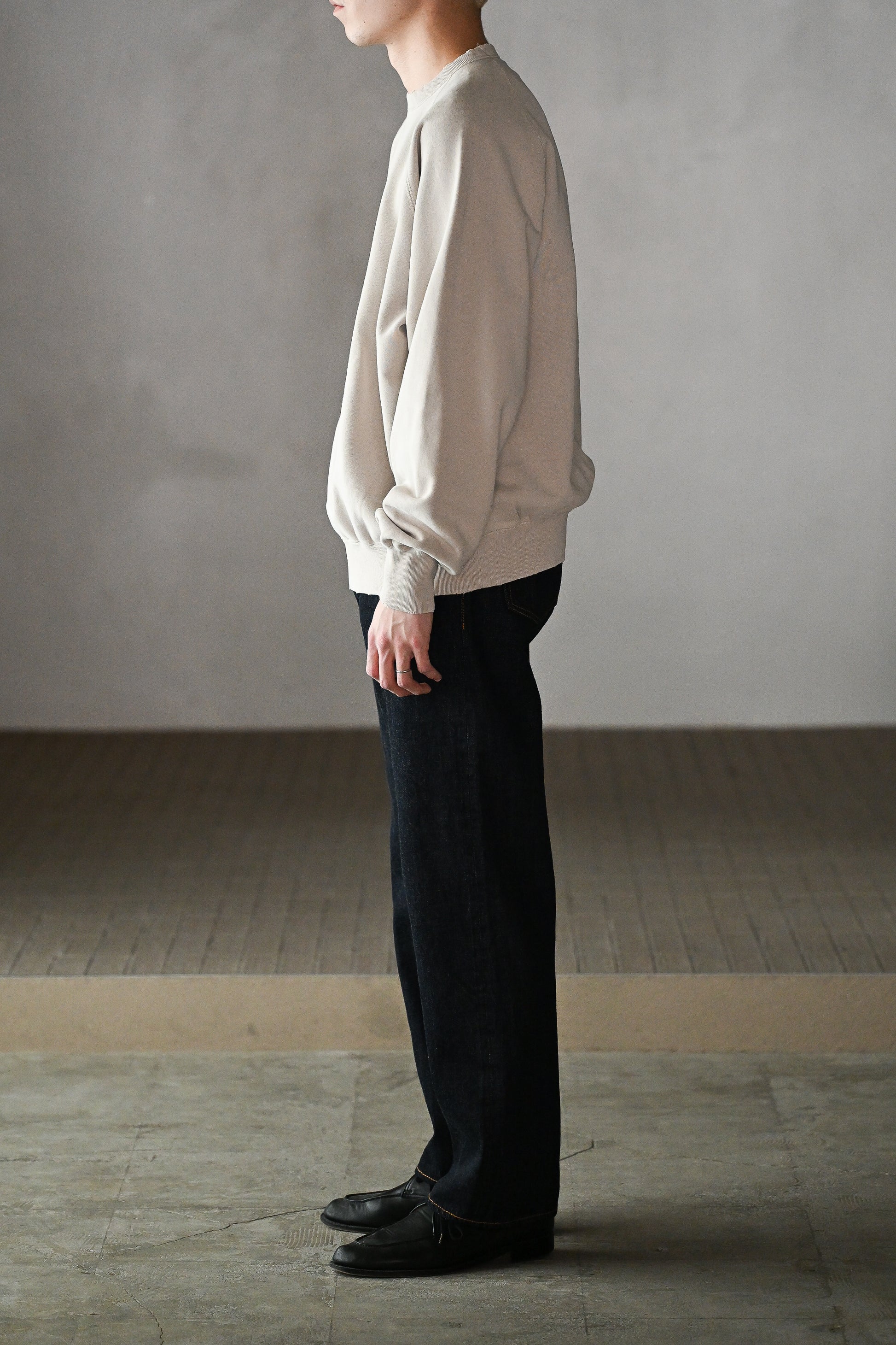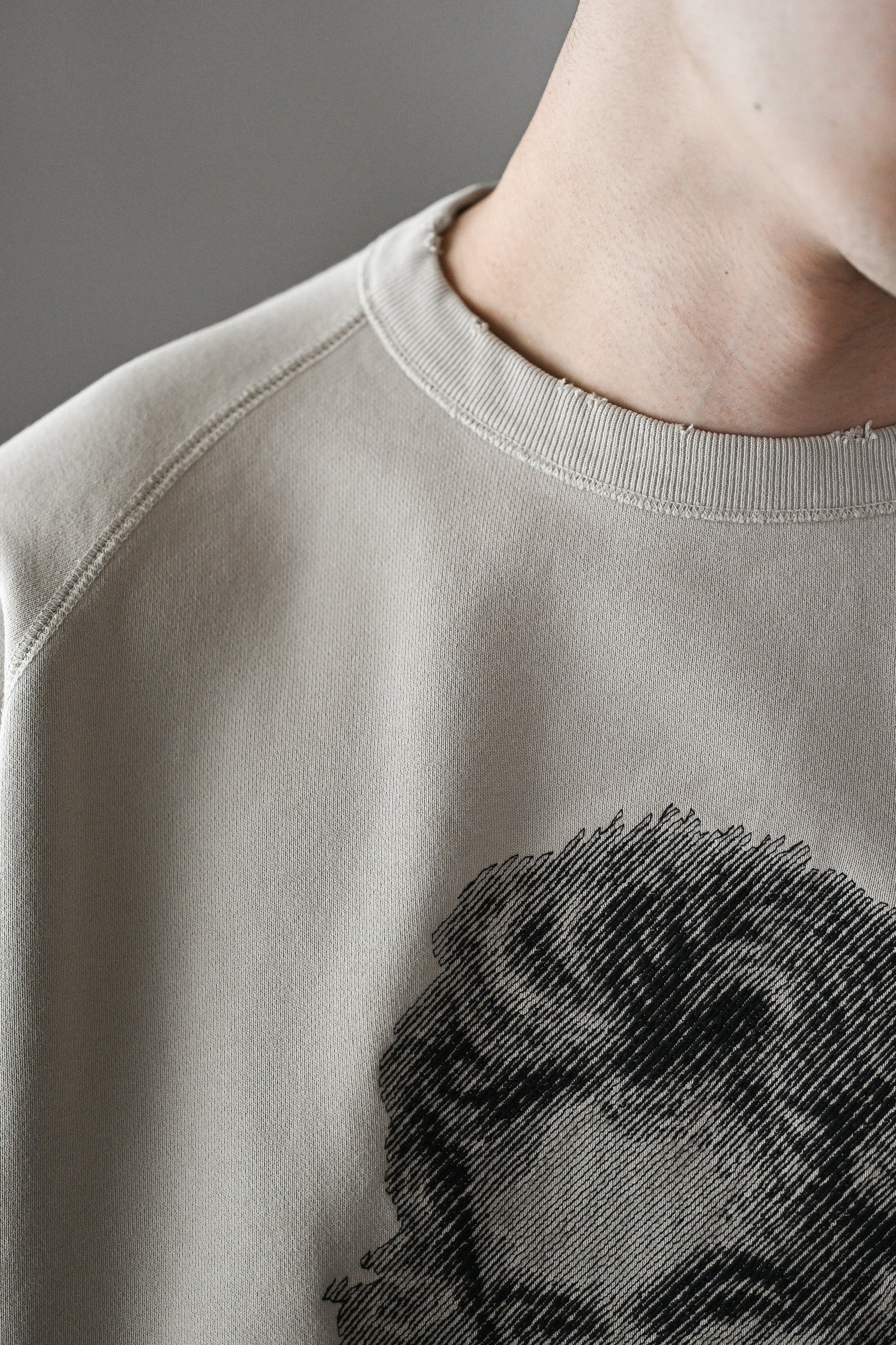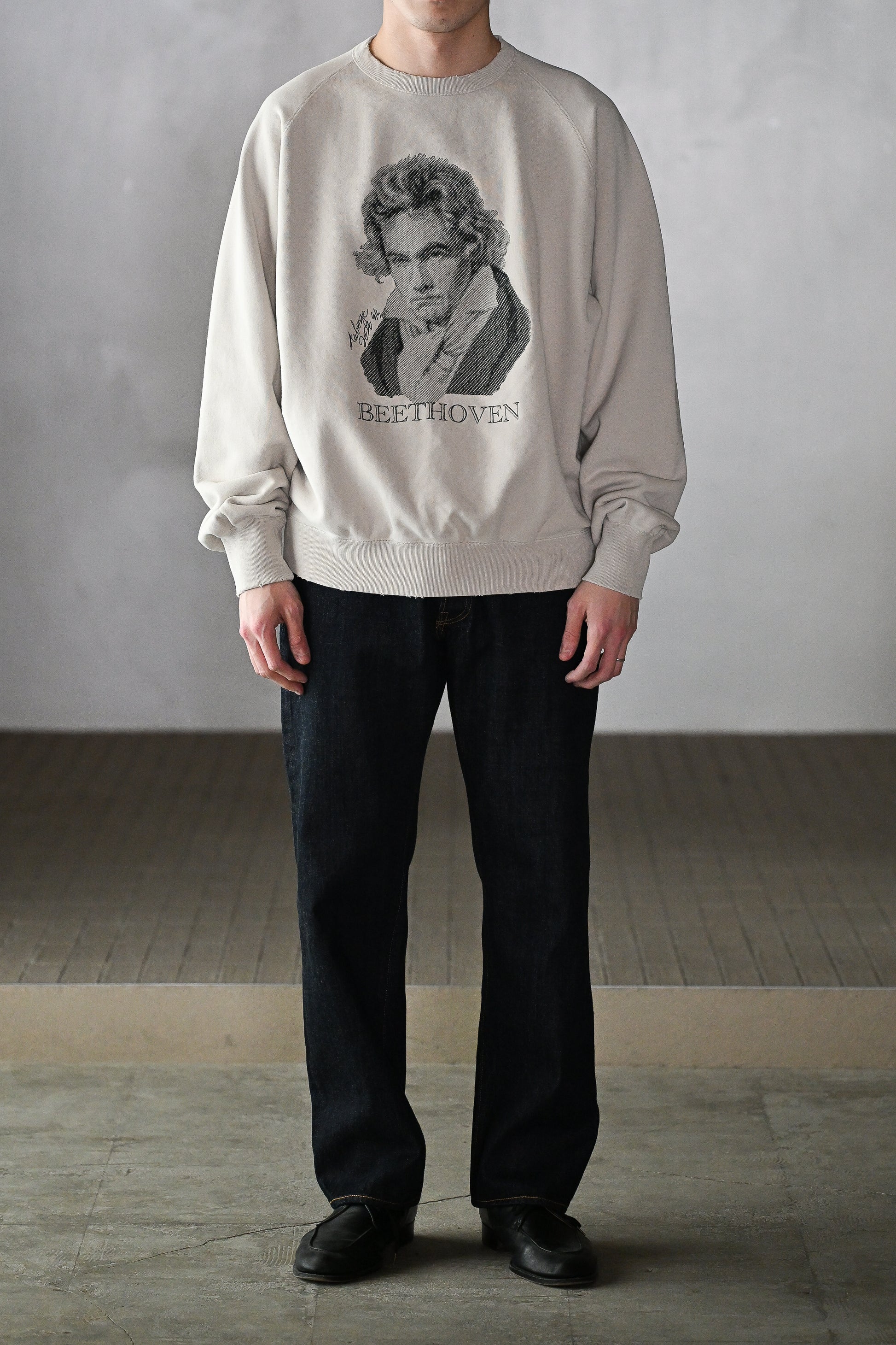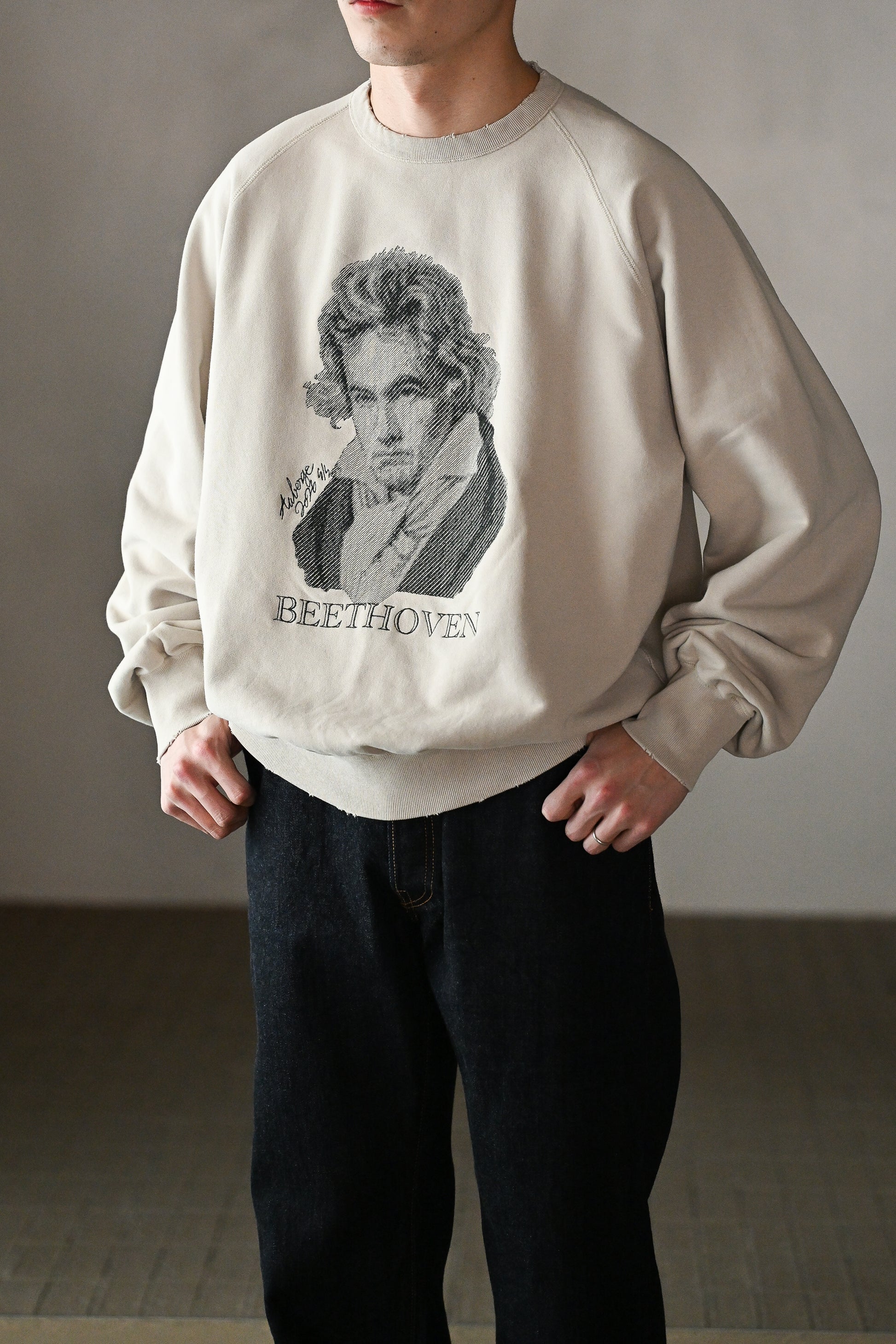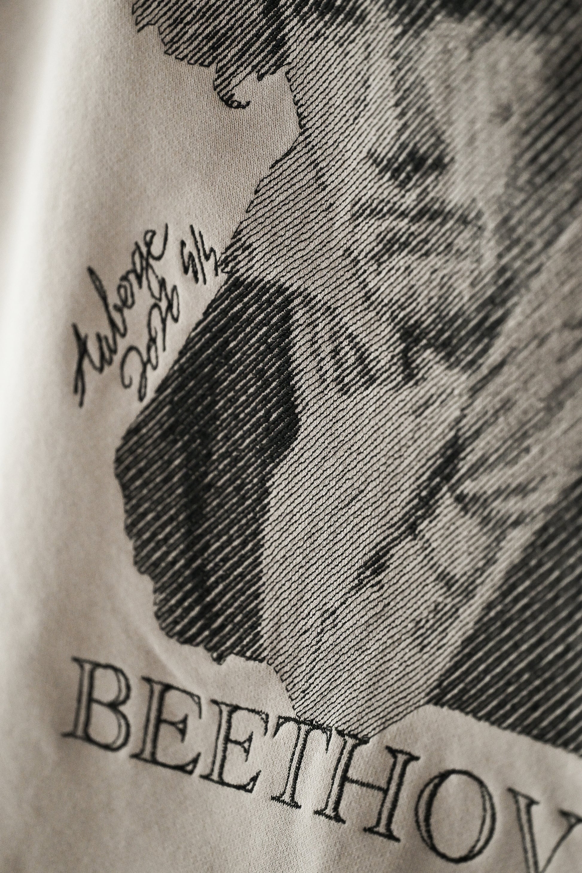 胸元に配されたベートーヴェンのモチーフがキャッチーな遊び心を感じるスウェット。一見プリントのようにも見える表現ですが、実は刺繍によるものです。写真画像を地震計の針のような細かな動きのステッチで描き出す、桐生の刺繍工場による高度な技術による再現されています。繊細な糸の重なりで表情まで描き出す見事な完成度が、レトロかつアートピースのような雰囲気に仕上げてくれます。また、このベートーヴェンのモチーフは単なるイメージにとどまらず、正式にプロダクトライセンスを取得した上で使用されたものらしく、数多のブランドが同モチーフをプリントで表現してきた中で、容易ではなくとも、面白い方向へモノ作りのタクトを振る、AUBERGE節を感じた一点です。生地はヴィンテージを目指し編み立てたシンカー編みの裏毛。裏ループがしっかりと立つように設計されており、吊り編み裏毛を思わせる、ふっくらとした風合いと奥行きのある表情をお楽しみ頂けます。それらムードと背景ですので、弊店ではニュークラシックと捉え、サイズも今の洋服らしく大きめのご用意としてみました。大真面目に遊んでみて下さい。