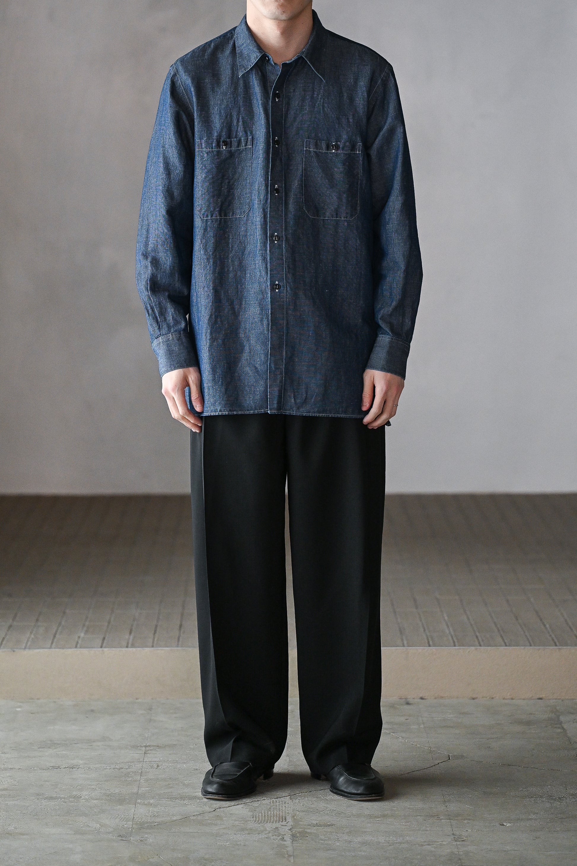 リネンを得意とする機屋にて作成されたインディゴ染料で染めたタテ糸コットンに、ナチュラルカラーのリネンをヨコ糸に打ち込んだタンガリー。リネンの膨らみと光沢感が上品な面です。裾はスクエア型のミリタリーシャツベースのデザインに落とし込み、カジュアル過ぎずに着られるようにしています。