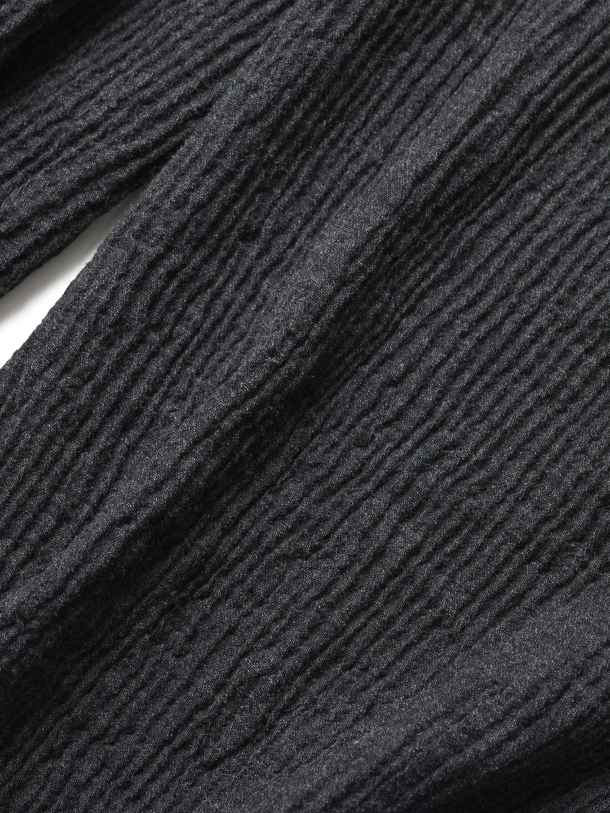 ウールのリバー、おそらく世界で初となる、リバーの製品縮絨とのこと。それ用にオリジナルの生地を製作し、縫製後、加工が施されています。素材の良さを生かすため、リバー縫製で裏をつけずに軽く仕上げ、縮絨による生地の持つストレッチ性も伴い快適な着心地が実現されました。国内職人による手まつり仕立て、工程のほとんどが手縫いです。